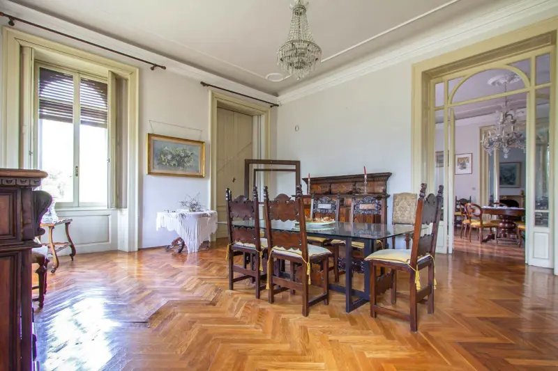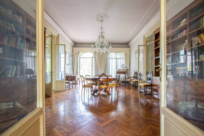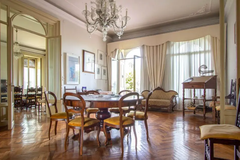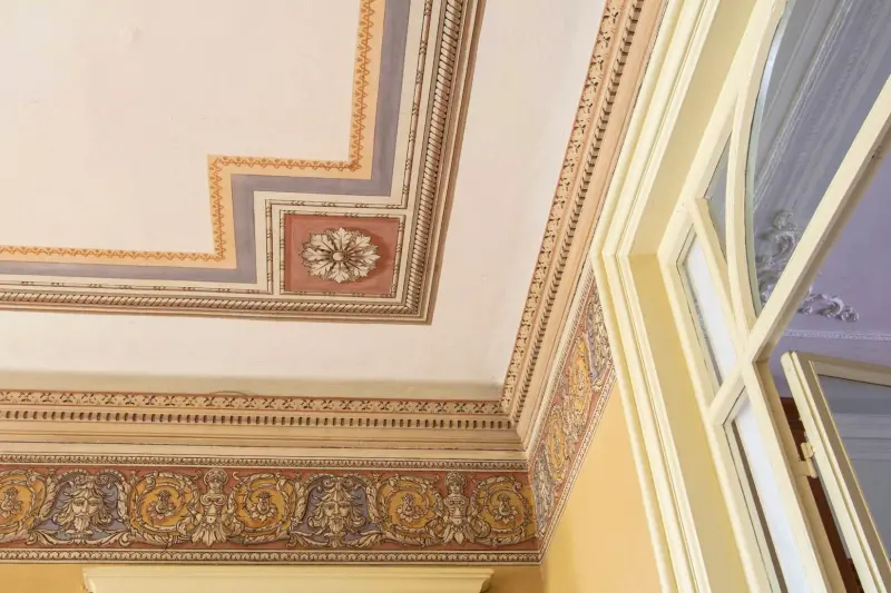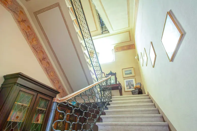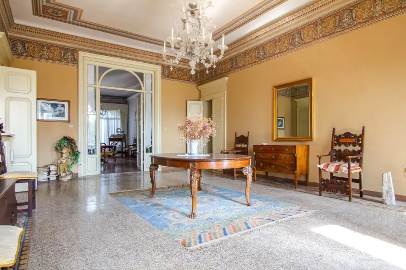 تتبع المساحات الداخلية الطراز الفينيسي الكلاسيكي مع صالون مركزي تتوزع حوله بقية الغرف.