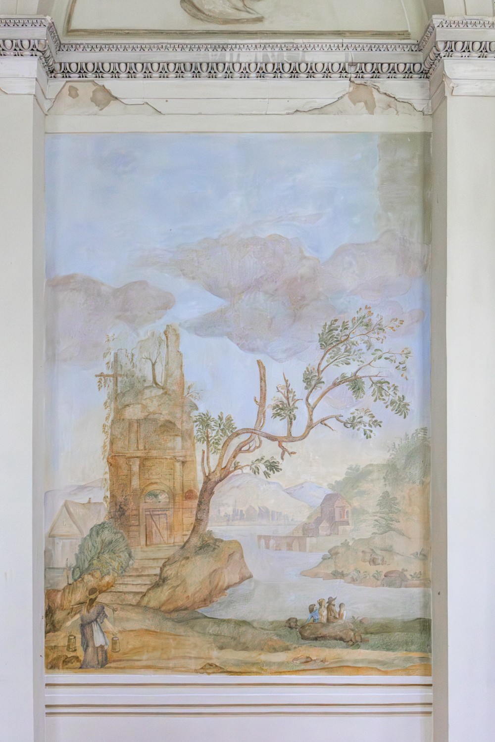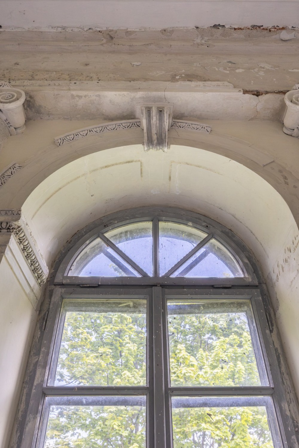 Indgangsområdet fører ind til et rummeligt rumforløb. I stueetagen lå opholdsrum og en spisestue med al fresco-malerier, der viser udsigter over den warszawske Łazienki park og et monument for kong Jan III Sobieski. Freskerne er i dag kun svagt bevaret, men kan restaureres af specialiserede kunstrestauratorer.