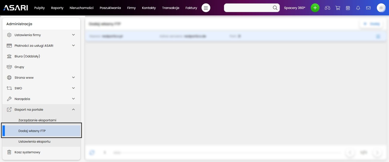 - Przejdź do sekcji "Eksport na portale" w lewym menu i kliknij "Dodaj własny FTP".