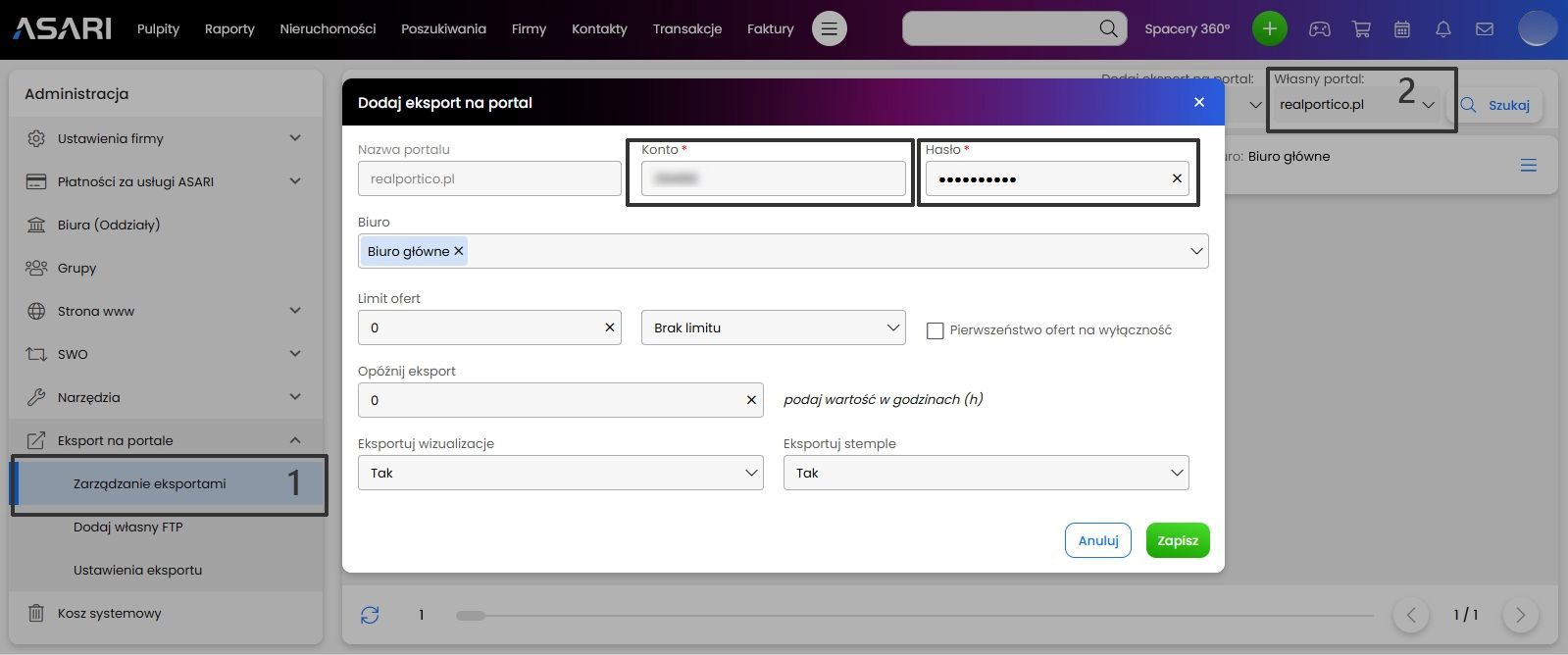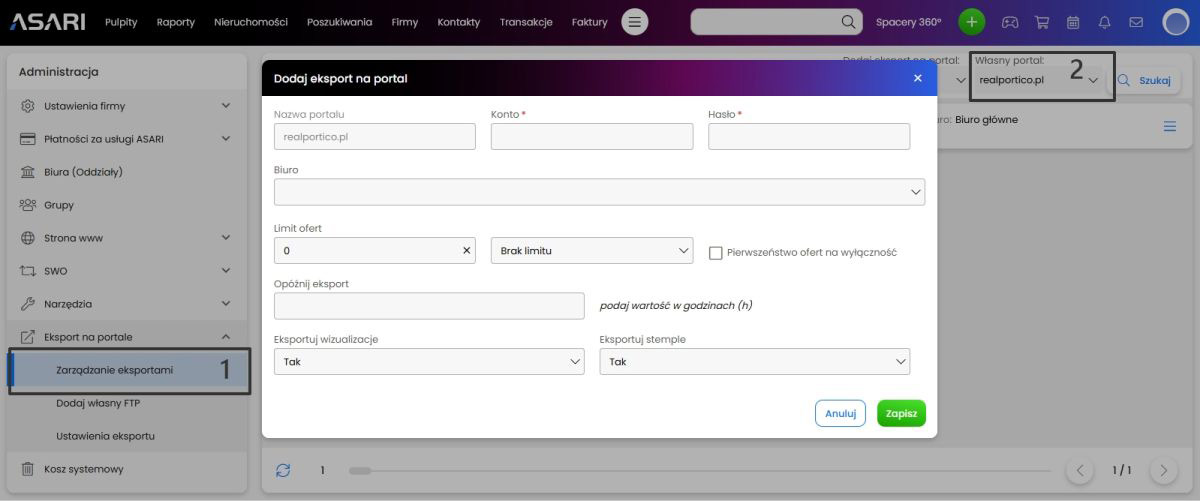 - Wybierz w lewym menu opcję "Zarządzanie eksportami" (1) i następnie kliknij w prawym górnym rogu pole "Własny portal" (2). Wybierz tam wcześniej utworzony portal "realportico.pl". Otworzy się następujące okno dialogowe: