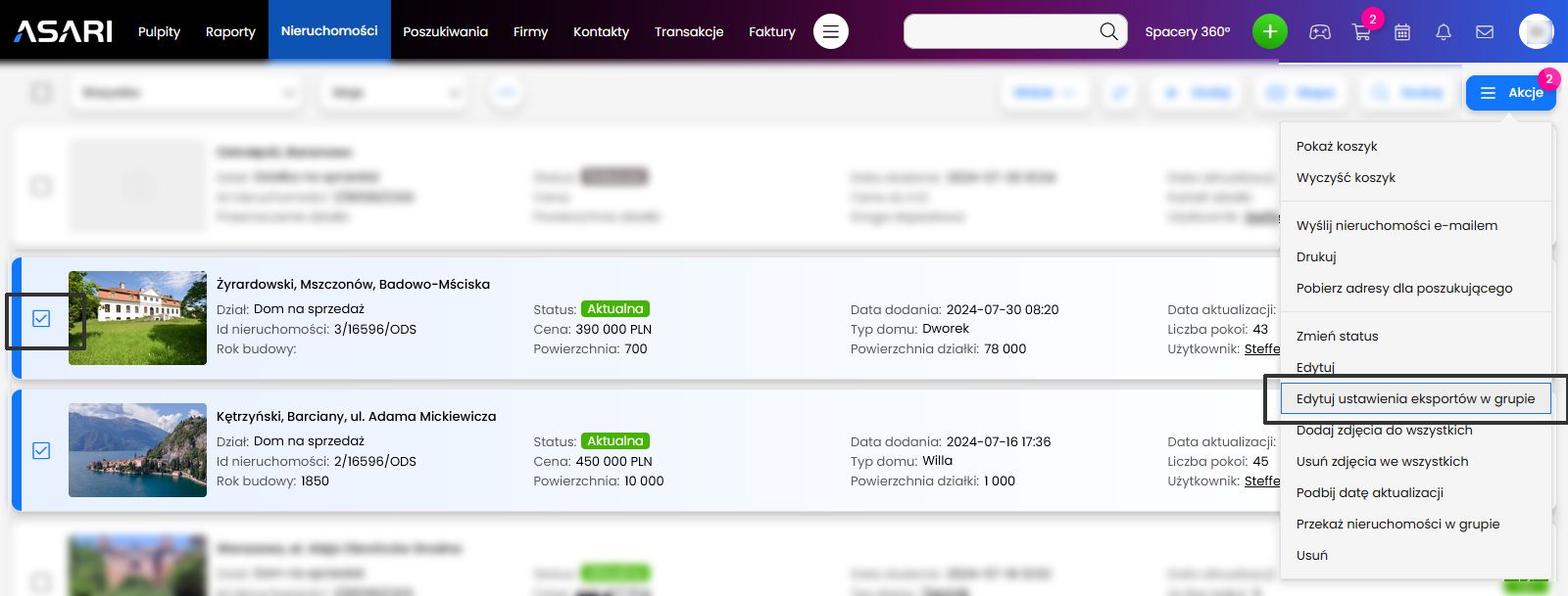 - Ustawienia do transmisji FTP nieruchomości zostały zakończone. Teraz przejdź w programie do sekcji "Nieruchomości" w głównym menu na górze. Wybierz odpowiednie nieruchomości, które mają pojawić się na realportico.pl, a następnie kliknij po prawej stronie w "Akcje" na "Edytuj ustawienia eksportów w grupie".