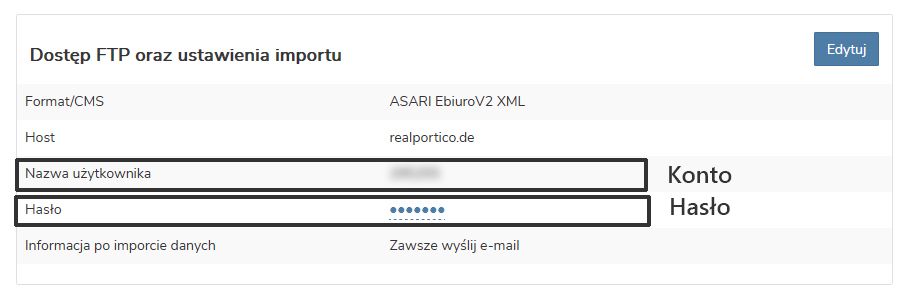 - Wprowadź teraz dane dostępowe do serwera FTP REALPORTICO. Znajdziesz je w swoim