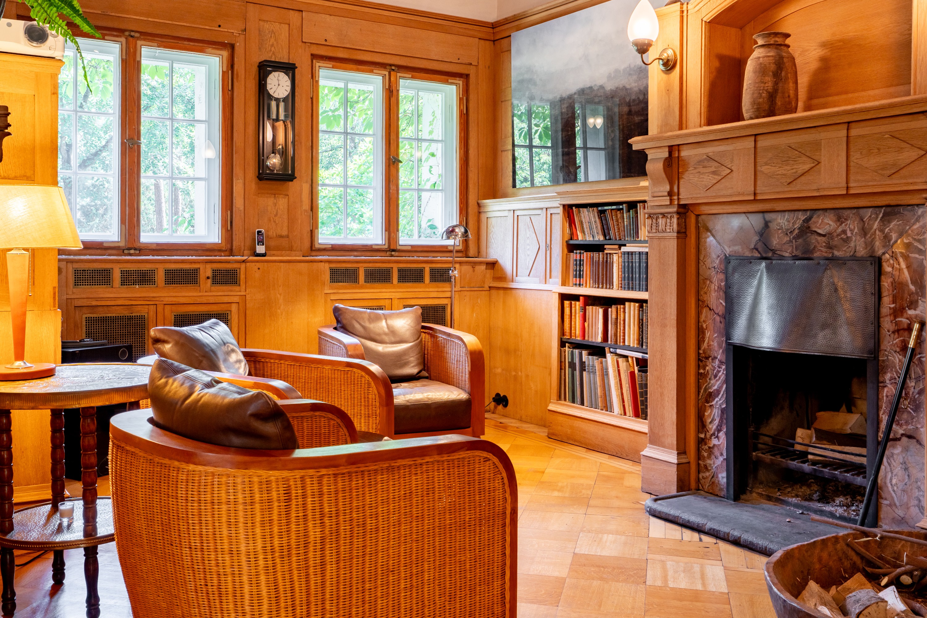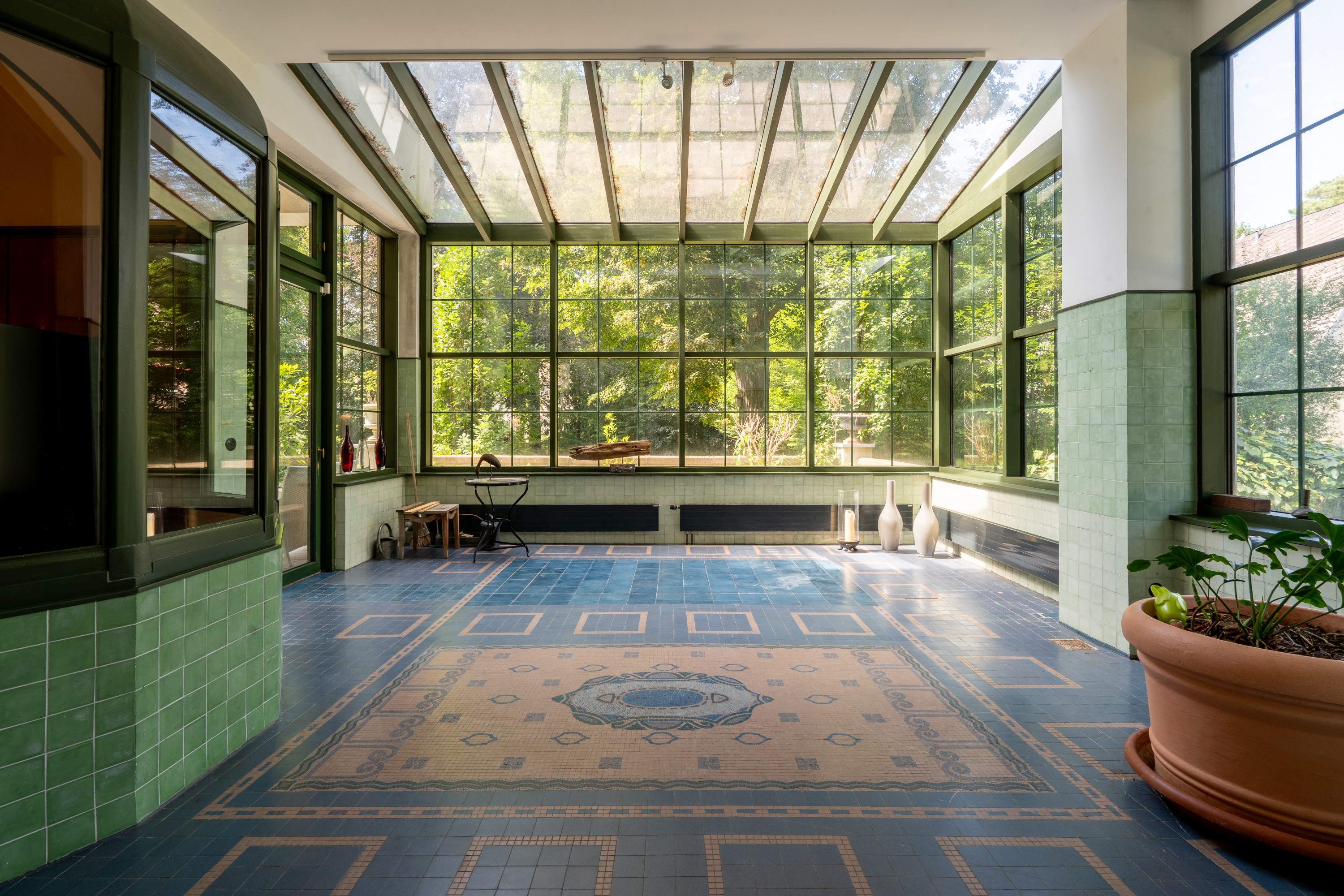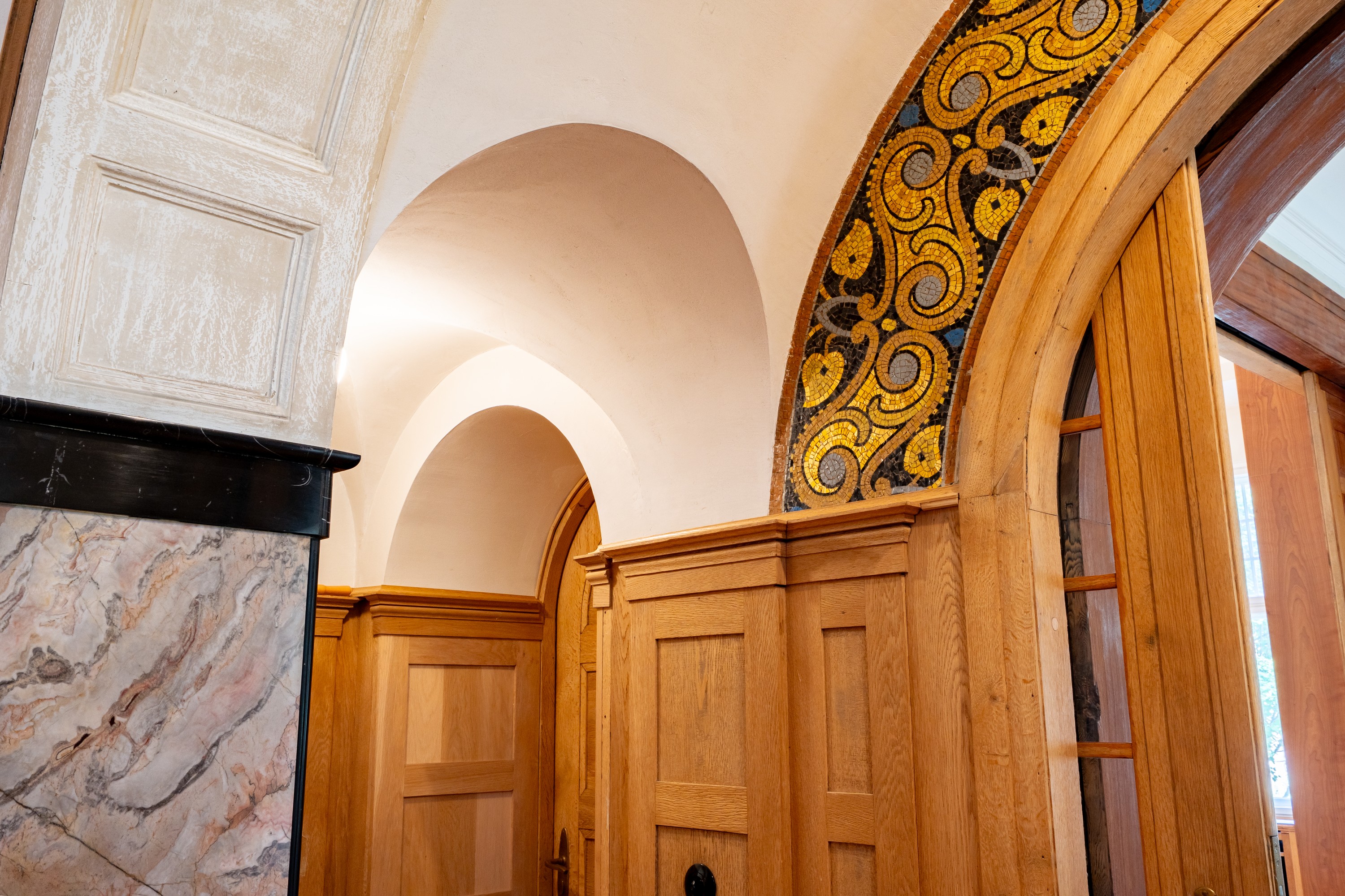 From the entrance, it is clear that this is no ordinary house: a two-story hall with a surrounding gallery, artistic stained glass, and hand-carved balusters welcomes residents and guests with festive grandeur. The enfilade of salon, library, and dining room opens through tall double doors to the garden – spaces designed as well for social gatherings as for private family life. Original details such as coffered ceilings, stucco marble, historic parquet floors, and a conservatory with ornamental mosaic flooring testify to masterful craftsmanship.