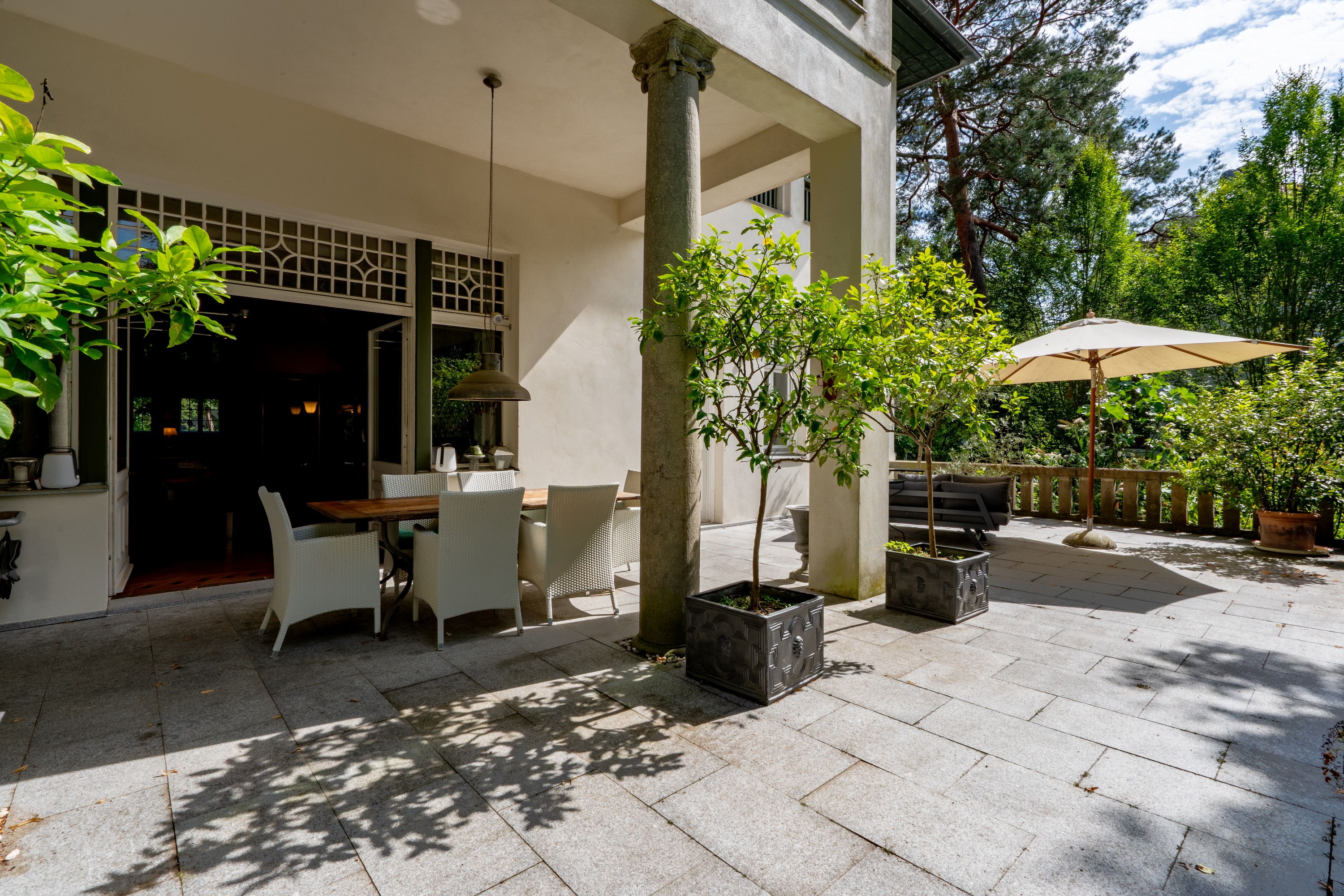 The villa is framed by a protected garden: natural stone paths, mature trees, and a historic wall fountain with a faun mask create an atmosphere that is at once grand and peacefully secluded. Wide terraces, a belvedere, and multiple loggias and balconies harmoniously connect the house and nature.