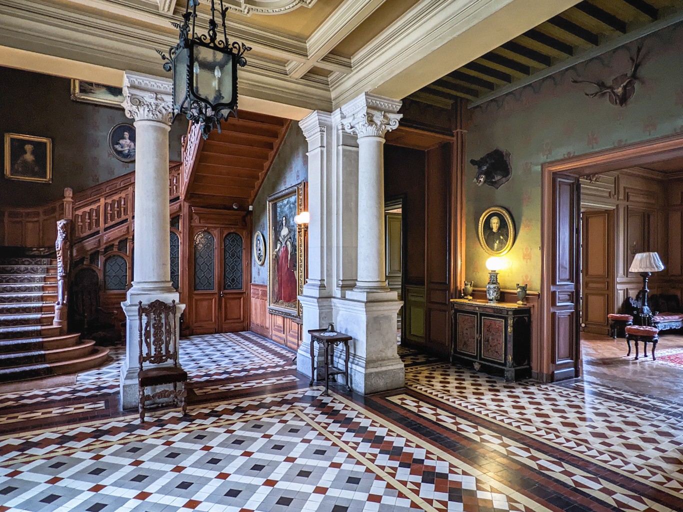 The entrance hall in Neo-Renaissance style is particularly spectacular, adorned with columns, a grand oak staircase, and plaster ceilings. A large central corridor runs through the entire house. The central salon features beautiful woodwork, three double doors, and includes two oil paintings from 1700 depicting Bacchus and Venus. The dining room has wainscoting, a richly carved Neo-Renaissance-style fireplace, and exposed beam ceilings. The grand salon showcases carved woodwork in the style of Louis XIV, an 18th-century-style plaster ceiling, and a Louis XV-style marble fireplace. A small salon in the style of Louis XVI is decorated with woodwork and a Louis XVI-style marble fireplace.