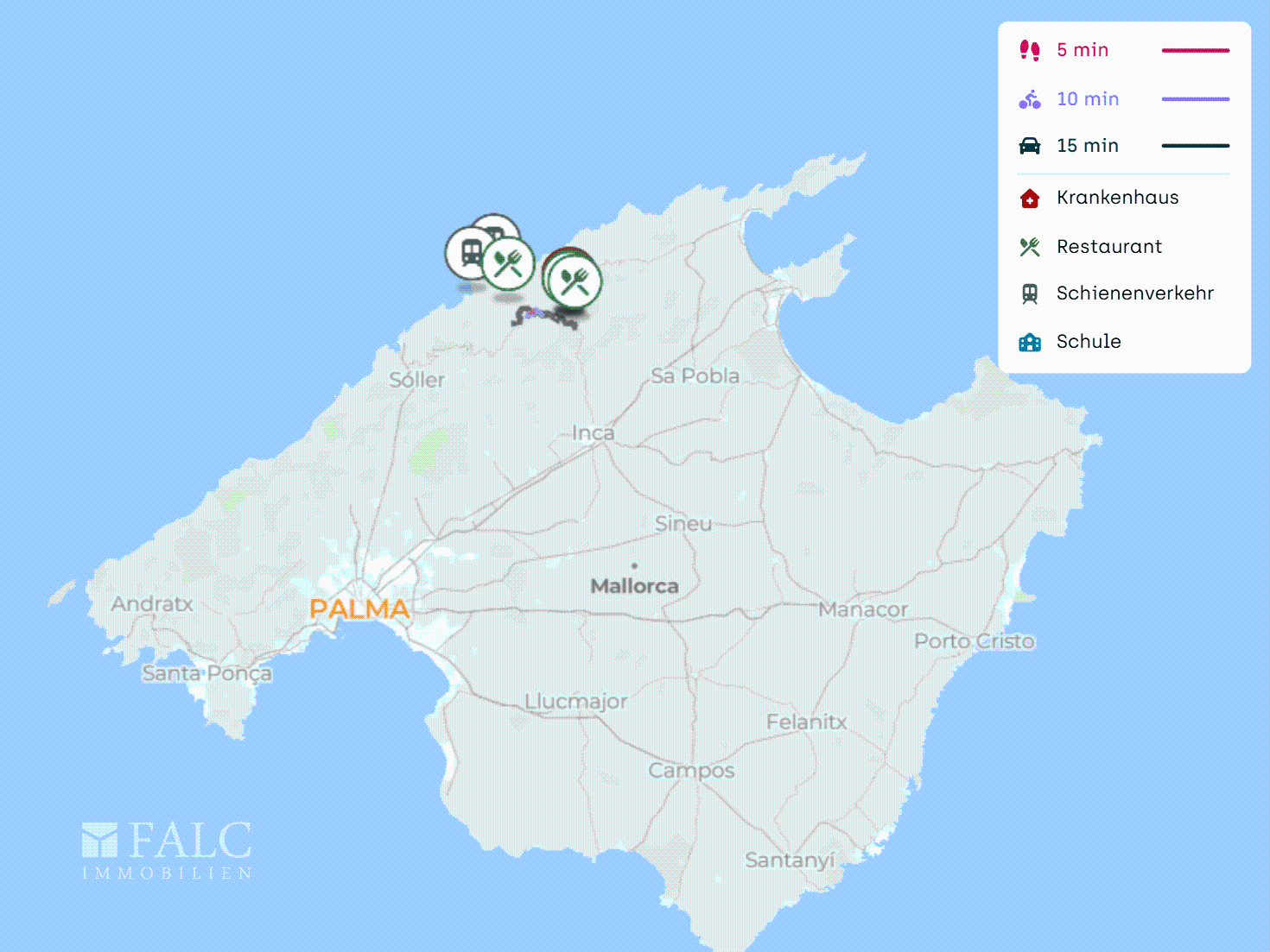 The nearest village is about a 10-minute drive away. In the vicinity of Lluc, you will find a pharmacy, a clinic, and the Escolania de Lluc for educational offerings. The natural beaches Cala Tuent and Platja del Torrent de Pareis are just a few kilometers away and rank among the most scenic coastal areas on the island. Palma de Mallorca Airport can be reached in approximately one hour, depending on the route.