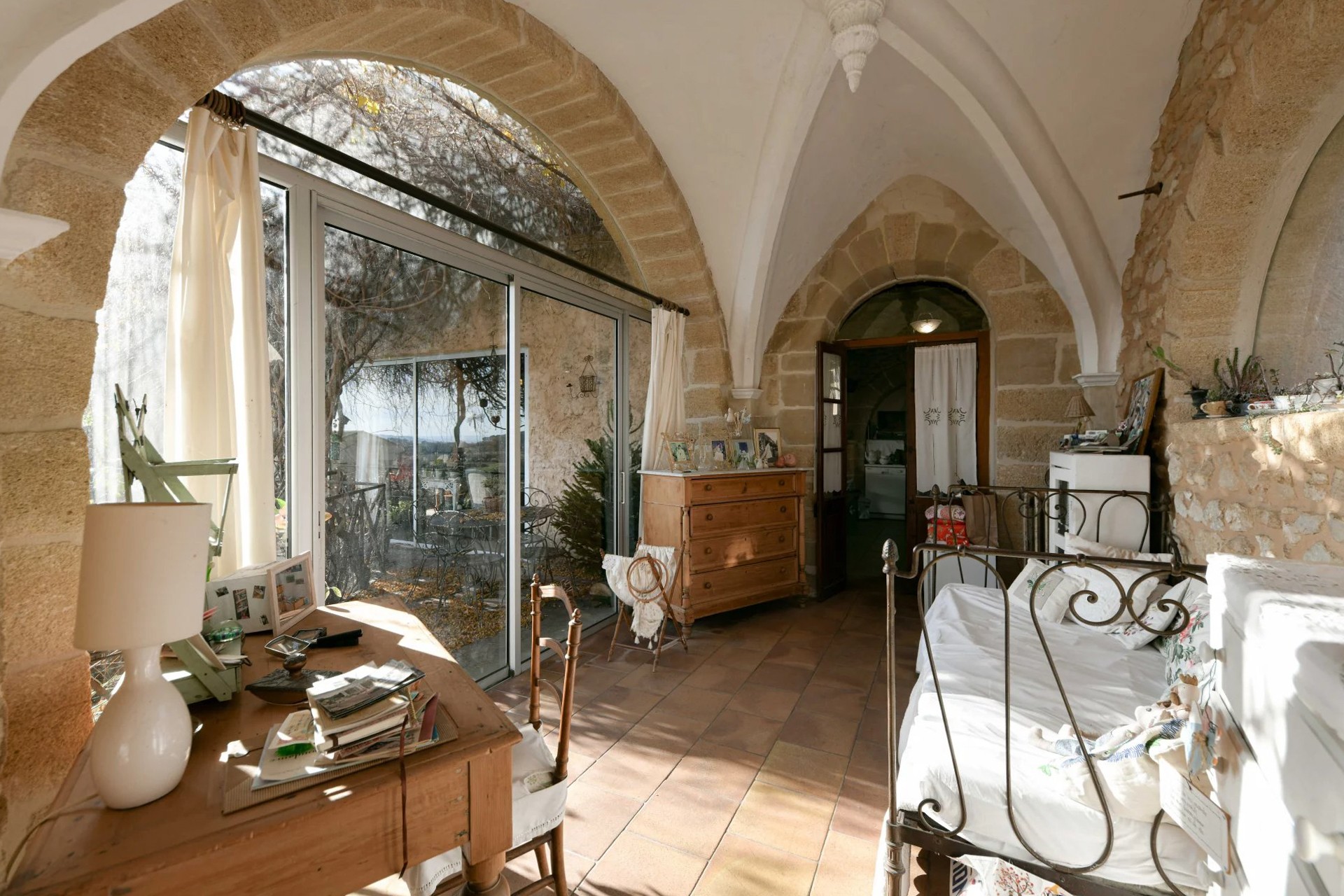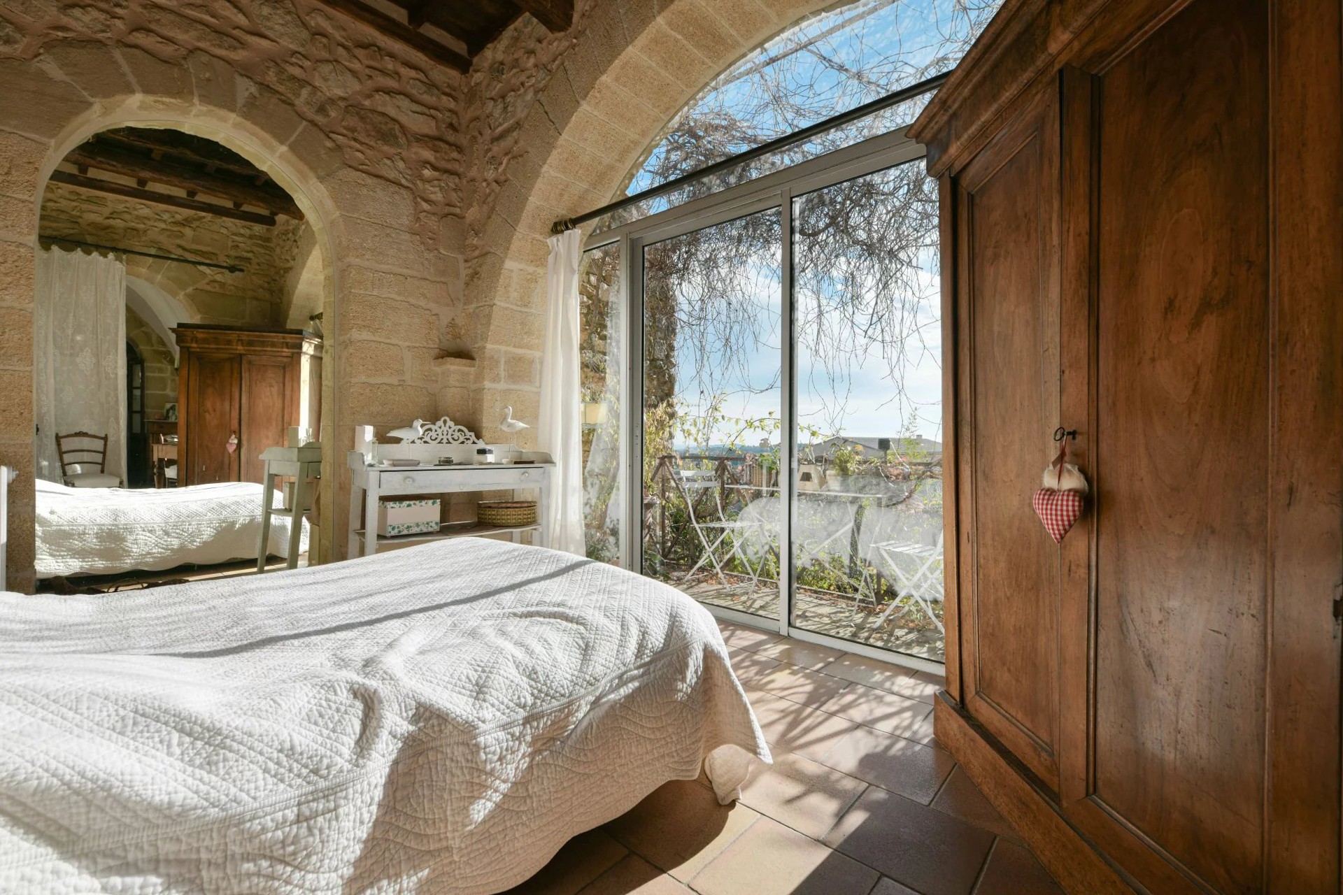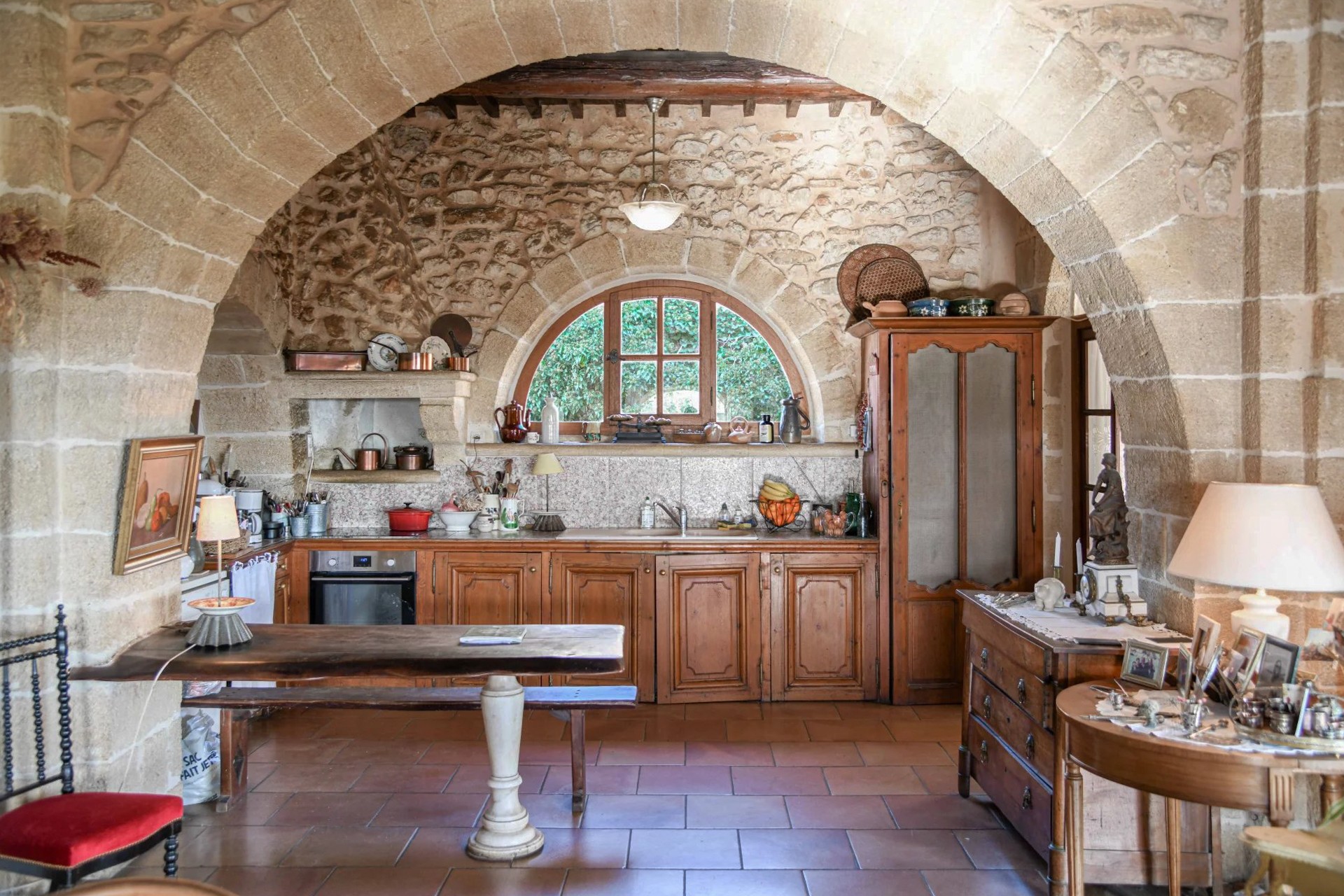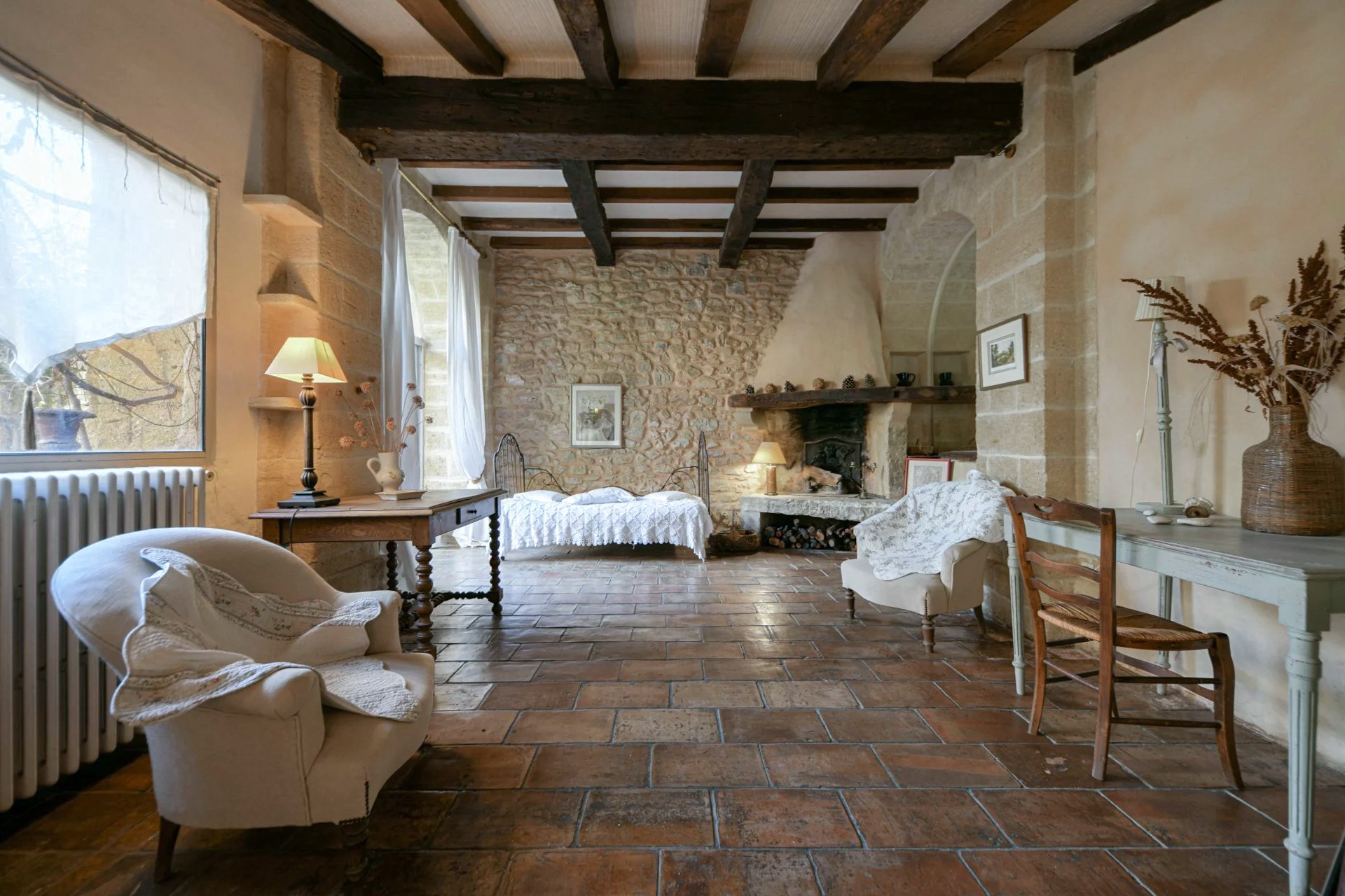 On the upper floor, accessible via a beautiful antique stone spiral staircase, there is an apartment of more than 120 m². Its highlight is a spacious living area of 80 m², comprising a living room, dining room, and open kitchen, leading to a balcony above the courtyard. This bright space, featuring French ceilings, a historic fireplace, large windows, and elegant arches, opens onto an exterior balcony.