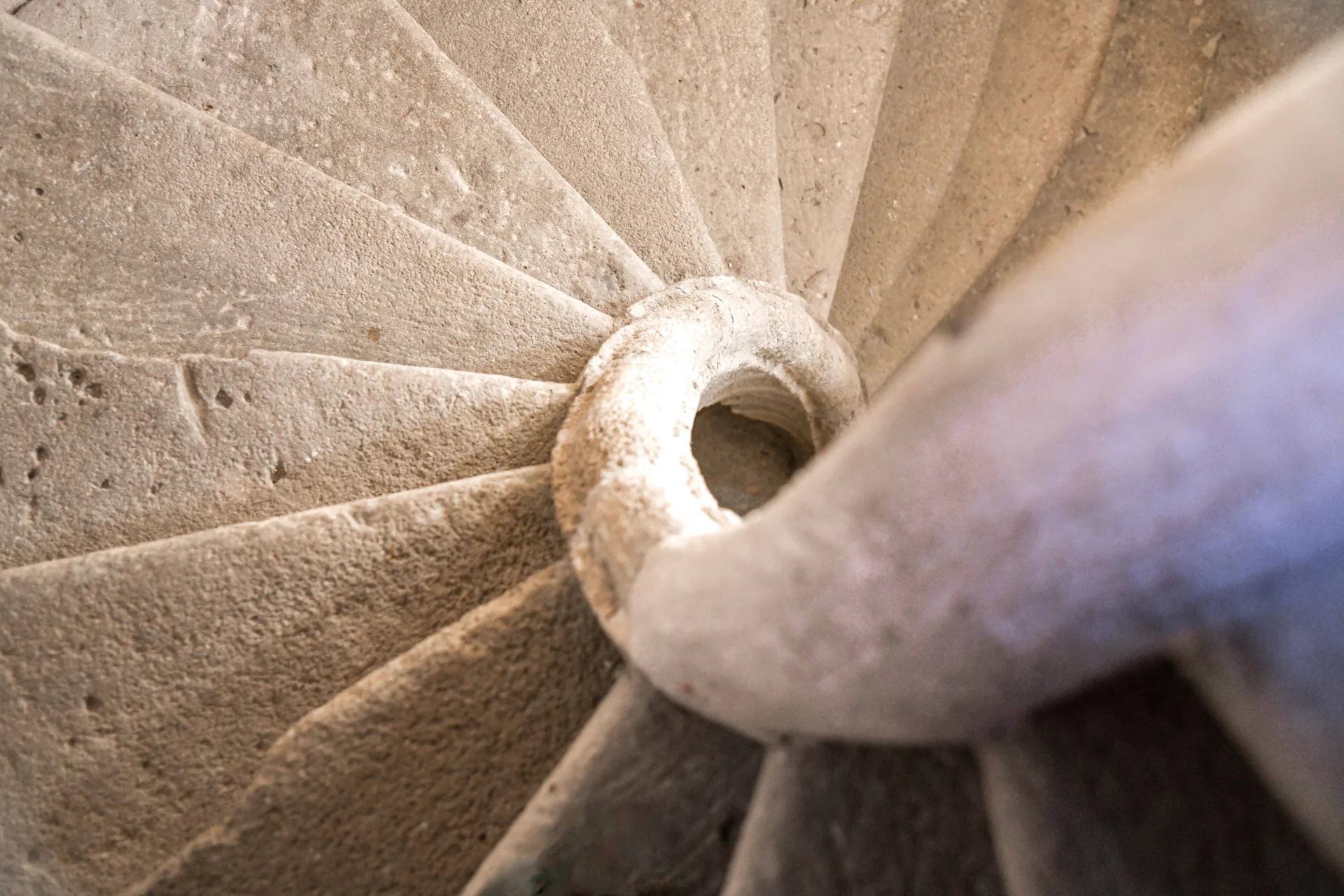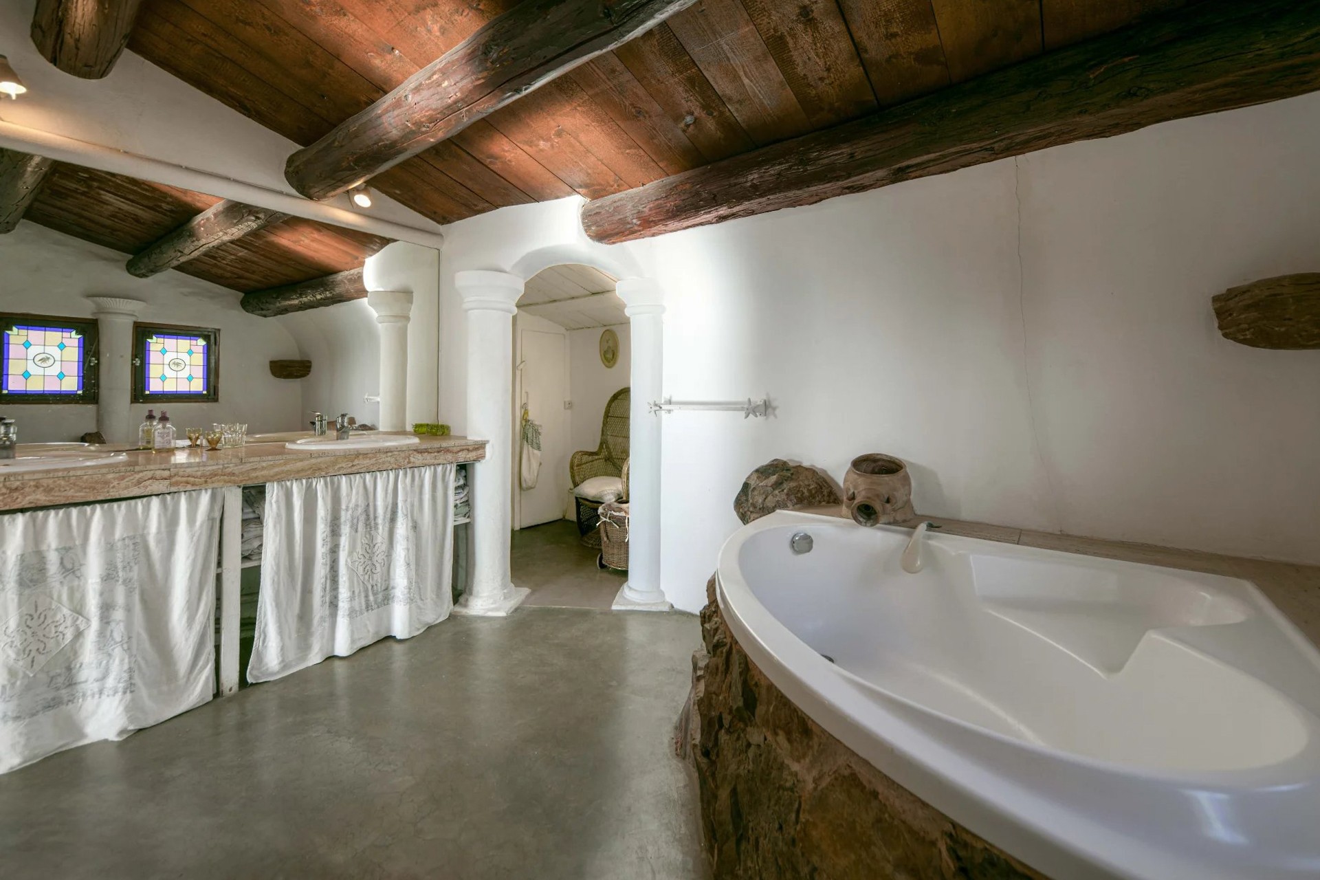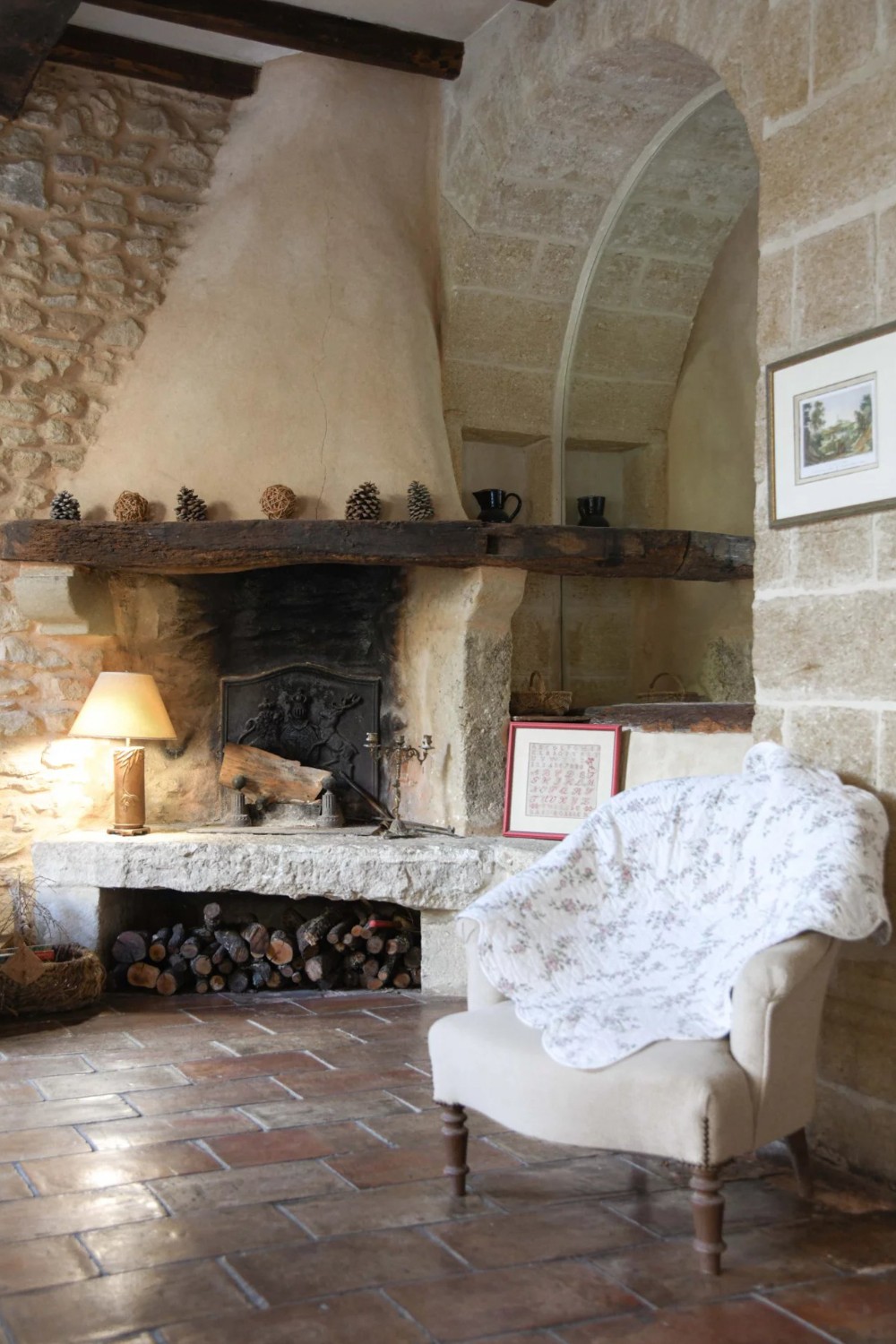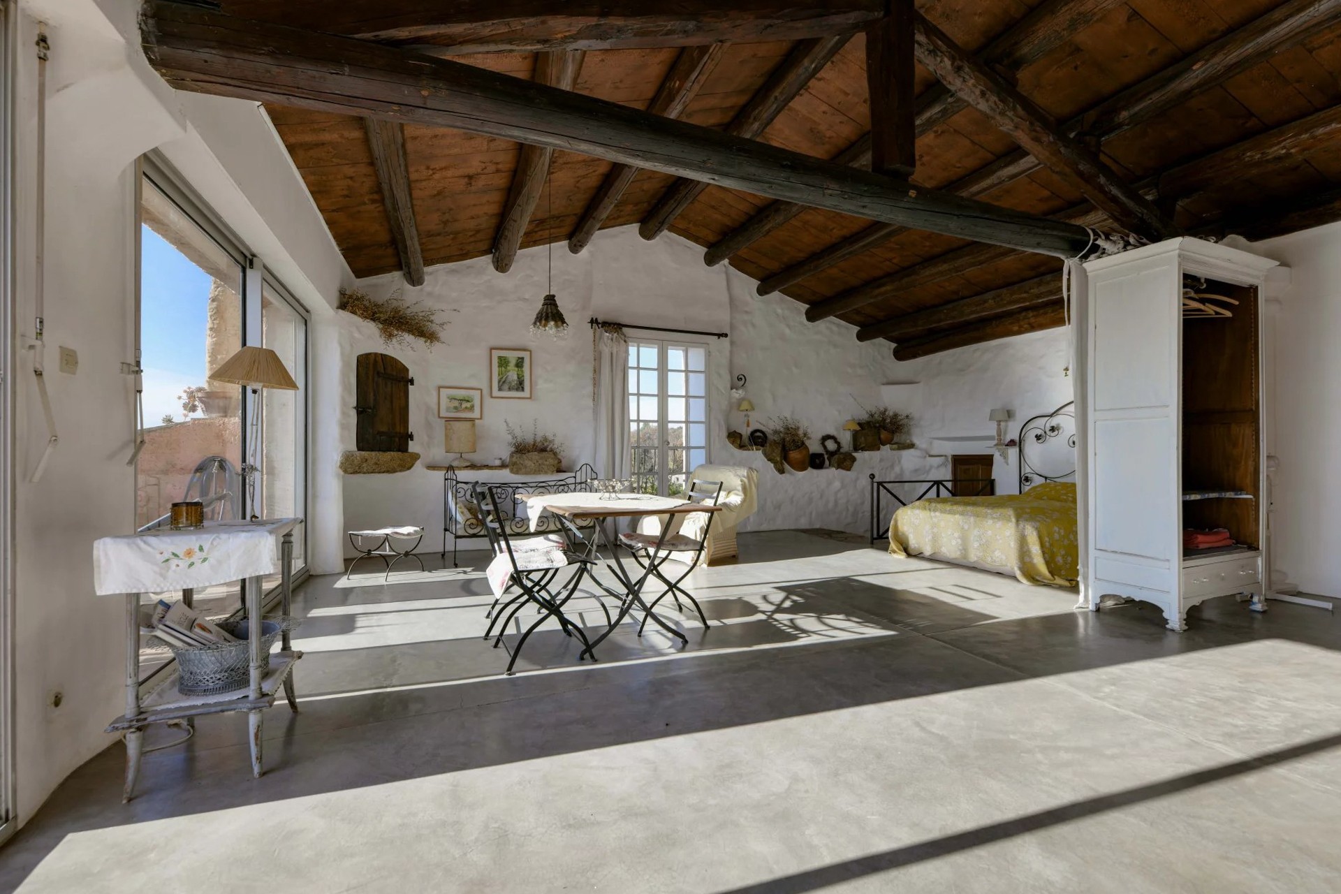 On the upper floor, accessible via a beautiful antique stone spiral staircase, there is an apartment of more than 120 m². Its highlight is a spacious living area of 80 m², comprising a living room, dining room, and open kitchen, leading to a balcony above the courtyard. This bright space, featuring French ceilings, a historic fireplace, large windows, and elegant arches, opens onto an exterior balcony.