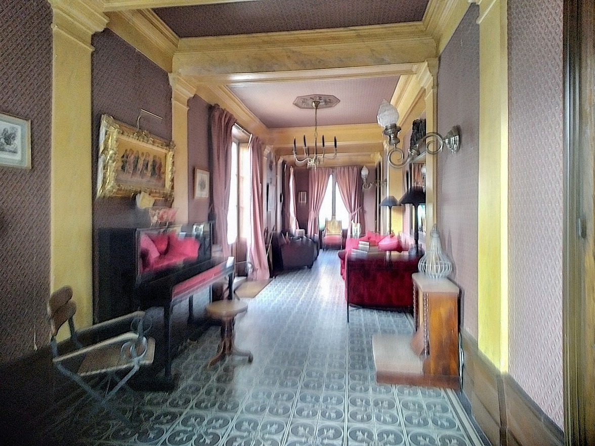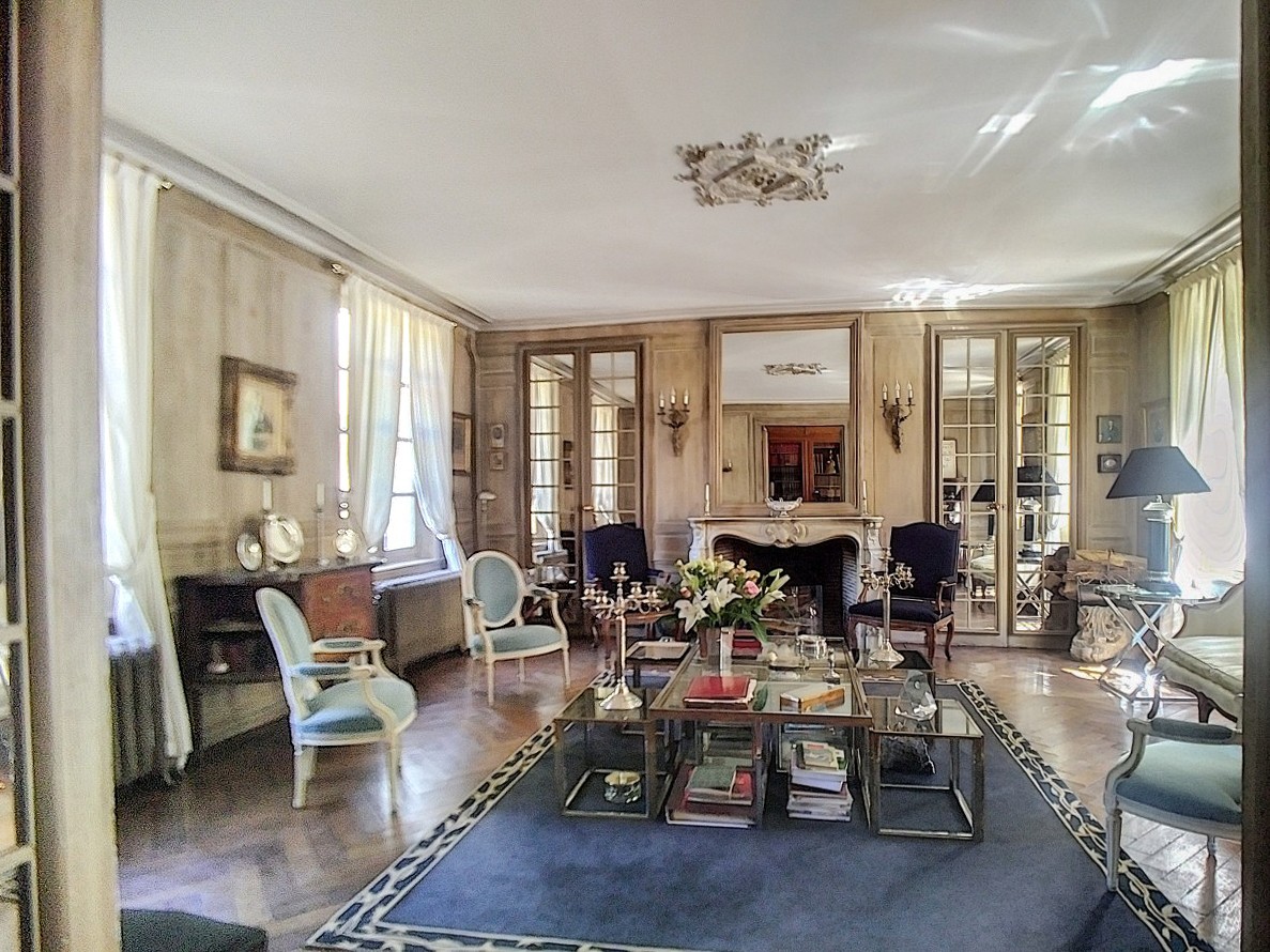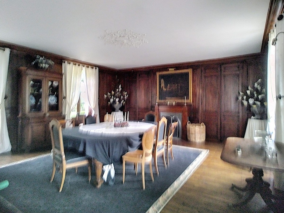 On the ground floor of the château, there is a spacious entrance hall and a corridor leading to the reception rooms: a library, a generous salon (with a marble fireplace, wood paneling, and herringbone parquet), a dining room (with a wooden fireplace, wood paneling, and parquet flooring), a large kitchen, and a laundry room with access to the rear of the property.