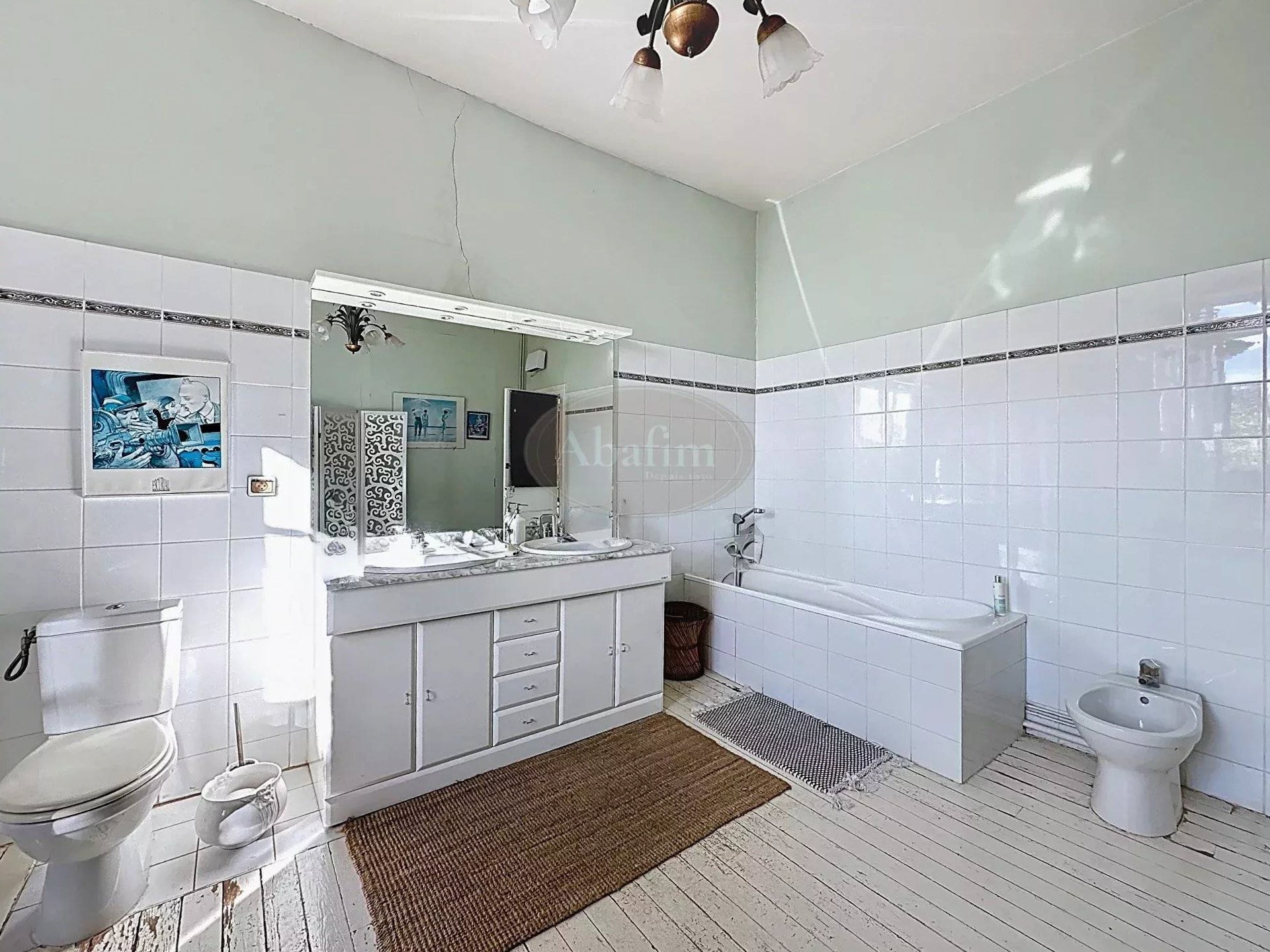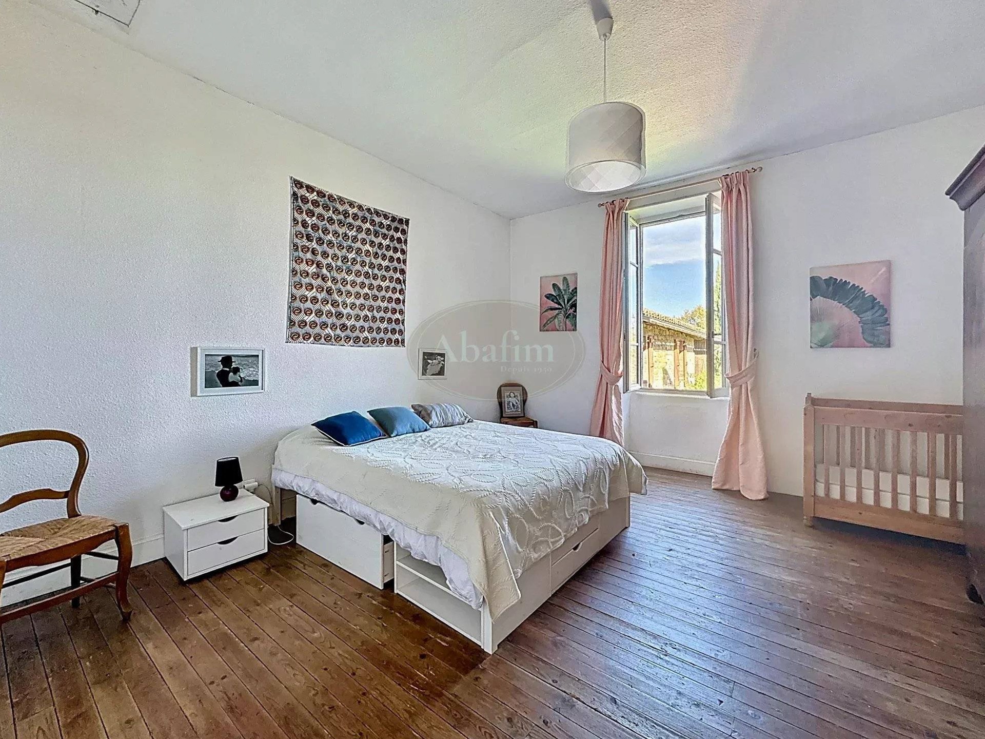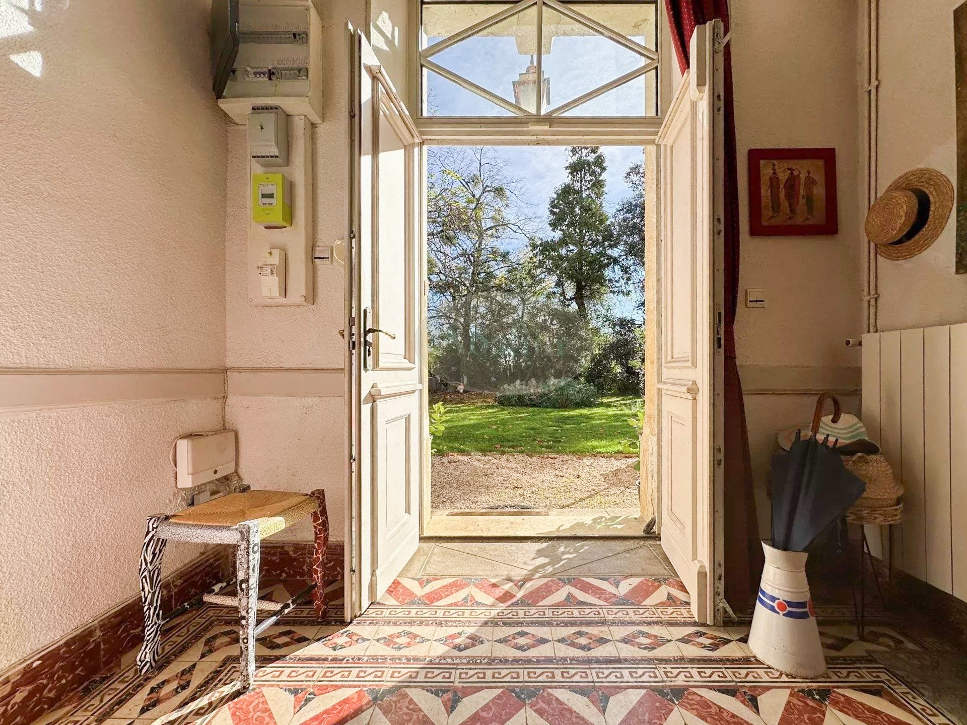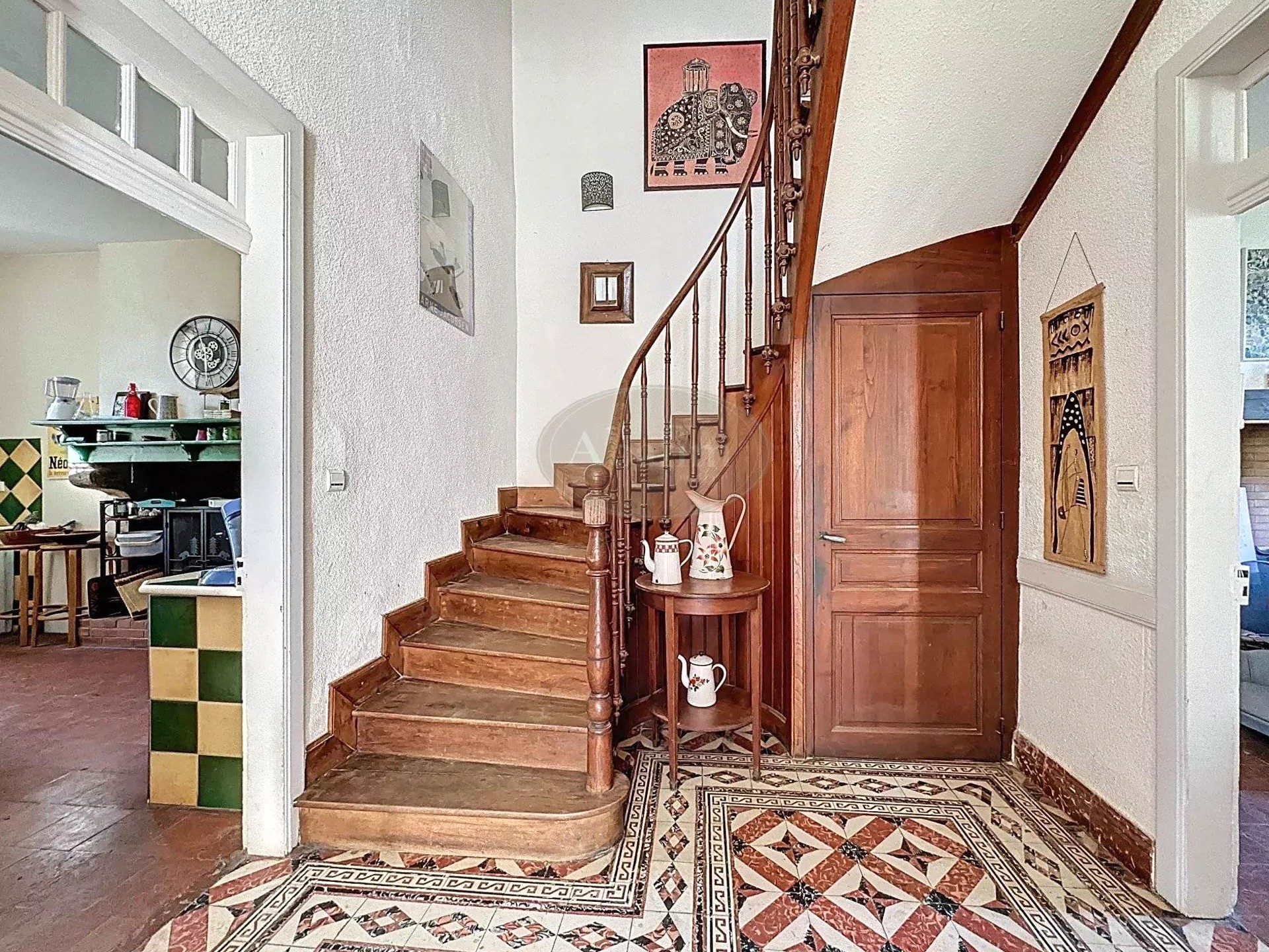 Constructed from ashlar stone, the house features historic cement tiles, high ceilings, and large fireplaces. Four rooms - office, kitchen, dining room, and living room - are arranged around the grand entrance on the ground floor. A door from the living room leads to a barn with a boiler room, laundry area, and bike garage, which also provides access to the guesthouse.