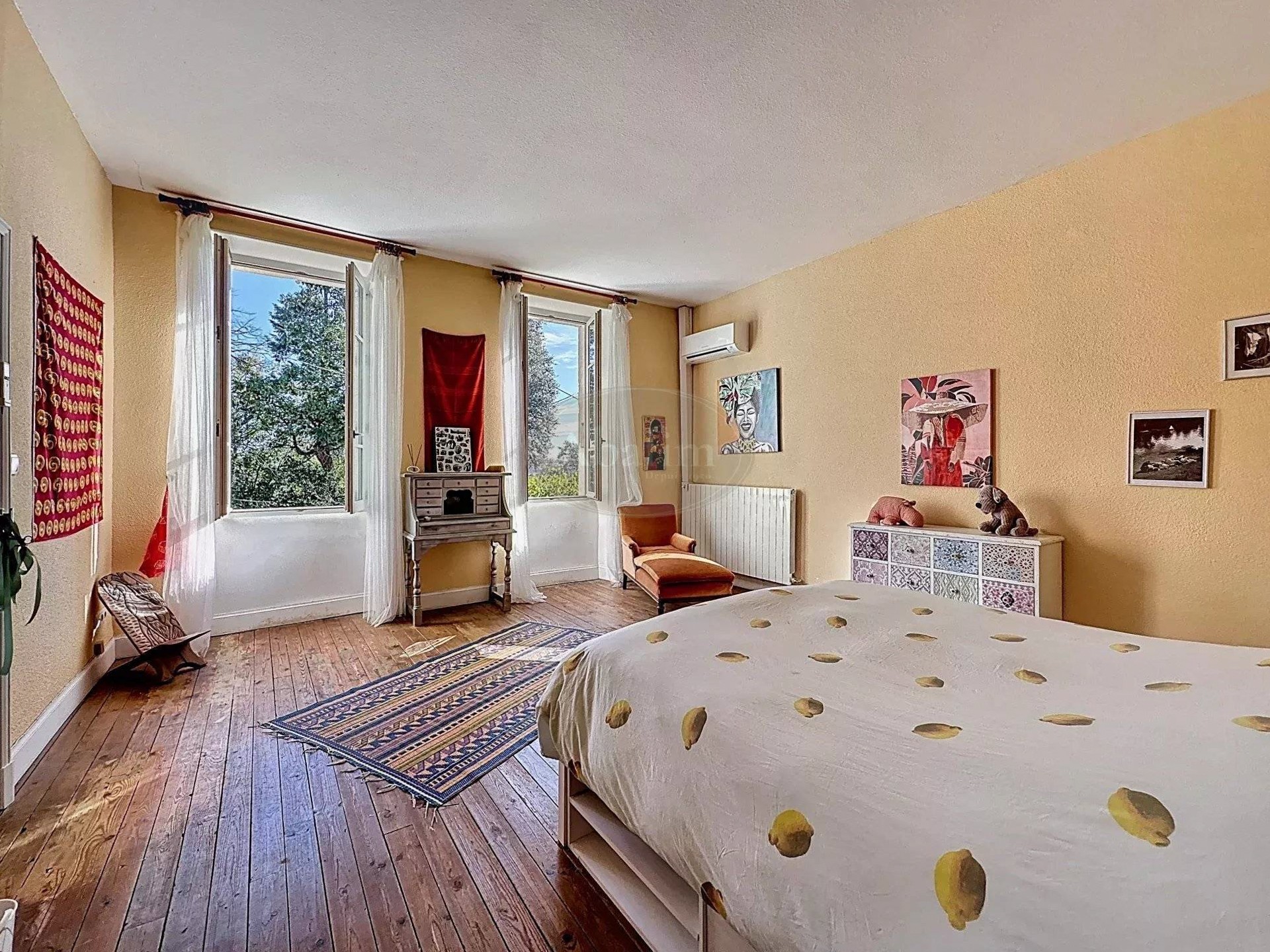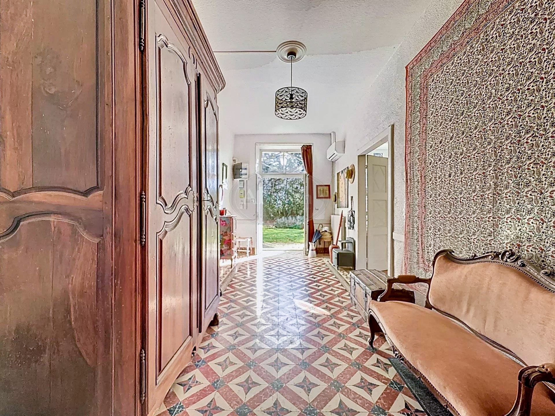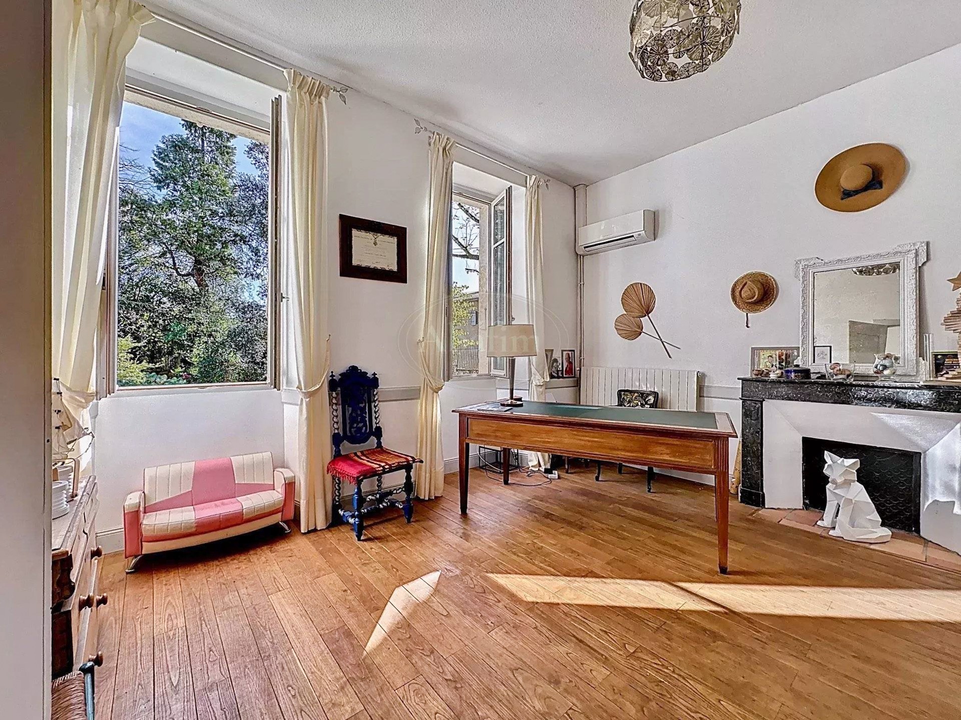 Constructed from ashlar stone, the house features historic cement tiles, high ceilings, and large fireplaces. Four rooms - office, kitchen, dining room, and living room - are arranged around the grand entrance on the ground floor. A door from the living room leads to a barn with a boiler room, laundry area, and bike garage, which also provides access to the guesthouse.