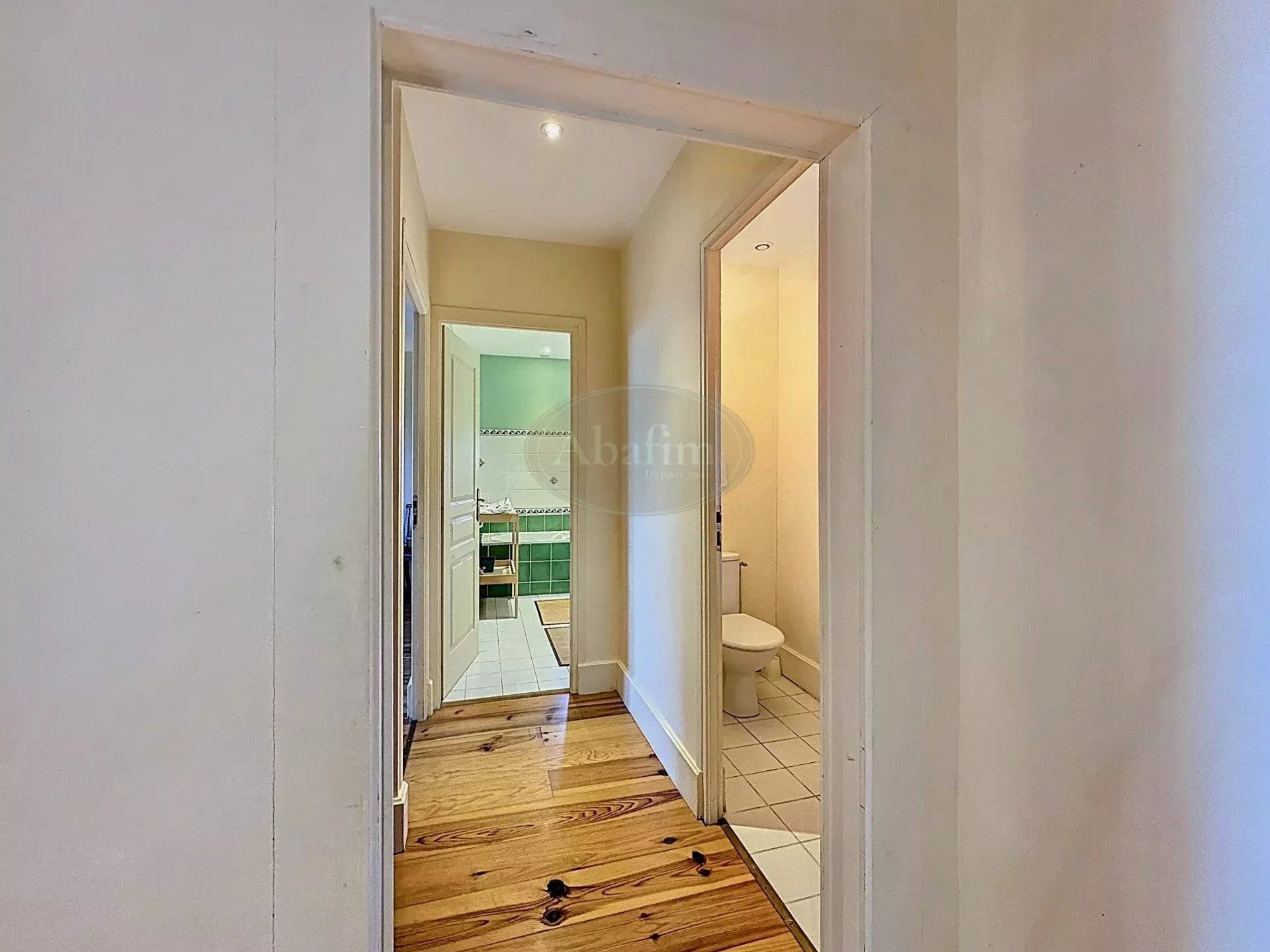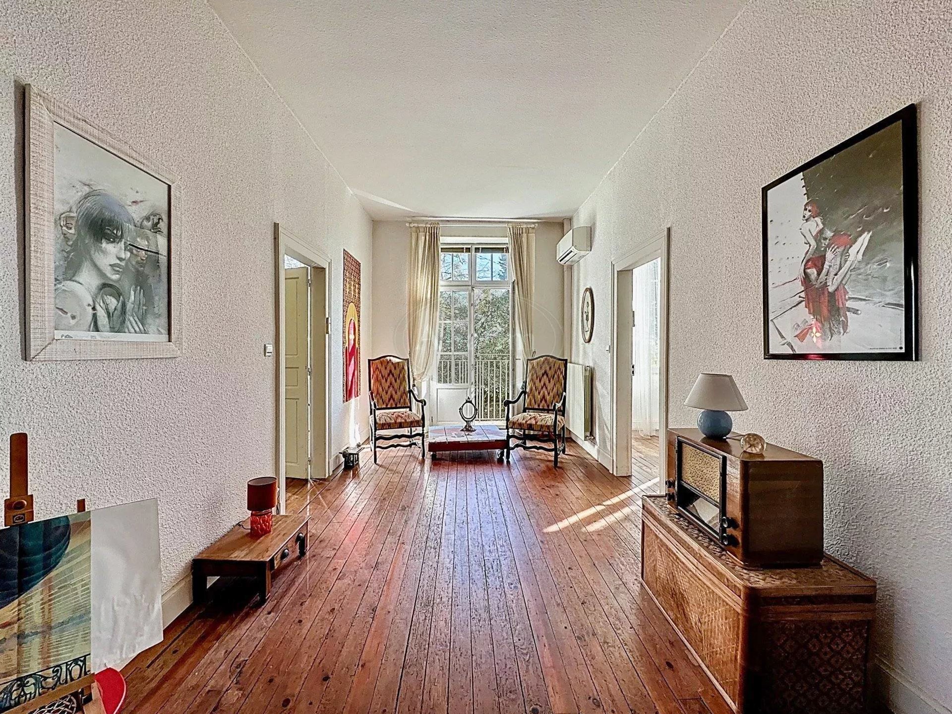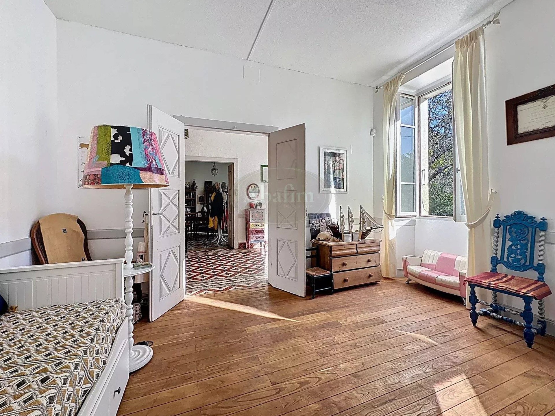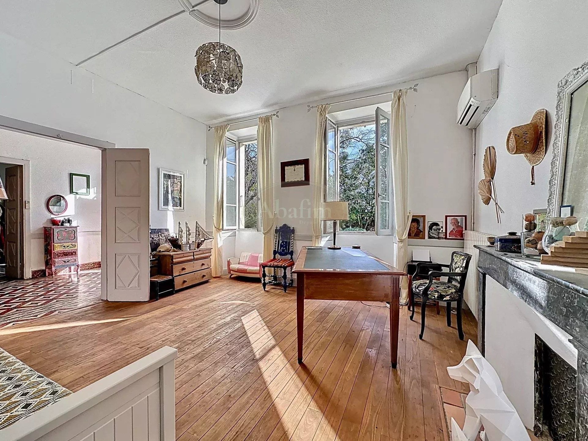 Constructed from ashlar stone, the house features historic cement tiles, high ceilings, and large fireplaces. Four rooms - office, kitchen, dining room, and living room - are arranged around the grand entrance on the ground floor. A door from the living room leads to a barn with a boiler room, laundry area, and bike garage, which also provides access to the guesthouse.