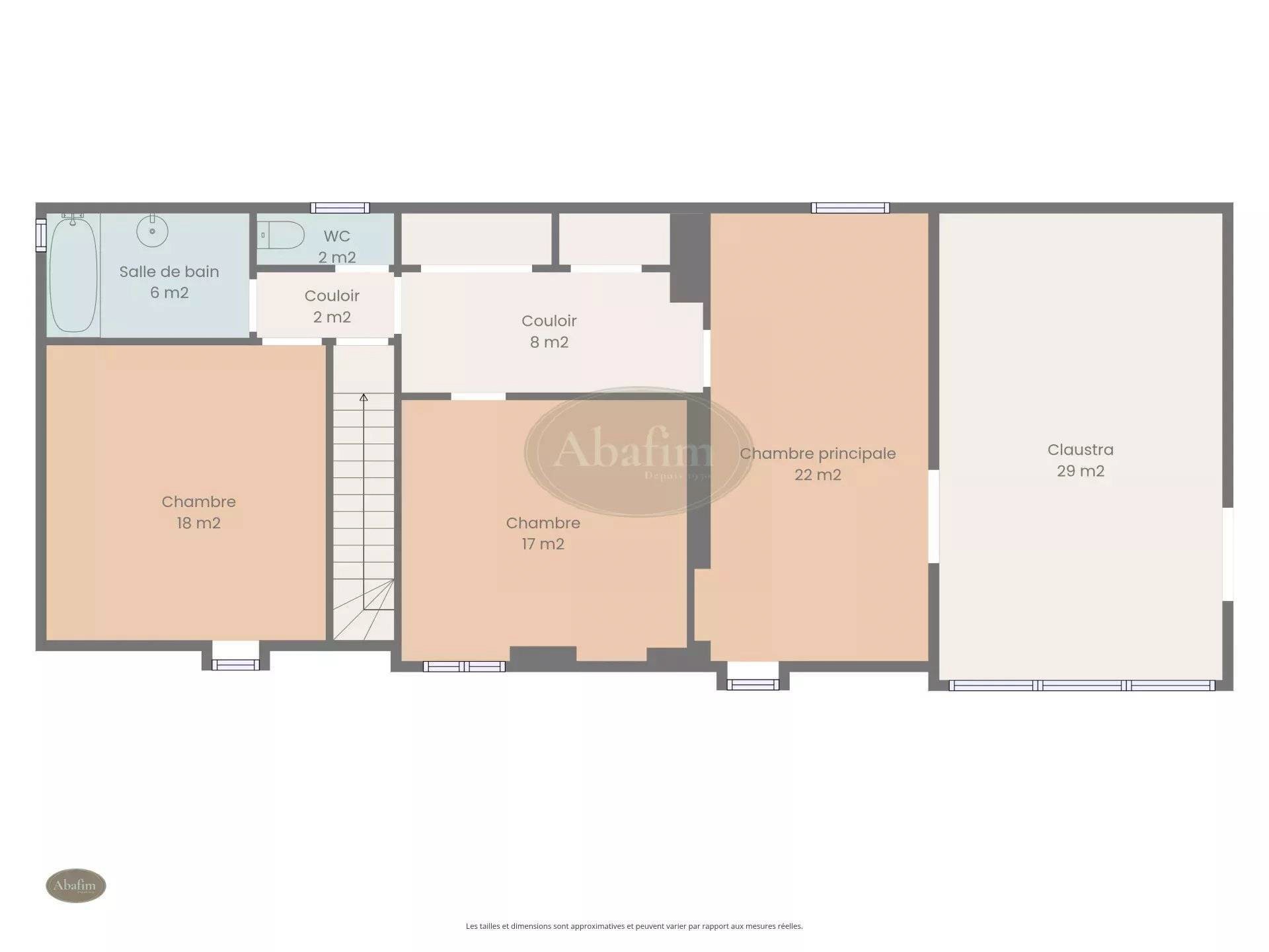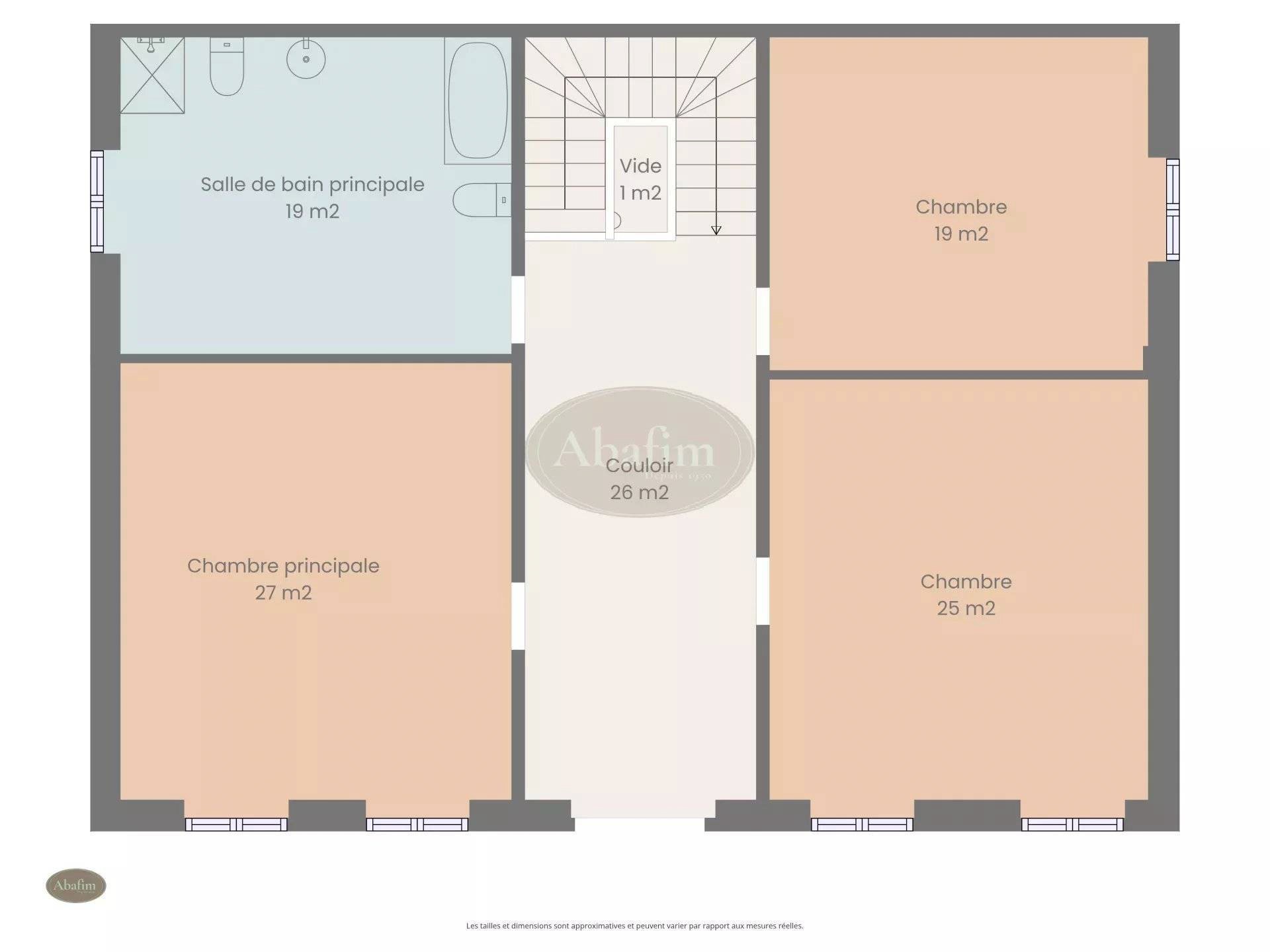 Upstairs, there are four spacious rooms of approximately 215 sq ft each, including three bedrooms and a large bathroom with both a shower and a bathtub.