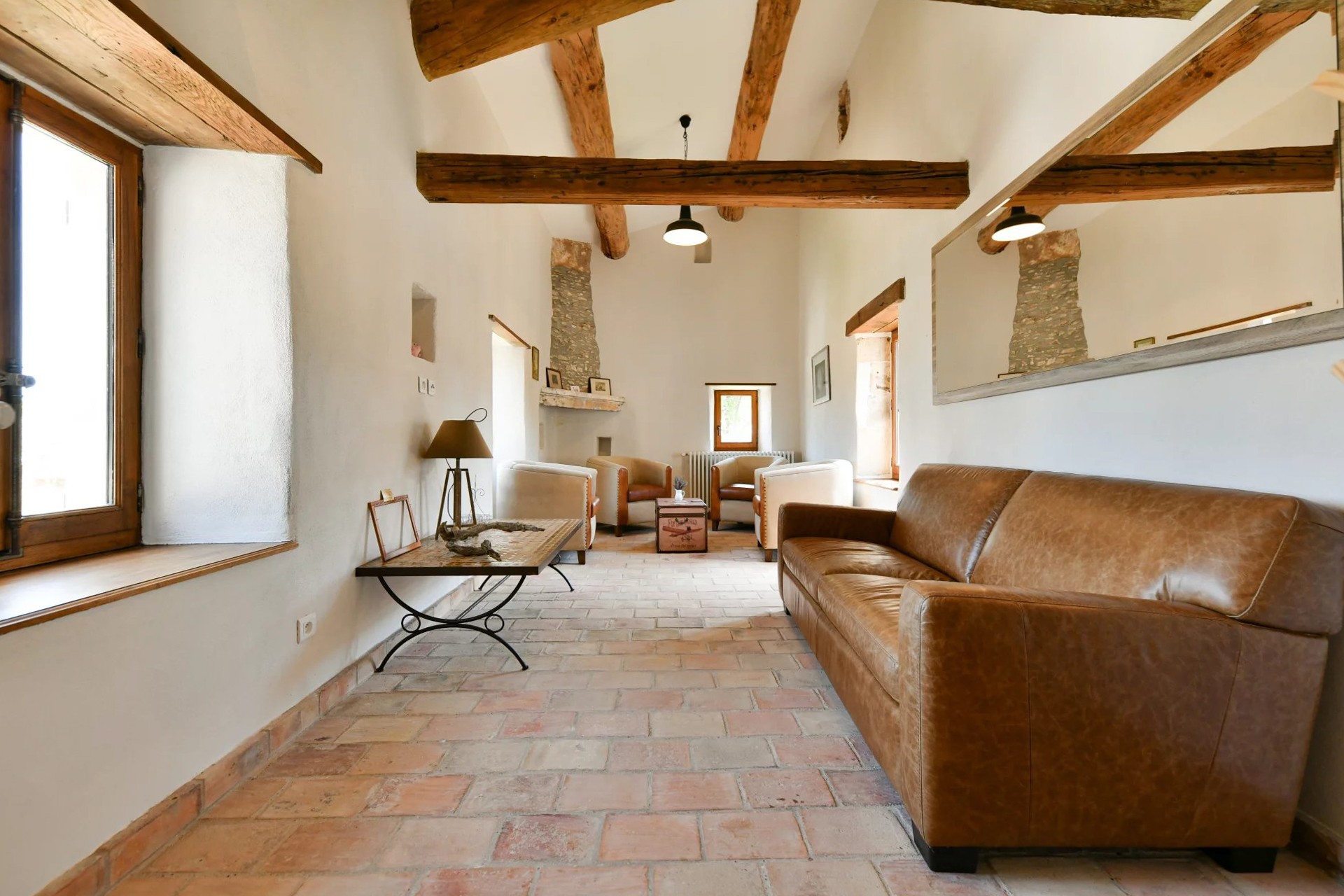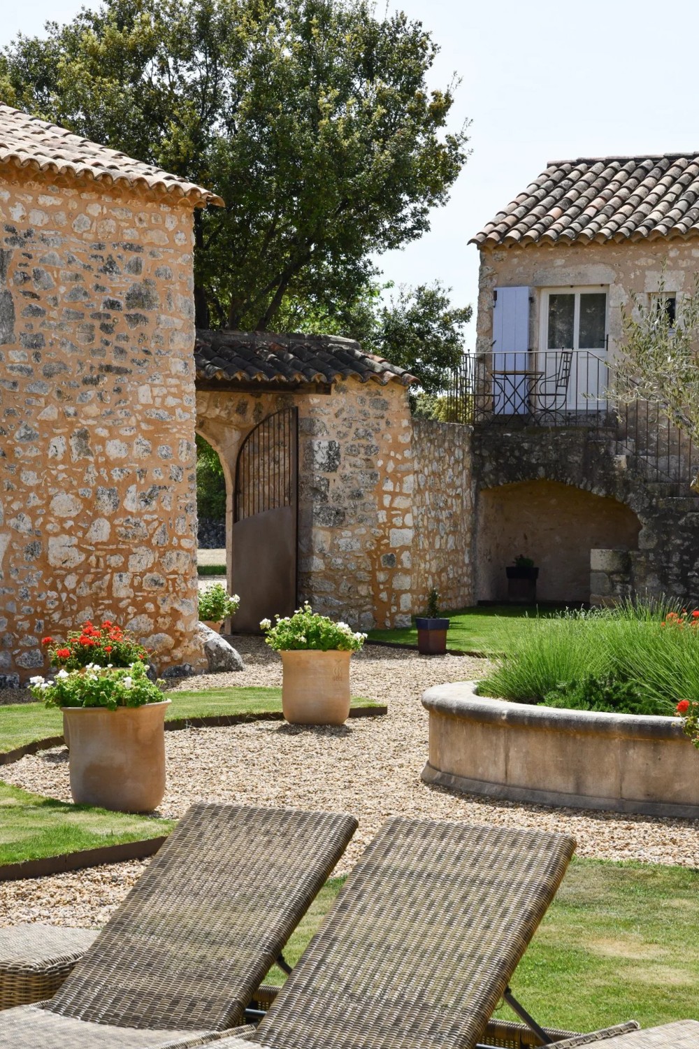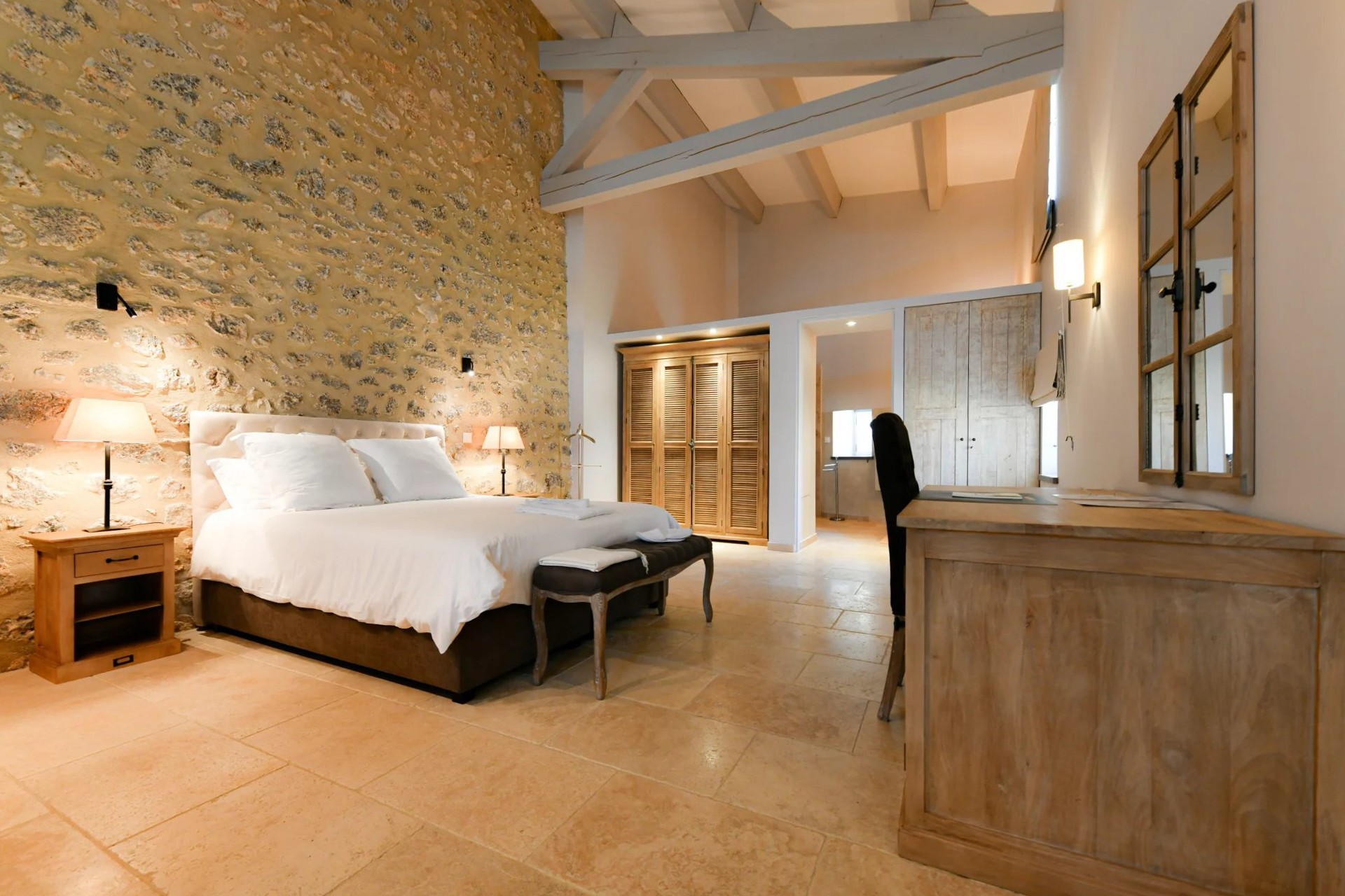 The main building is arranged around a courtyard with a French-style garden. It includes four spacious suites, each equipped with a private living area, bedroom, bathroom, storage space, and separate toilet.
