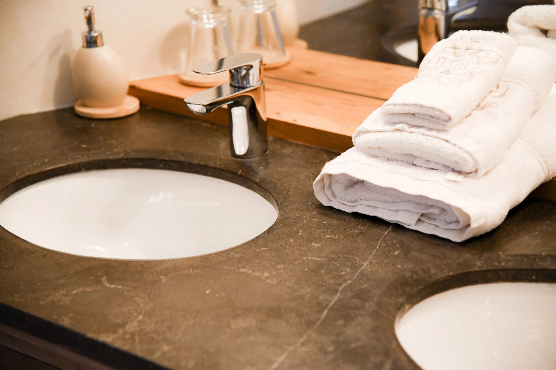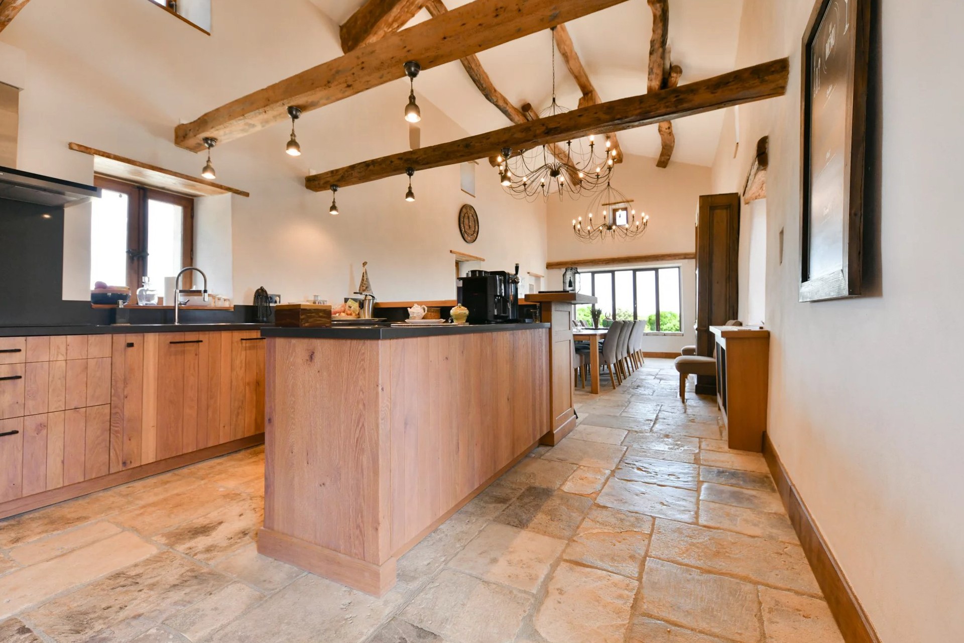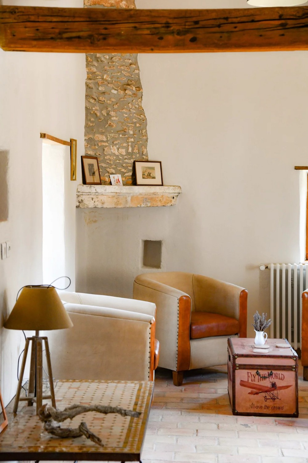 The main building is arranged around a courtyard with a French-style garden. It includes four spacious suites, each equipped with a private living area, bedroom, bathroom, storage space, and separate toilet.