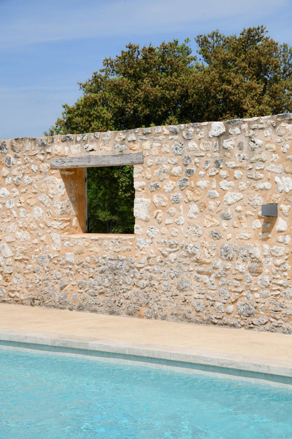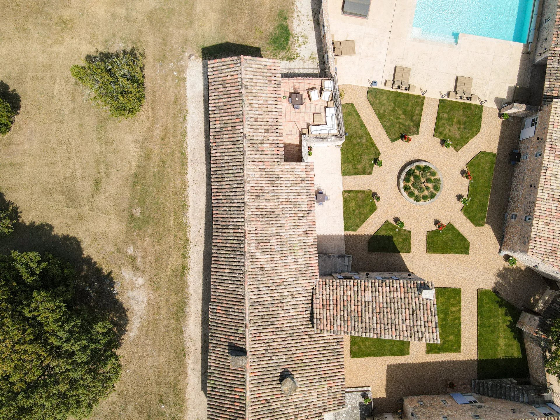 The pool area (10.65 m x 4.92 m) with spa and counter-current swimming system is open to the surrounding landscape through large windows. Adjacent to this is a summer kitchen with a rooftop terrace overlooking the pool, courtyard, and French garden.