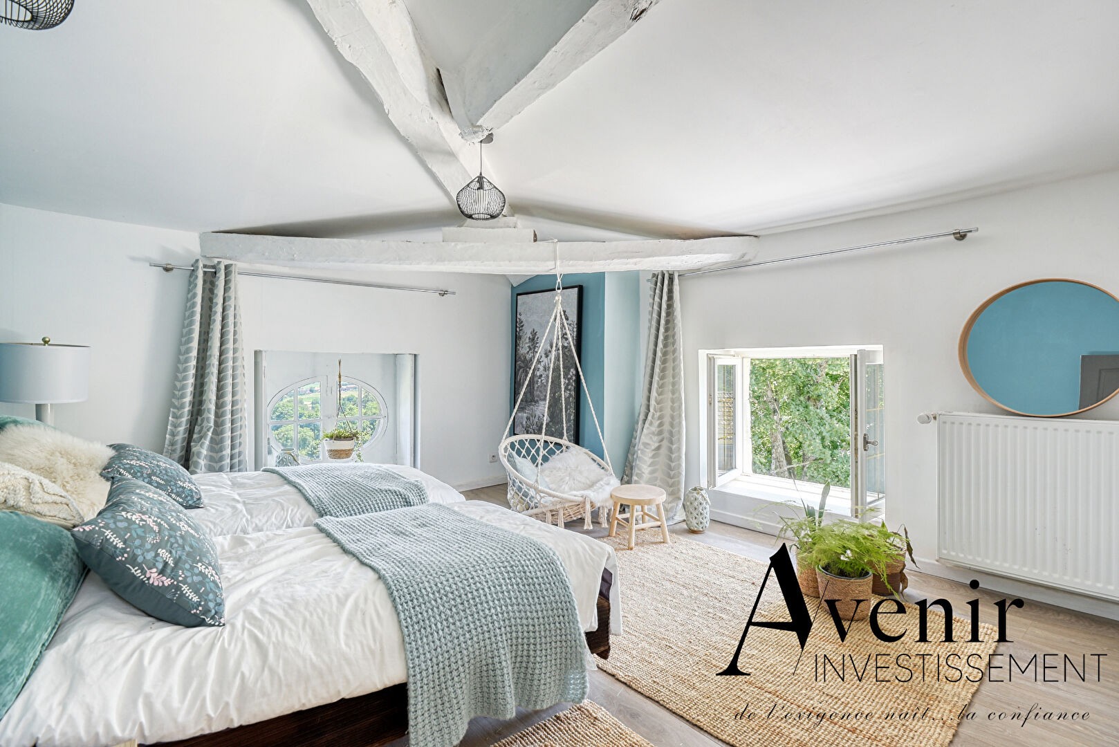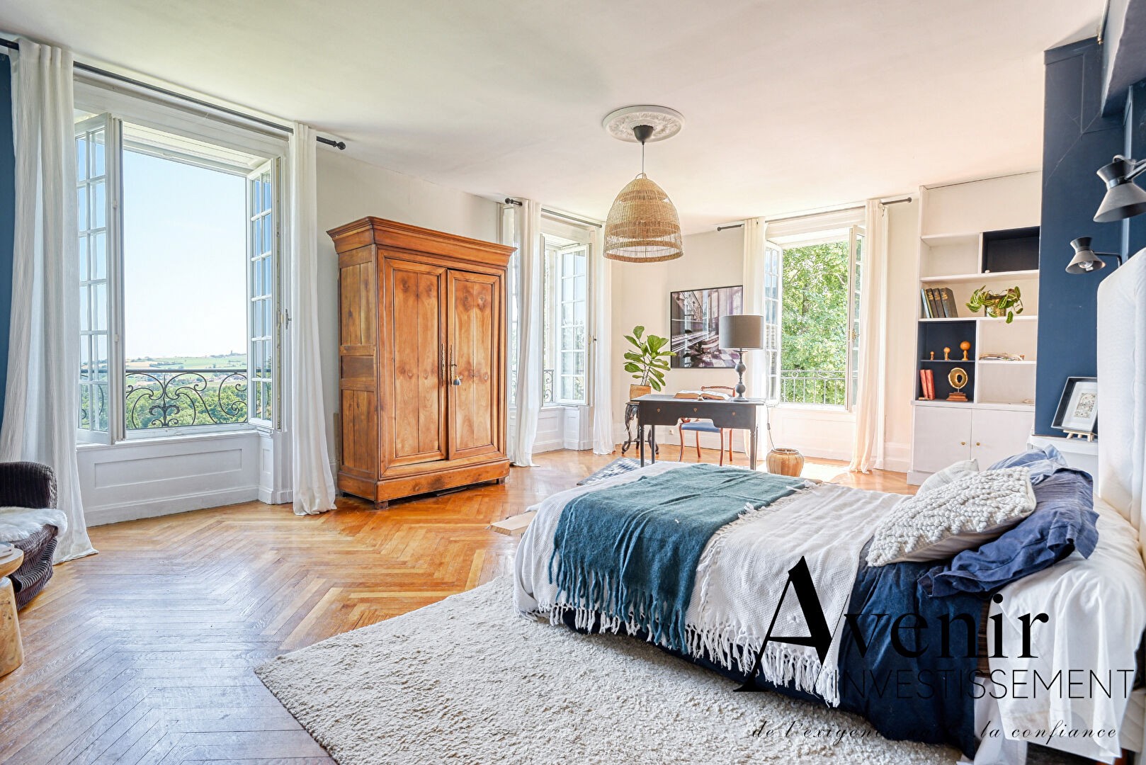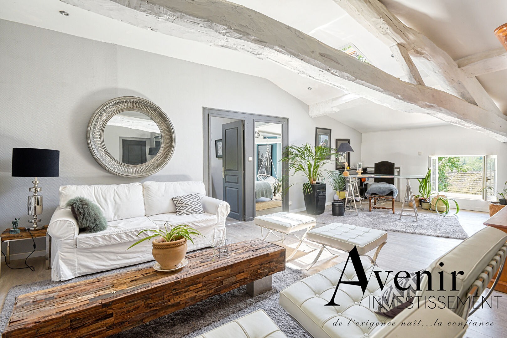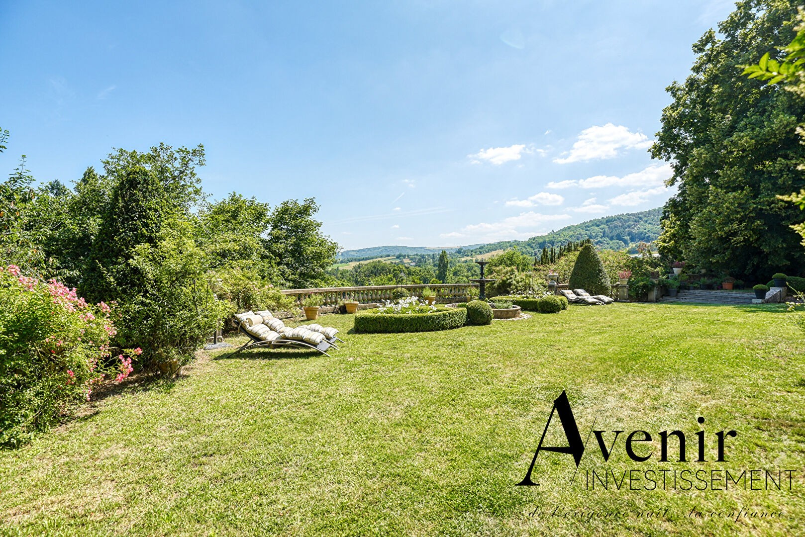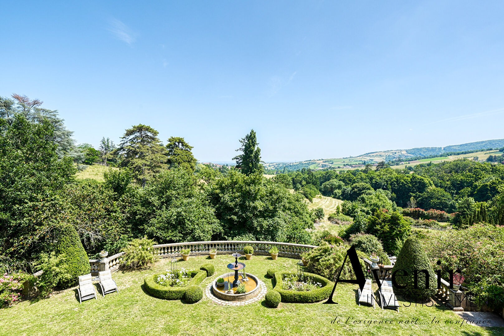 The property is arranged over three levels, each offering approximately 180 m² of living space, set on an 8,000 m² plot with open views of the Monts du Lyonnais.