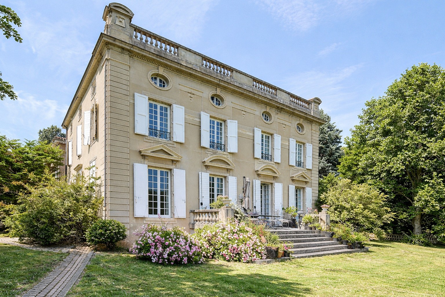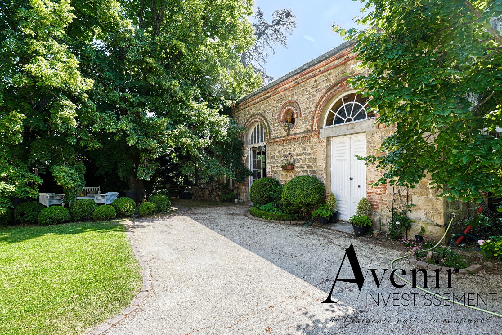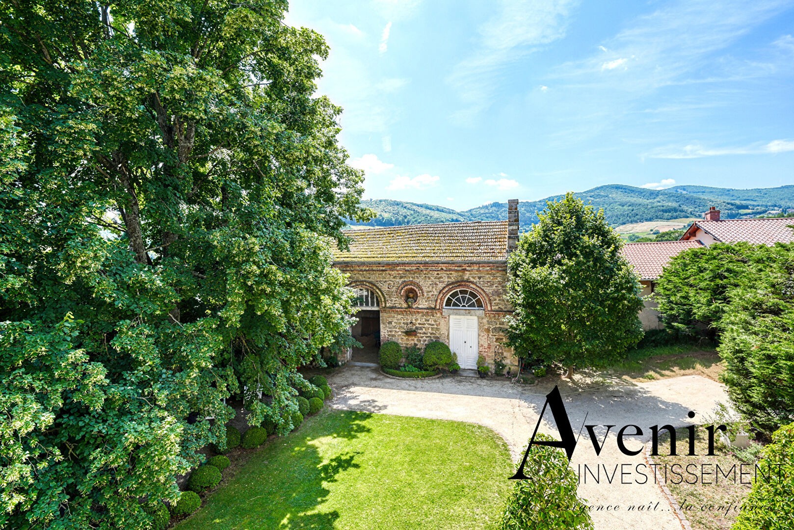 The manor is located in a quiet rural setting with local amenities in the nearby village, approximately 18 km from Place Bellecour in Lyon.