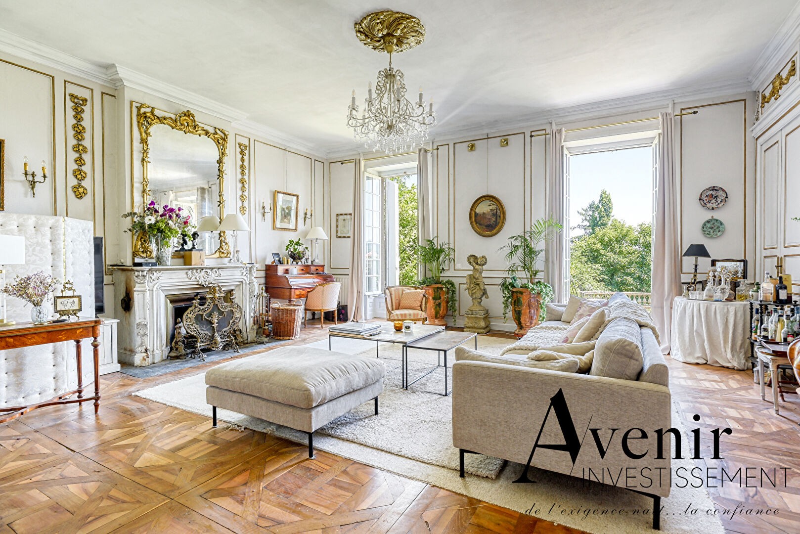 Outdoor amenities include landscaped grounds, a fully enclosed swimming pool, and three horse boxes with direct access to pastures and a riding arena. A former chapel and an orangery offer additional conversion potential.