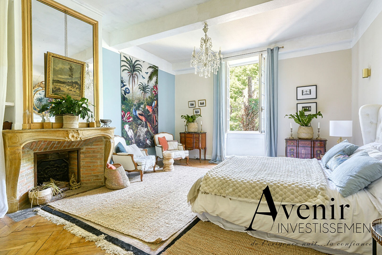 The ground floor reception areas include a living room, dining room, and library, all opening south onto a terrace and the garden. In total, the property offers seven bedrooms, two bathrooms, and three shower rooms. Original architectural features such as fireplaces, parquet floors, and wood paneling have been preserved, along with generous ceiling heights typical of the building.