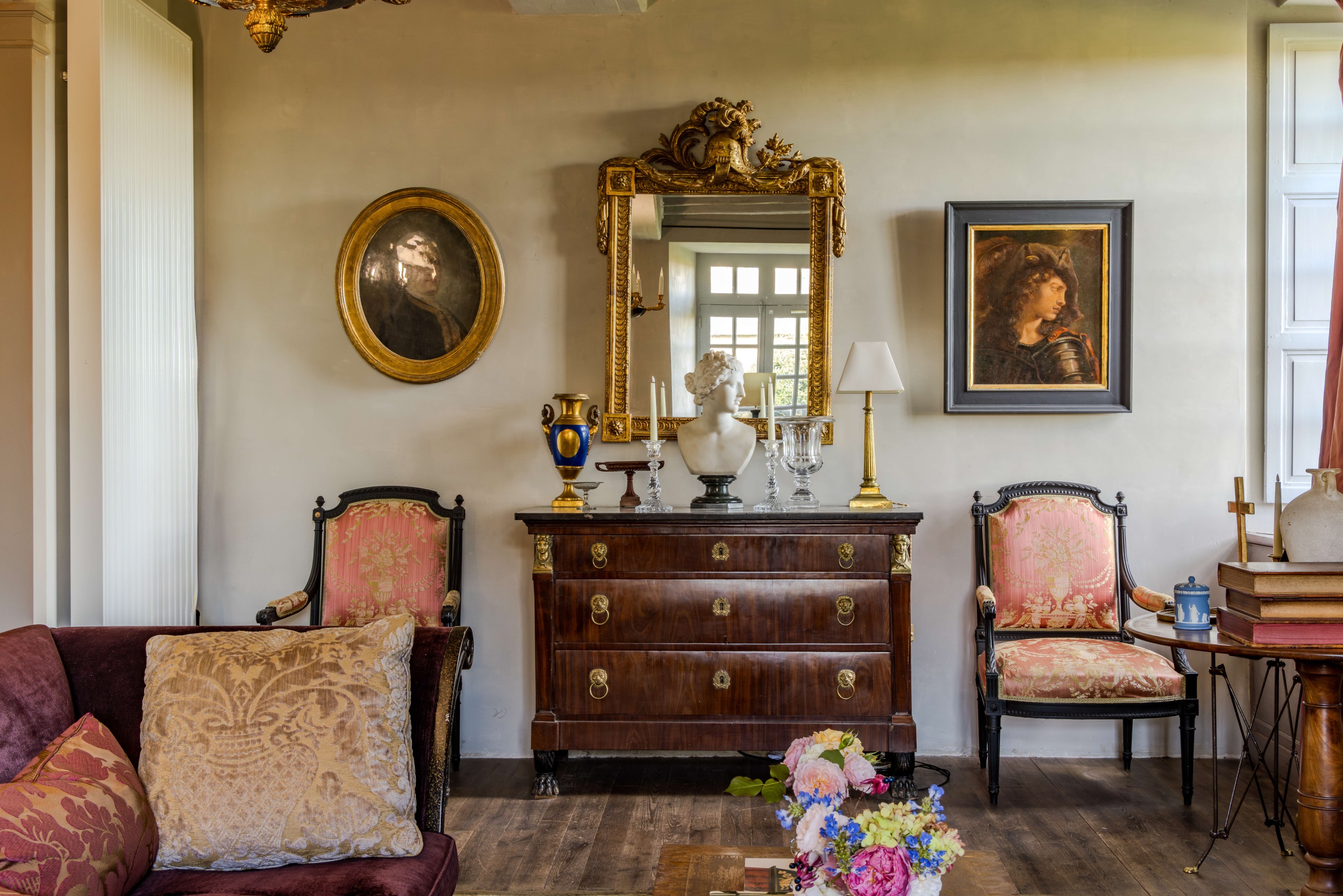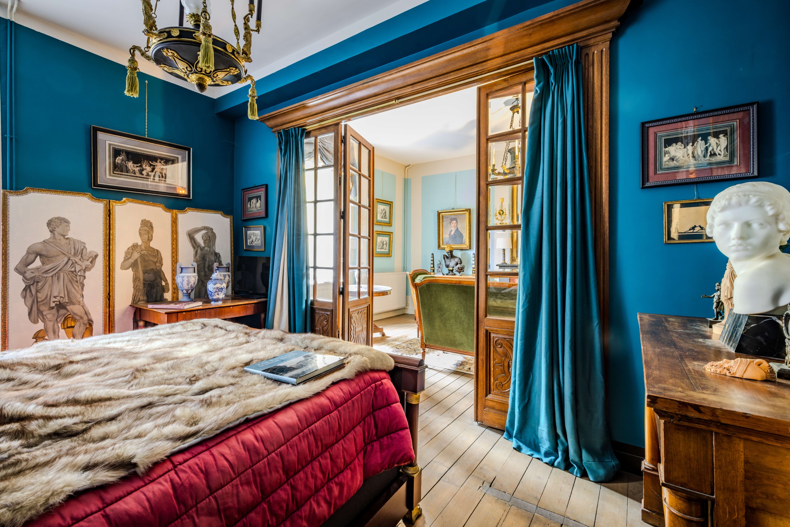 The first floor features three bedrooms, each with its own en-suite bathroom and toilet, all laid with pitch-pine parquet floors. A fourth bedroom, without an en-suite, completes this level. This room includes a small sitting area, separated from an alcove by a Serlian arch, and a delightful boudoir that serves as a dressing room.