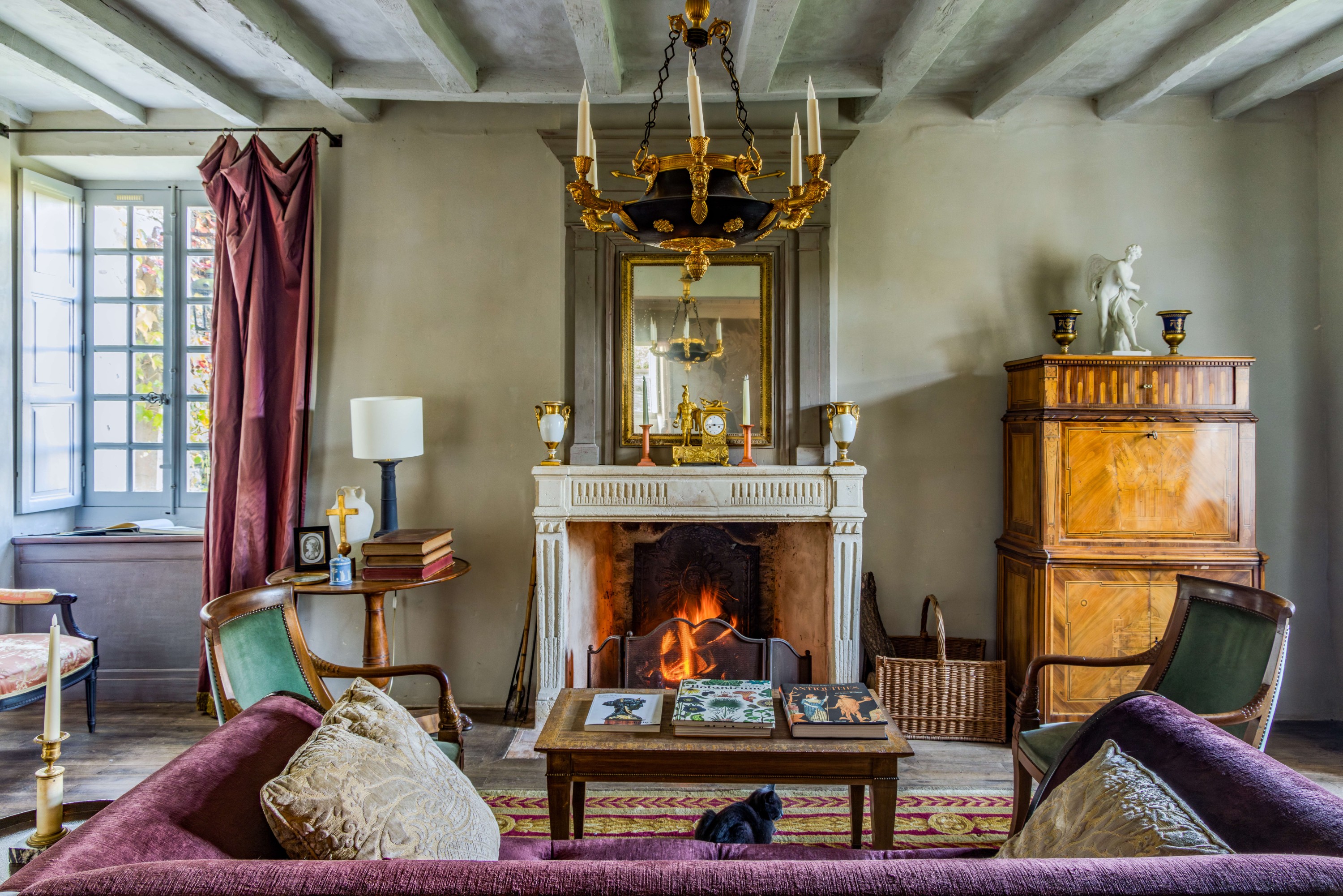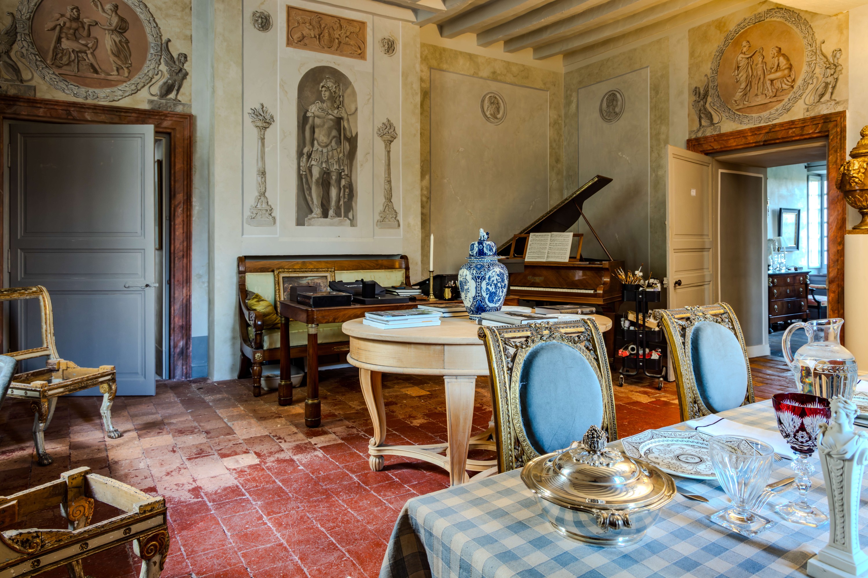The living room features a painted ceiling with exposed beams, painted walls, a neo-classical 18th-century fireplace, and oak parquet floors. The most distinctive element is the gallery-like passage leading to the staircase. This gallery is marked by a stuccoed Tuscan portico and painted grisaille friezes that mimic bas-reliefs. The living room connects to the music room and the staircase while opening to the garden on its eastern side.