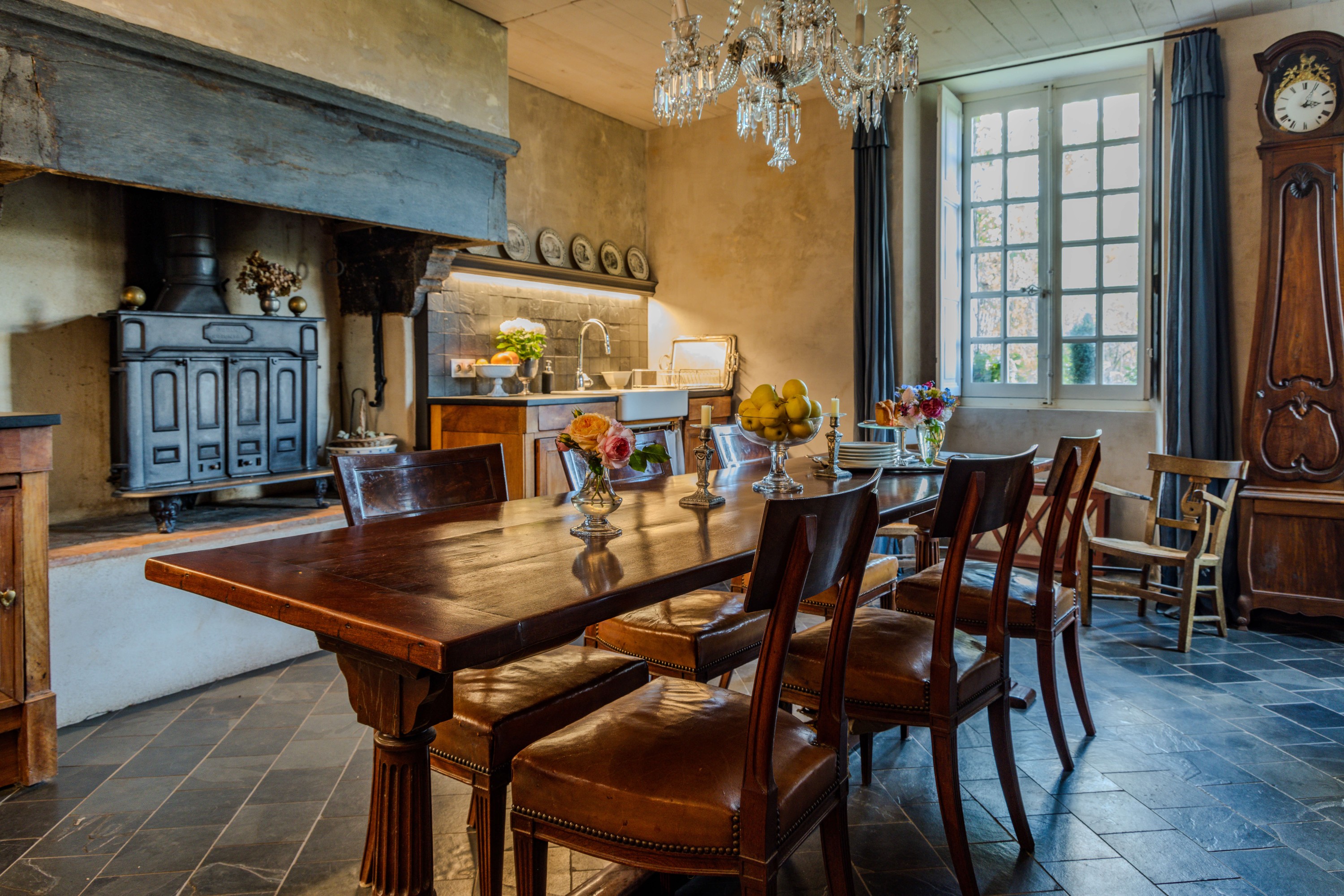 The spacious kitchen accommodates a large dining table, perfect for convivial meals. Its painted wooden ceiling, slate flooring, and matching countertops and backsplashes create a harmonious atmosphere. A traditional straight-hooded fireplace underscores the room’s original purpose, which remains unchanged. Modern amenities are seamlessly integrated into this historically rich setting.