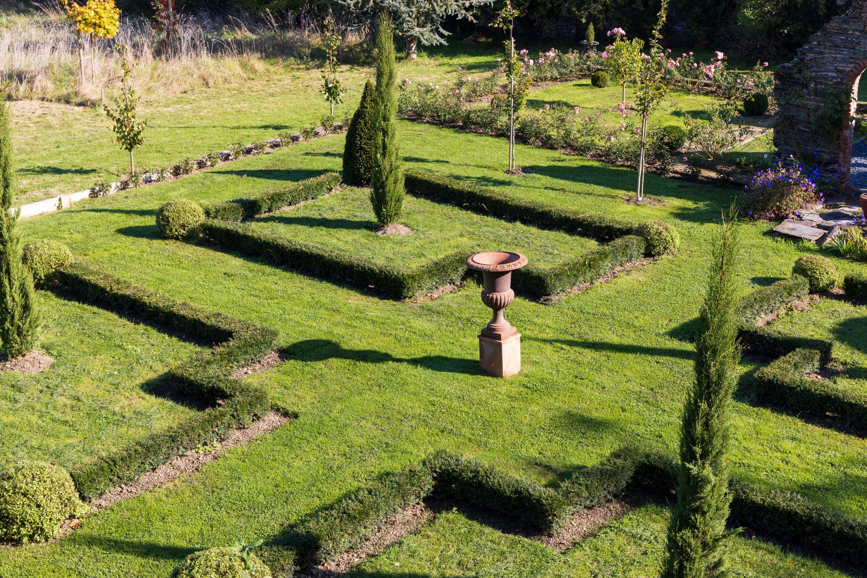 - A formal Italian-style garden near the manor takes the shape of a Latin cross, defined by neatly trimmed yews. This area features a terrace and an outdoor dining space, adorned with a variety of fragrant flowers evoking the essence of Tuscany.