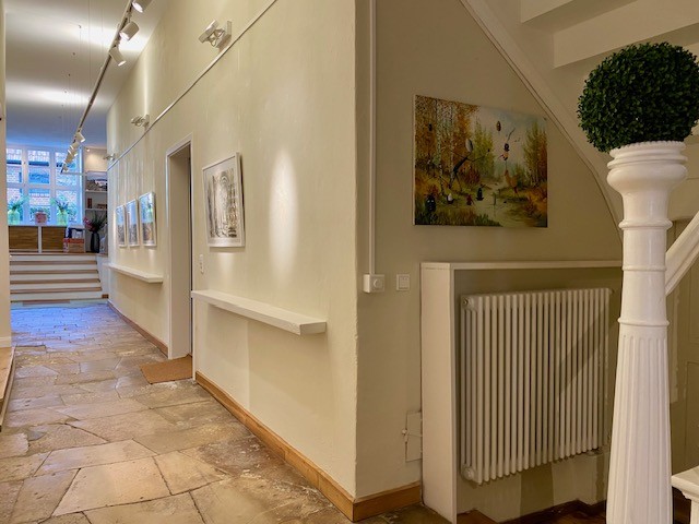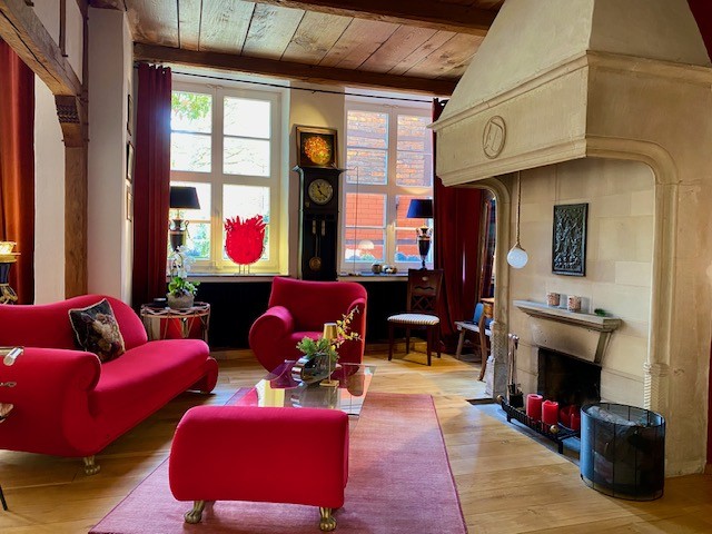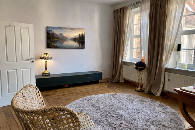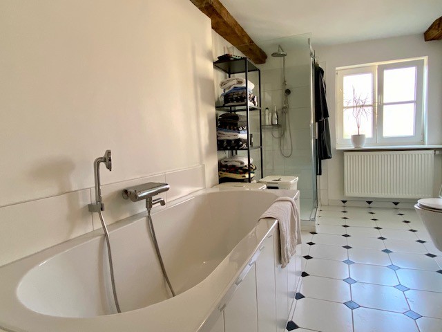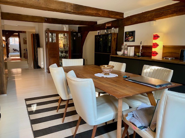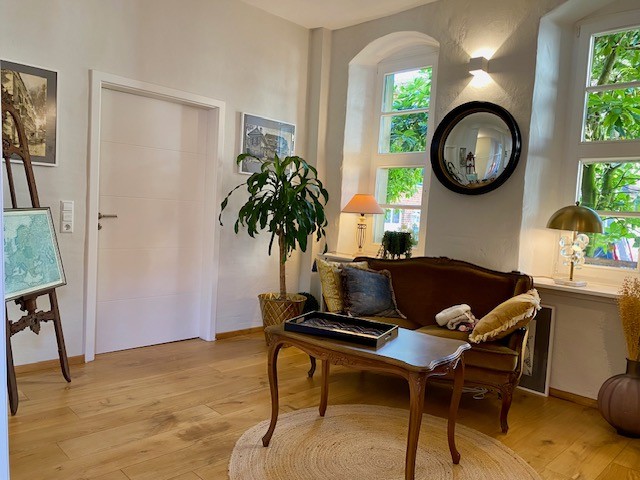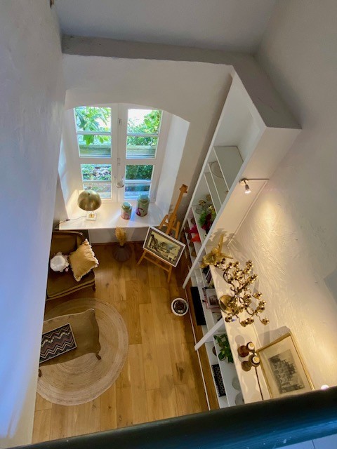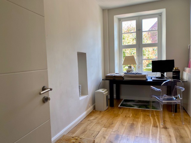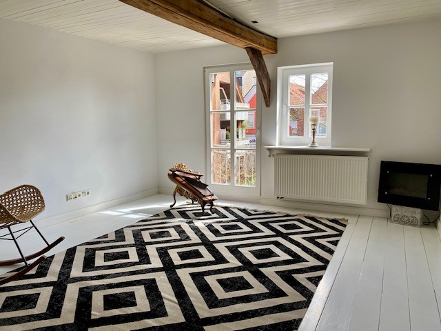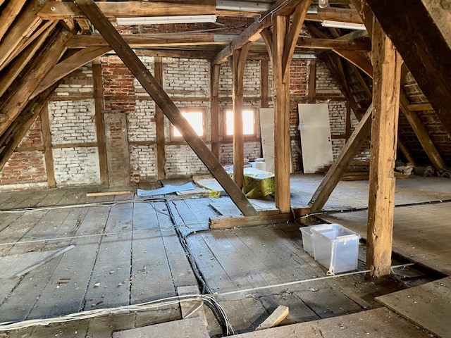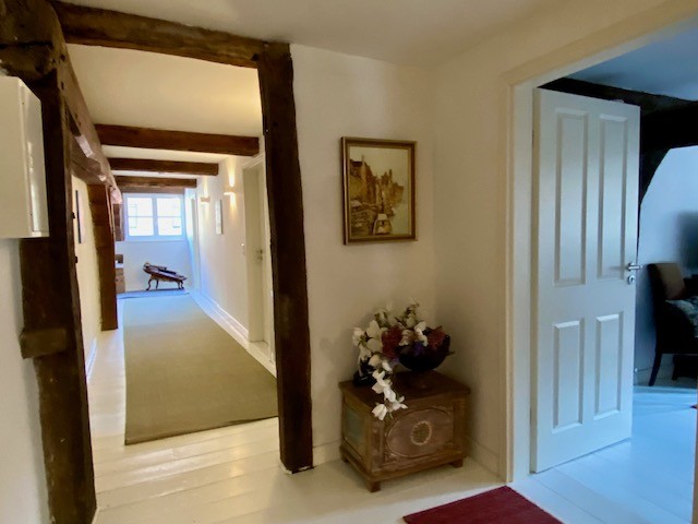 The house offers 12 rooms and 4 bathrooms. Original ceiling beams are preserved in the central hall and several rooms, complemented by solid wood flooring and original stone flooring in the hall. A vaulted cellar is included. The attic provides potential for further development. There are two entrances: a main entrance from the pedestrian zone and a second access from the inner courtyard. A parking space is located in front of the courtyard.