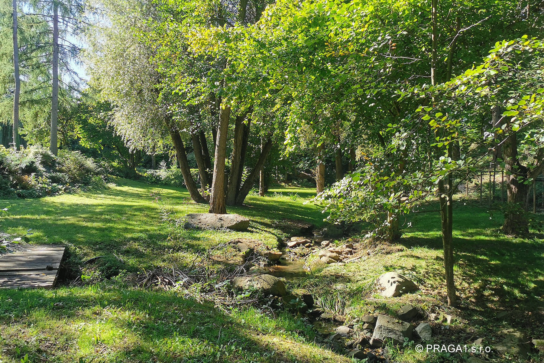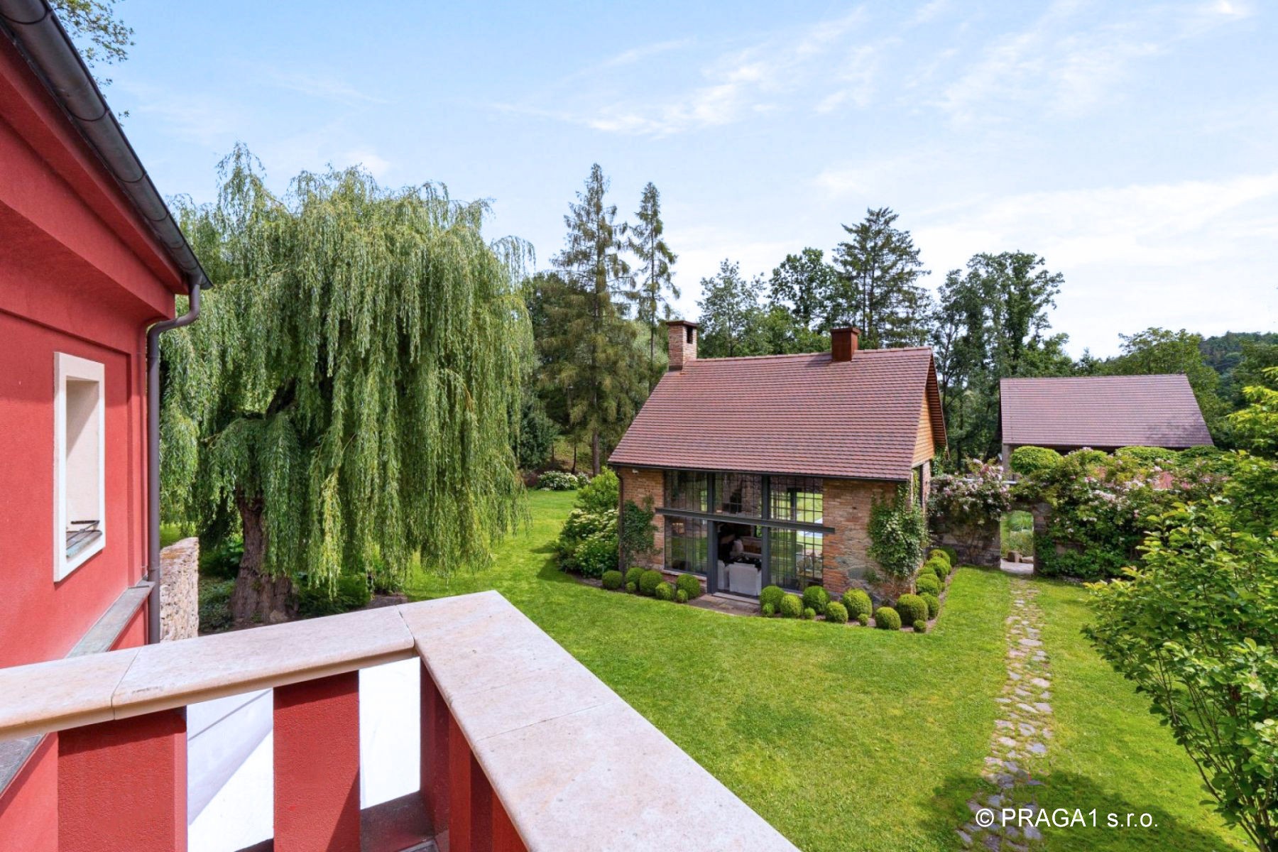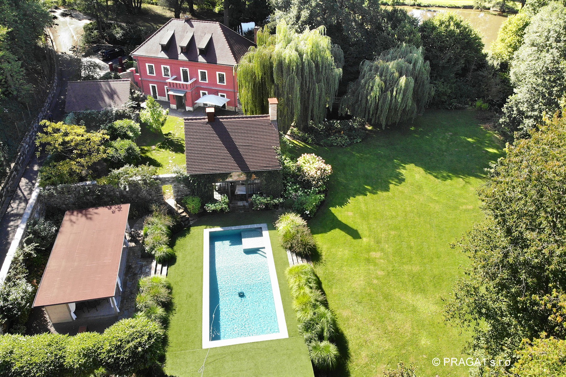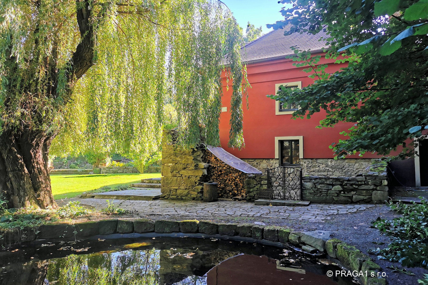 Fully renovated historical mill complex on 1.2 hectares of land. 20 minutes drive by car to the capital Prague. The mill building dates back to the 18th century, with other buildings constructed in historic style from stone and brick. The complex is fenced by a stone wall. The land is maily covered by grown up trees. There is a stream running through the park. Next to the pool there is a house with a fireplace connected by terrace to the pool area. On the other side of the pool there is a covered terrace with seating. Further away from the house is a fully renovated barn that serves as a large garage with a workshop, hobby room and washroom. Very quiet location on the outskirts of the village, accessed by a dead-end road. Lots of flowers and decorative shrubs. The mill itself has 4 bedrooms with bathrooms. On the ground floor there is a large living area with the view of the old mill wheel, a kitchen and service rooms. There is a cellar below the mill building.