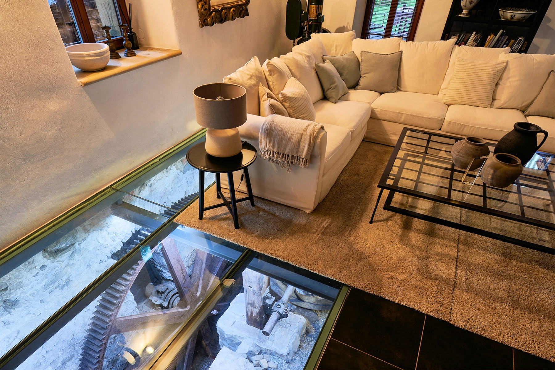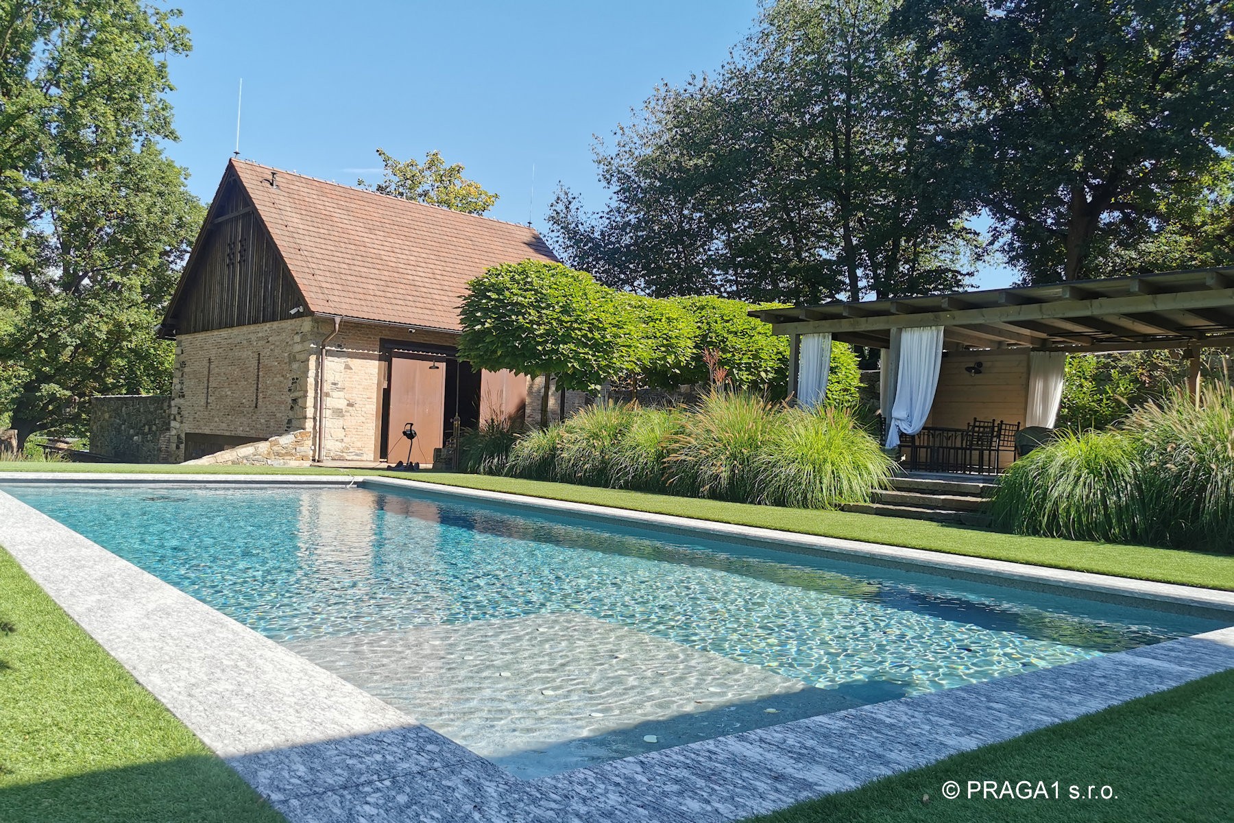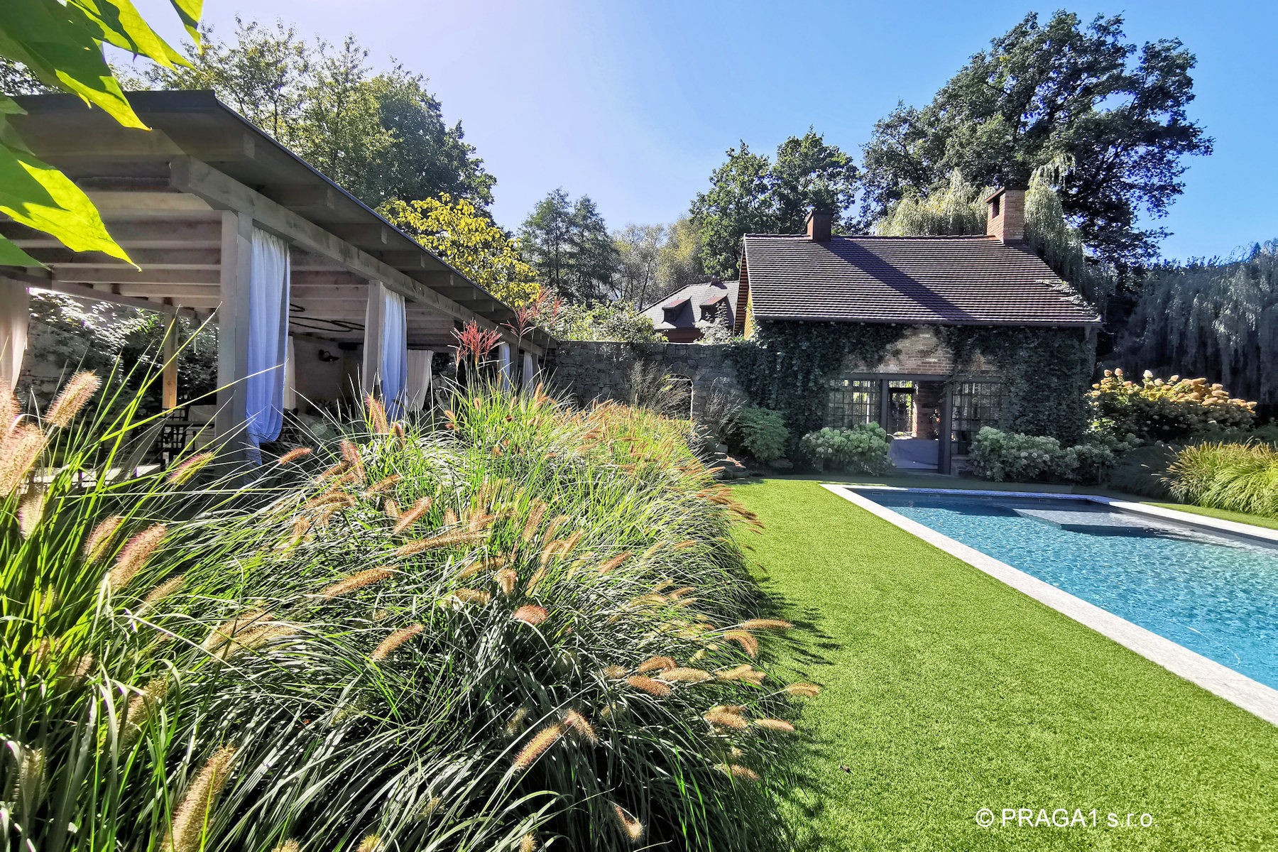 Fully renovated historical mill complex on 1.2 hectares of land. 20 minutes drive by car to the capital Prague. The mill building dates back to the 18th century, with other buildings constructed in historic style from stone and brick. The complex is fenced by a stone wall. The land is maily covered by grown up trees. There is a stream running through the park. Next to the pool there is a house with a fireplace connected by terrace to the pool area. On the other side of the pool there is a covered terrace with seating. Further away from the house is a fully renovated barn that serves as a large garage with a workshop, hobby room and washroom. Very quiet location on the outskirts of the village, accessed by a dead-end road. Lots of flowers and decorative shrubs. The mill itself has 4 bedrooms with bathrooms. On the ground floor there is a large living area with the view of the old mill wheel, a kitchen and service rooms. There is a cellar below the mill building.