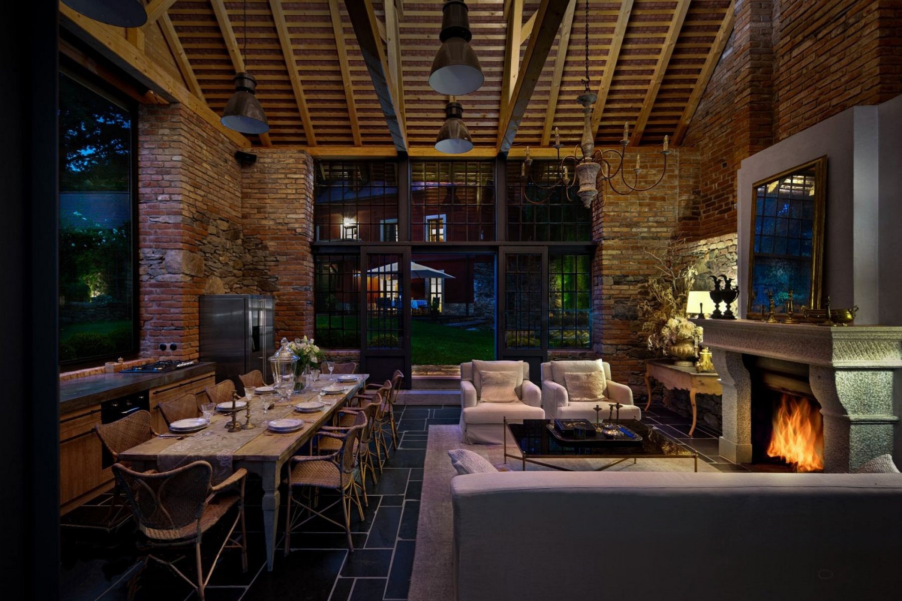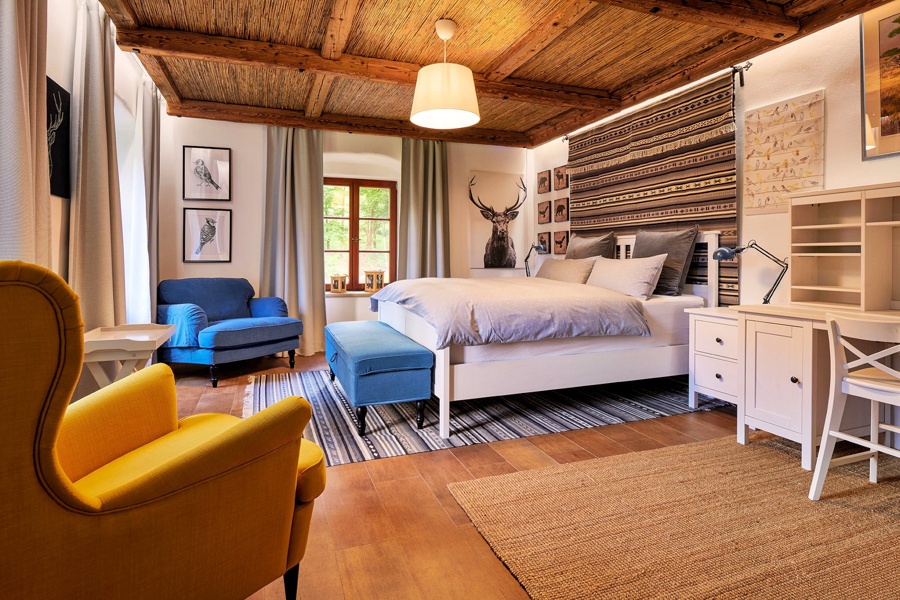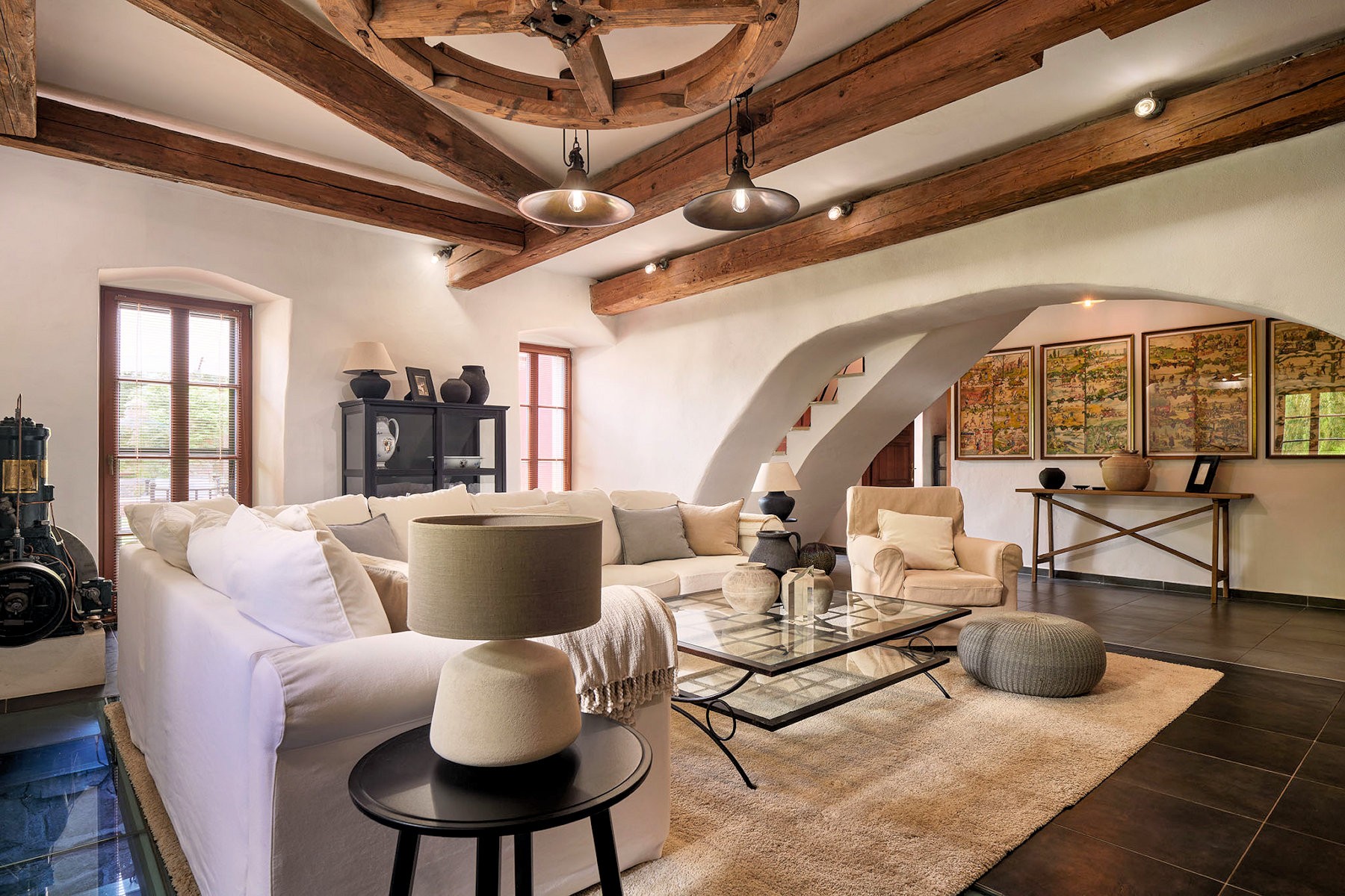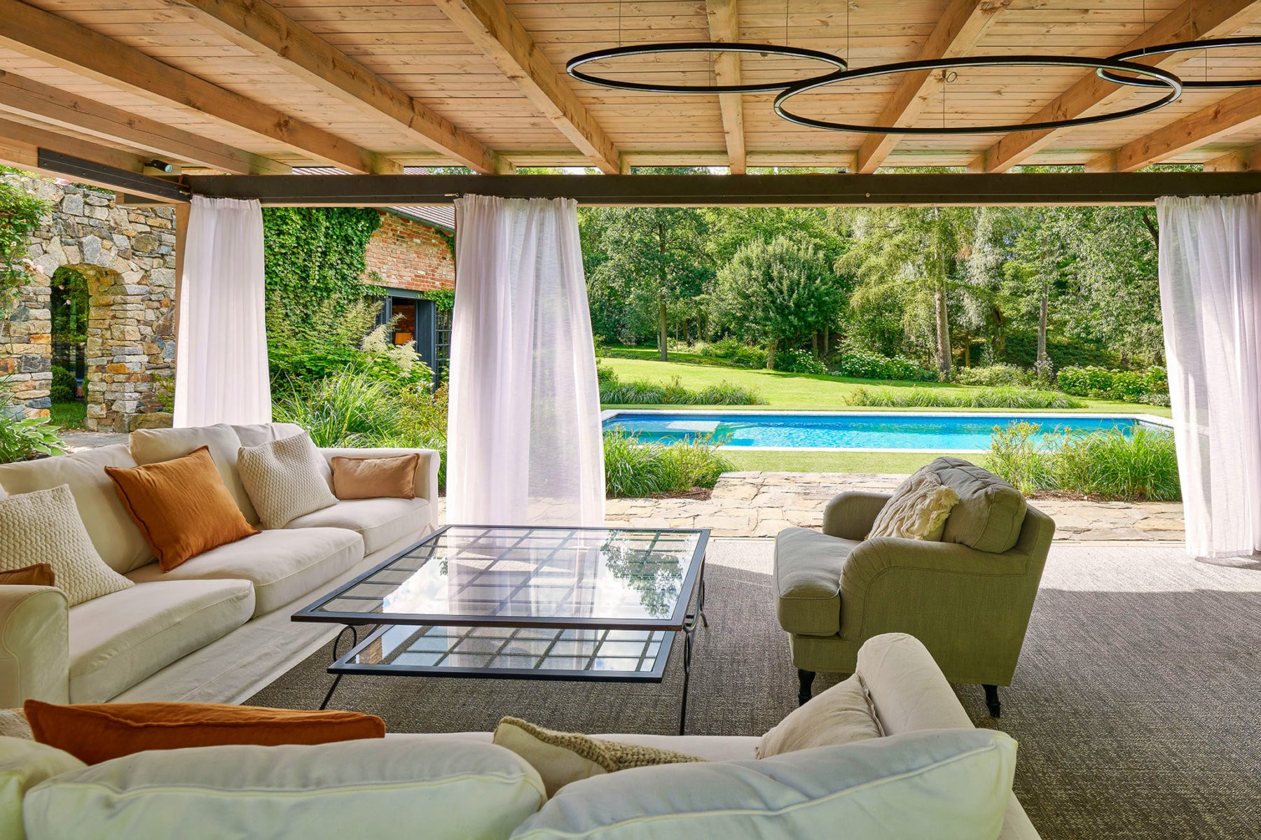 Fully renovated historical mill complex on 1.2 hectares of land. 20 minutes drive by car to the capital Prague. The mill building dates back to the 18th century, with other buildings constructed in historic style from stone and brick. The complex is fenced by a stone wall. The land is maily covered by grown up trees. There is a stream running through the park. Next to the pool there is a house with a fireplace connected by terrace to the pool area. On the other side of the pool there is a covered terrace with seating. Further away from the house is a fully renovated barn that serves as a large garage with a workshop, hobby room and washroom. Very quiet location on the outskirts of the village, accessed by a dead-end road. Lots of flowers and decorative shrubs. The mill itself has 4 bedrooms with bathrooms. On the ground floor there is a large living area with the view of the old mill wheel, a kitchen and service rooms. There is a cellar below the mill building.