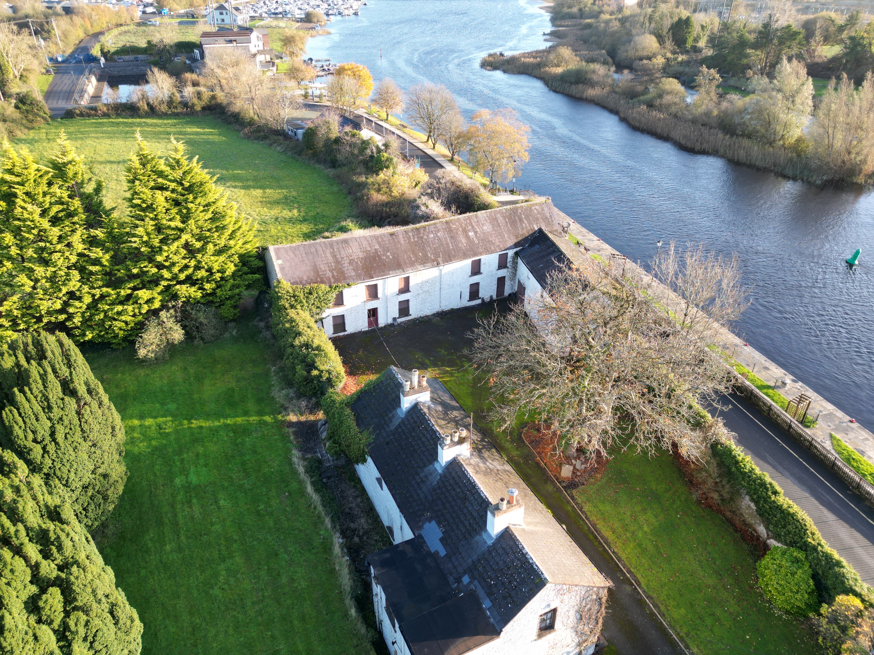 REA Seamus Carthy proudly presents a Landmark Shannon-side Residence with Historic Courtyard and Two Acres Overlooking the Marina. Shannon View is a distinguished nineteenth-century riverside residence occupying an exceptional elevated position on the banks of the River Shannon, directly overlooking the marina and Blueway in the villages of Ballyleague and Lanesborough. Built originally for the engineer of the Shannon Bridge and incorporating earlier stone outbuildings believed to form part of the De Lacy Norman castle that once guarded the river ford, the property combines rare heritage with extraordinary views and development potential. Set within about two acres of mature private grounds, Shannon View includes a traditional two-storey period home together with an extensive range of cut-stone outbuildings under natural-slate roofs arranged around a sheltered courtyard. The lands enjoy dual road frontage and three vehicular access points within the Ballyleague settlement boundary, all zoned residential. This is a once-in-a generation opportunity for discerning buyers seeking, a character family home with direct Shannon views, a boutique accommodation or tourism project in a thriving Blueway location, or a strategic riverside redevelopment site in an established village environment. Contact REA Seamus Carthy to arrange your private viewing. Viewing strictly by appointment.
