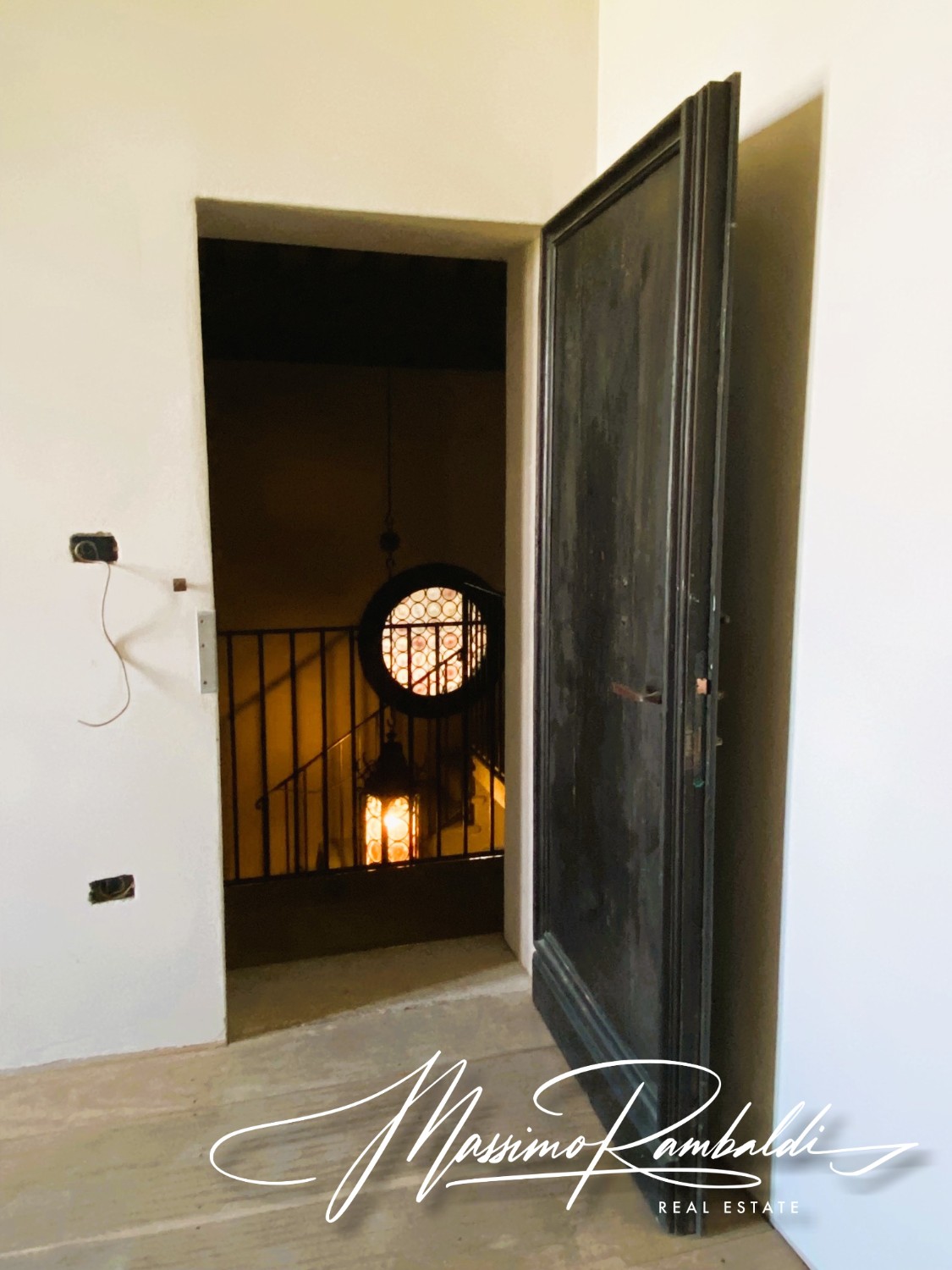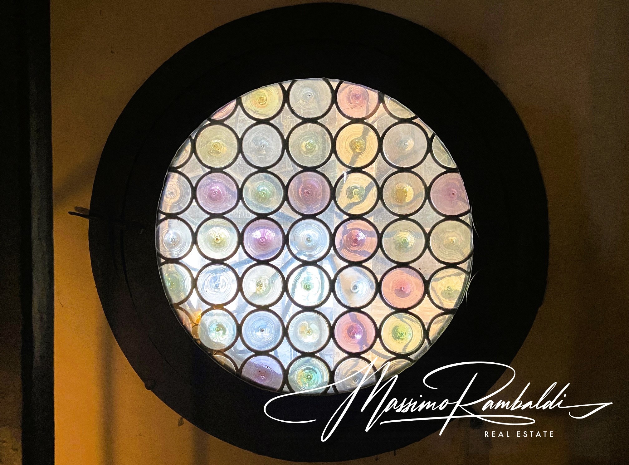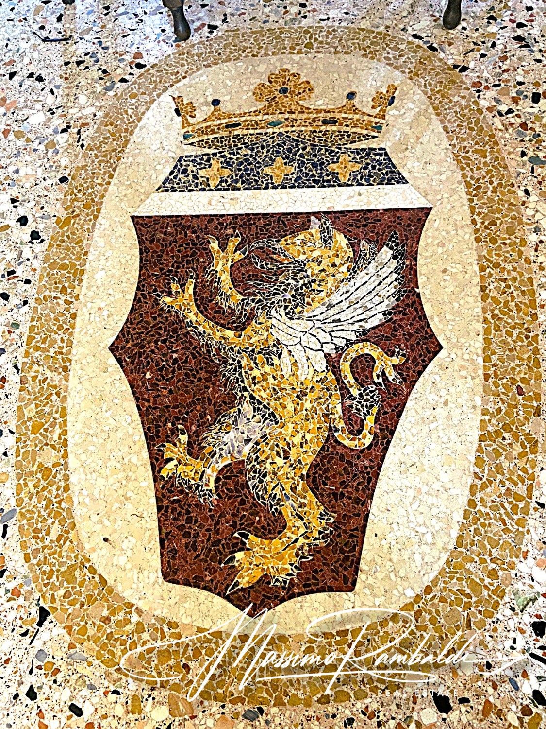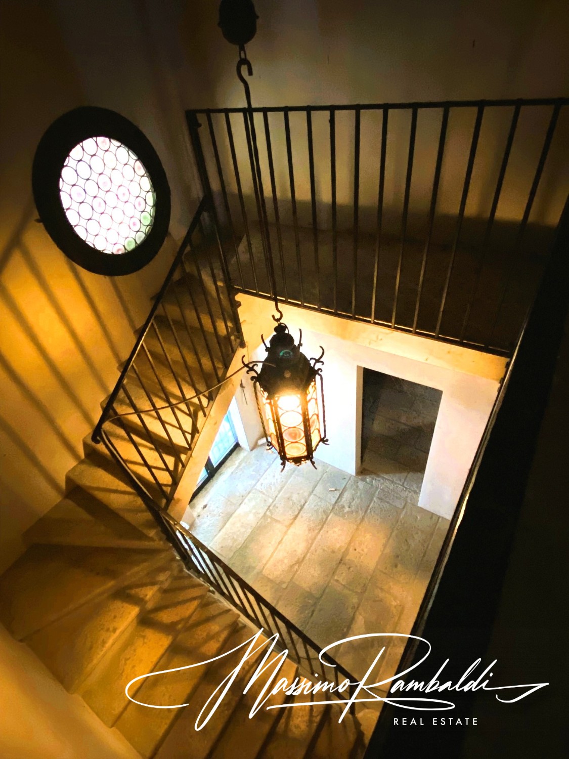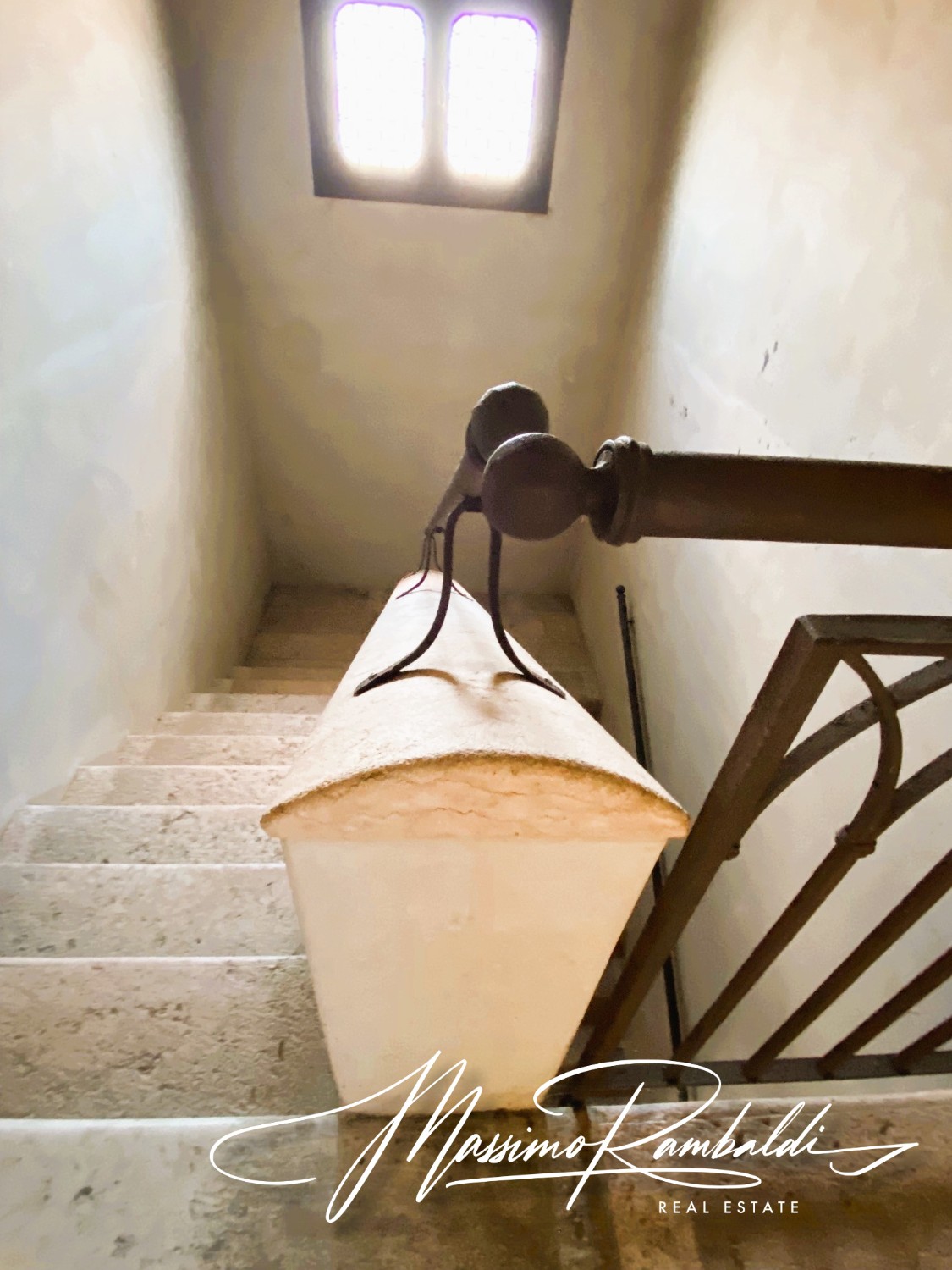 Architectural details and finishes include wrought-iron balconies and railings, walls in polished marmorino, oak and reconstructed stone flooring, a pink Asiago marble staircase with artistic railings, period doors with hand-painted Venetian designs, a Versailles-inspired herringbone oak floor, decorated Venetian glass, and a griffin crest designed by Raffaello tied to the Martelli family.