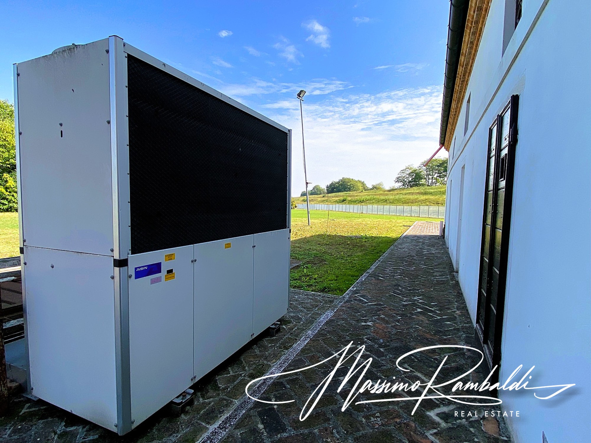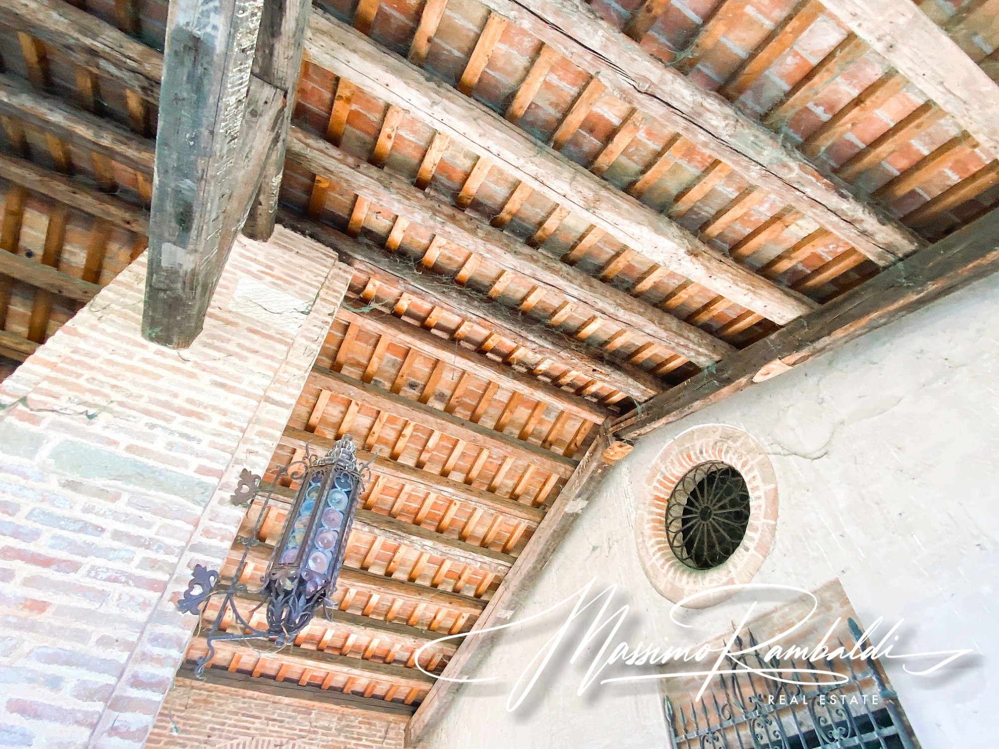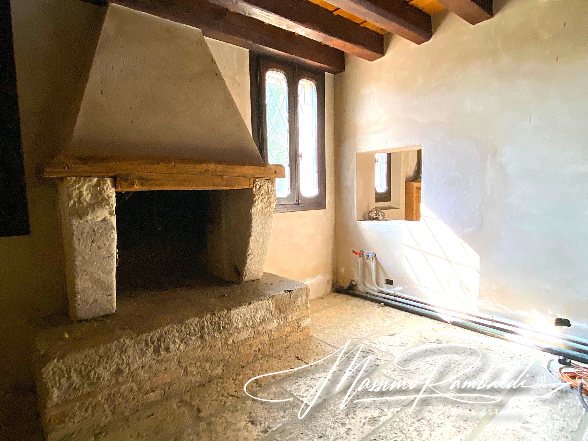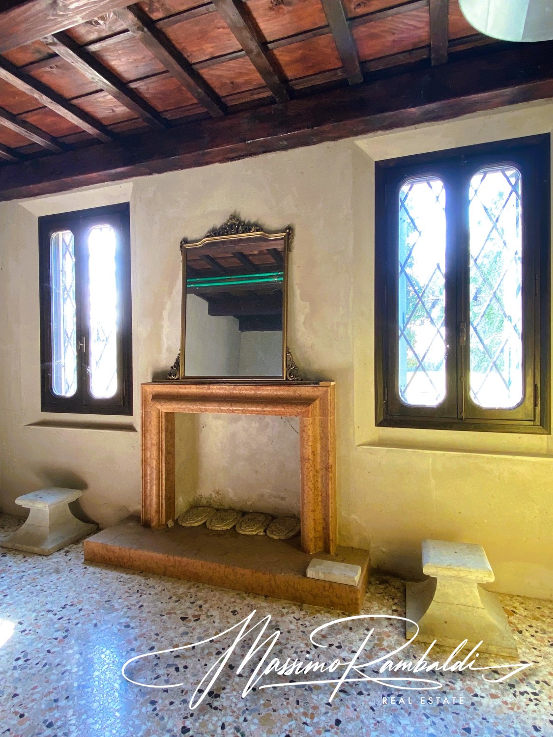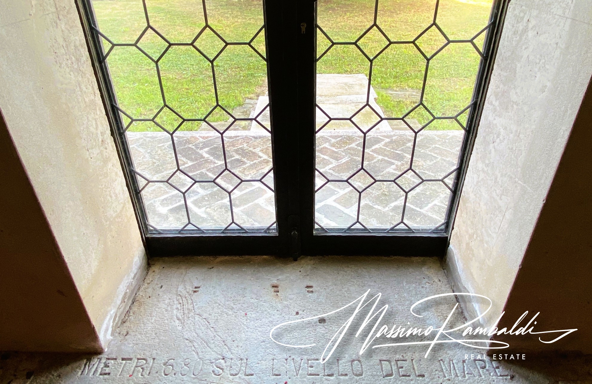 The villa sits on approximately 20,000 m² of land and includes 24 rooms, 8 bedrooms, and 12 bathrooms. It features an internal garage, an annex with a fireplace in local stone and Verona marble, an artesian well, and an original 17th/18th-century icehouse. Modern systems include triple-glass larch windows, mosquito screens, and a new ventilation system.