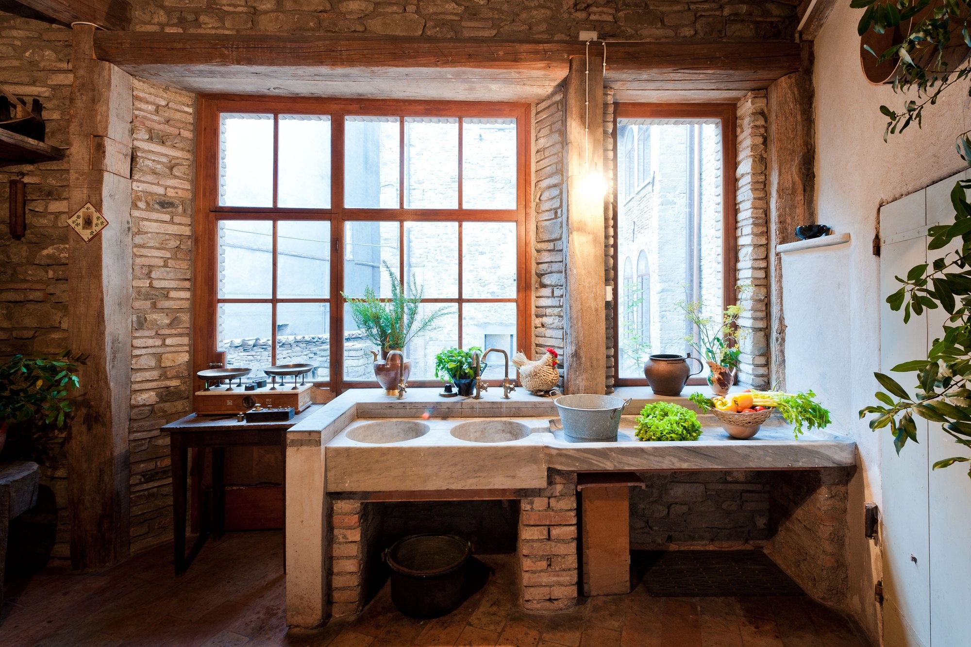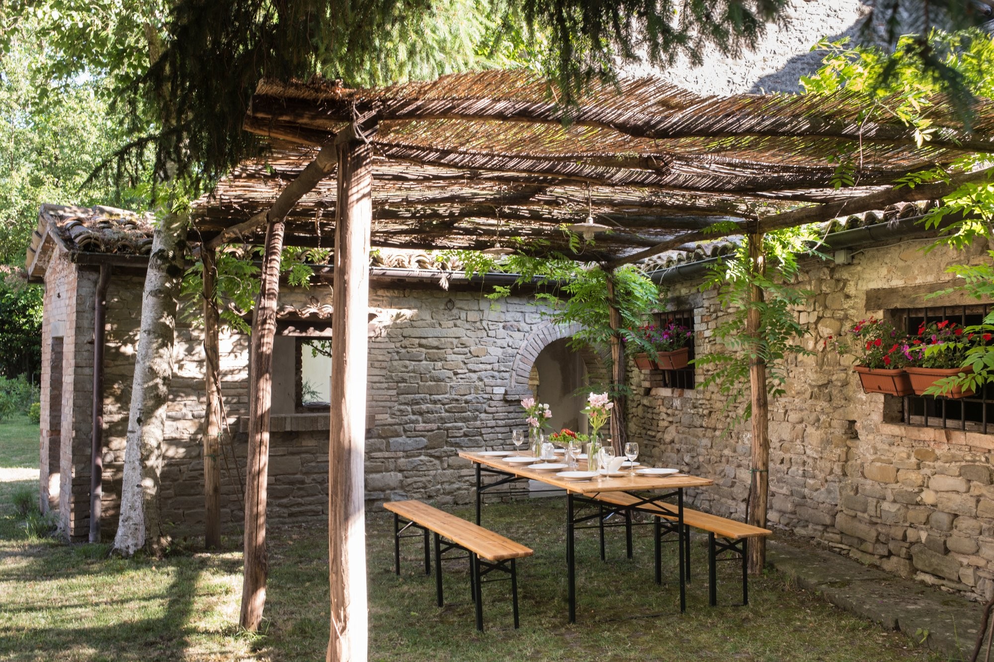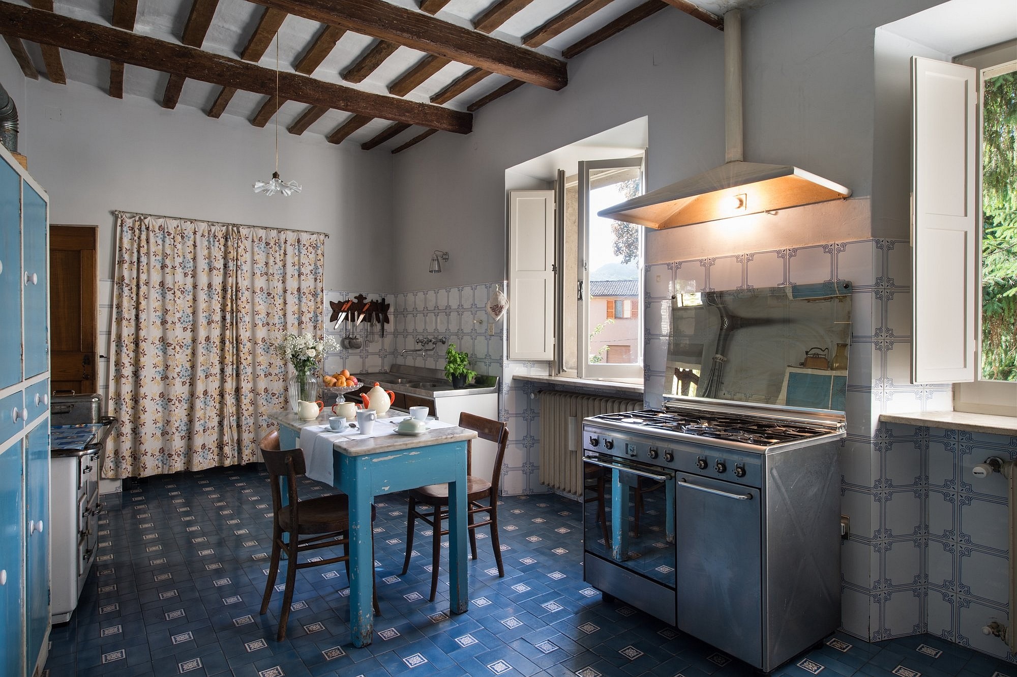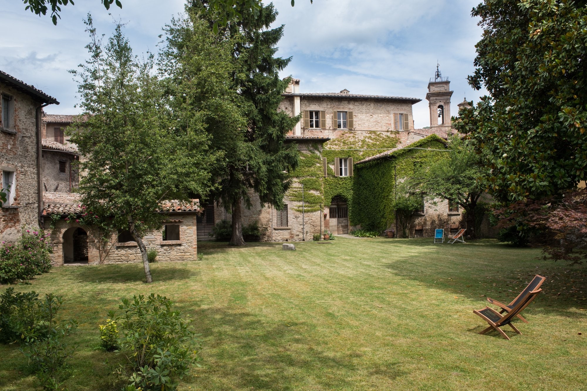 The central courtyard garden offers a peaceful retreat with roses, citrus trees, a pergola, and an antique fountain. Small balconies and panoramic windows provide views over the village and the surrounding Apennine hills, seamlessly connecting the indoor and outdoor living areas.
