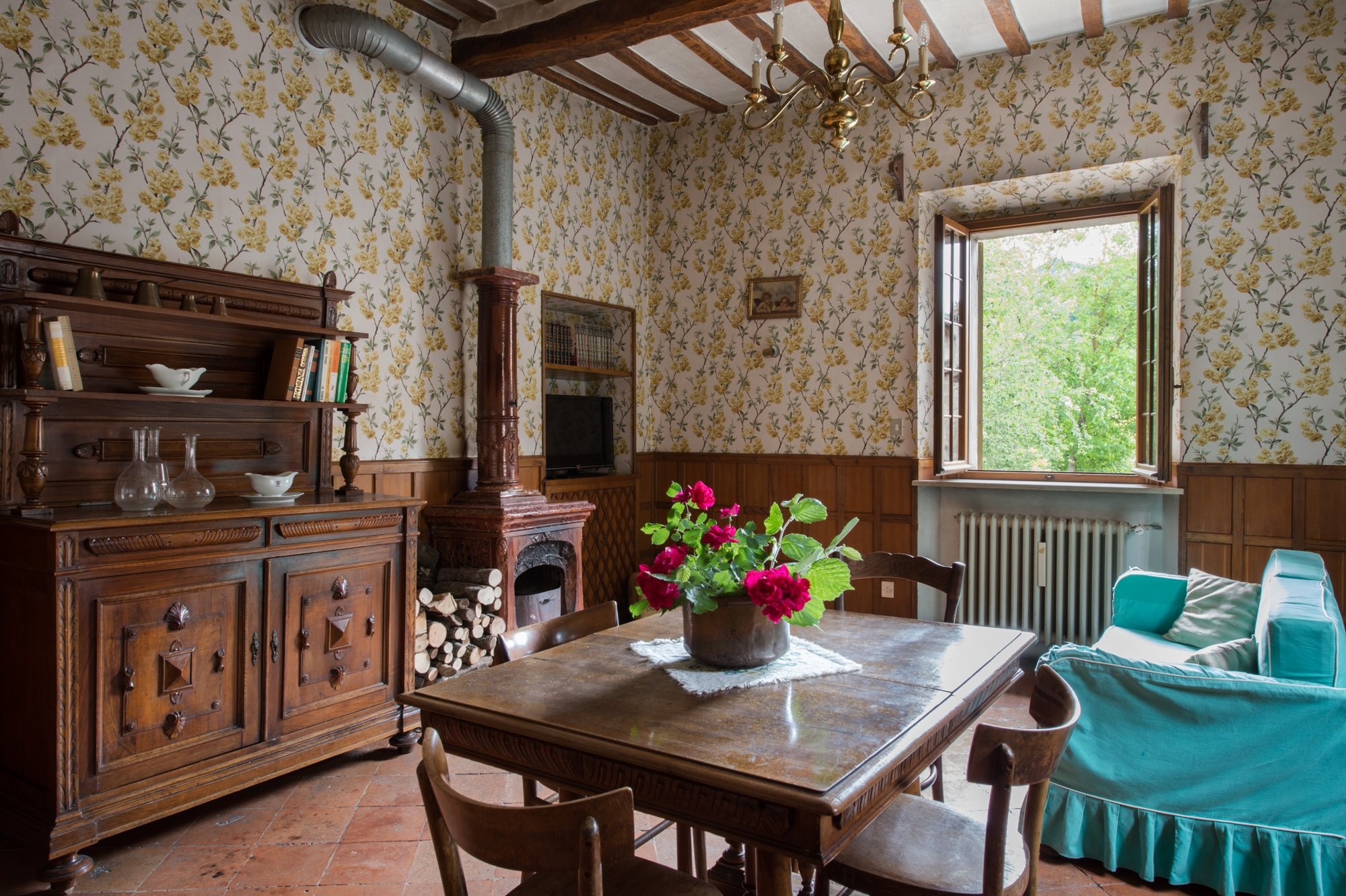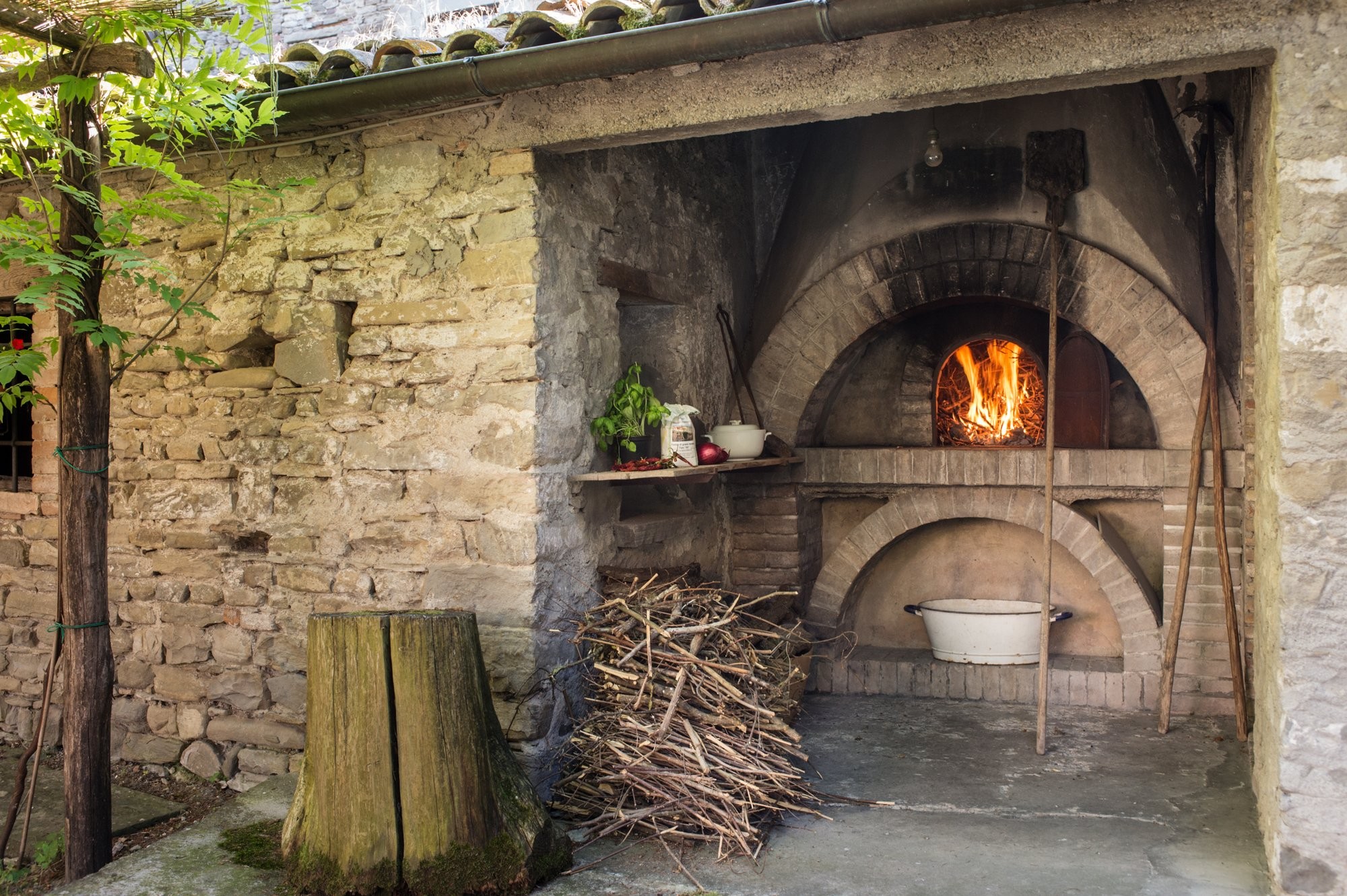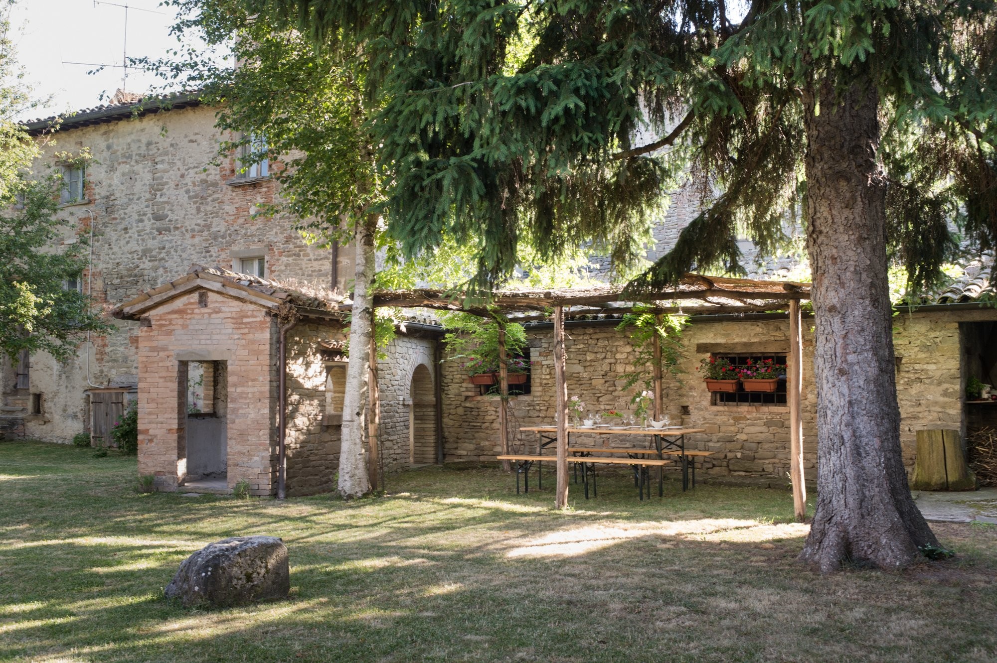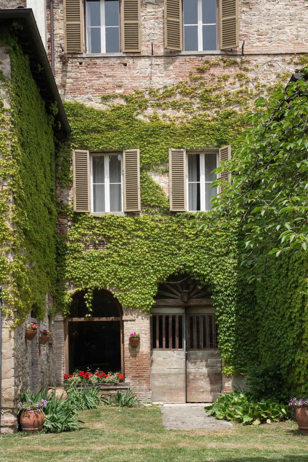The central courtyard garden offers a peaceful retreat with roses, citrus trees, a pergola, and an antique fountain. Small balconies and panoramic windows provide views over the village and the surrounding Apennine hills, seamlessly connecting the indoor and outdoor living areas.
