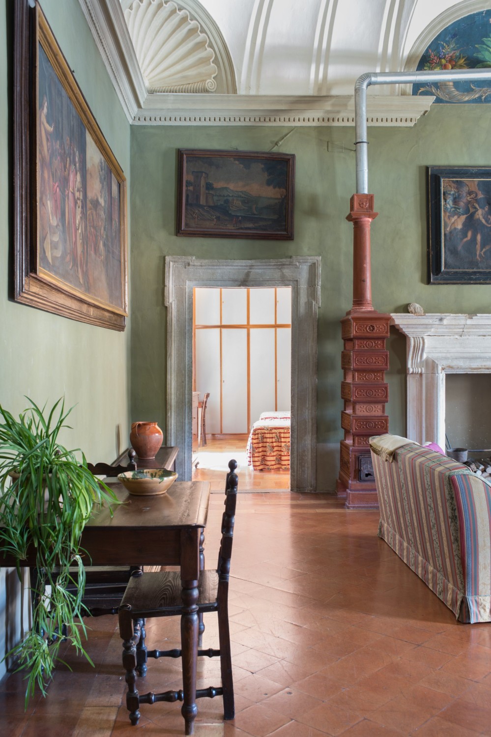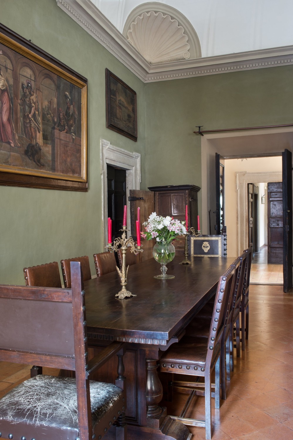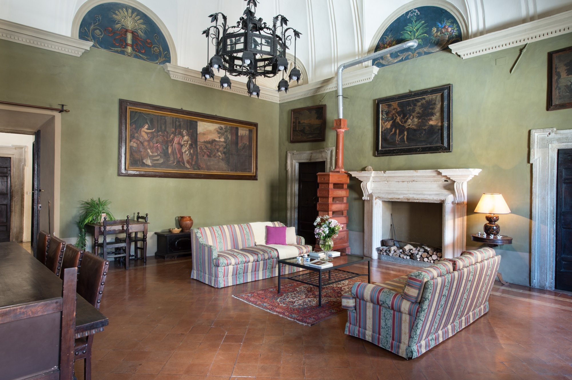 The left wing houses the piano nobile, adorned with original Renaissance decorations, high hand-painted frescoes, and walls that have witnessed over 500 years of Italian history. The right wing spans two floors, offering spacious living areas that blend historic character with modern comforts. Natural light streams through tall windows, highlighting arched doorways, decorative cornices, and carved doors – each element reflecting the residence’s noble heritage.