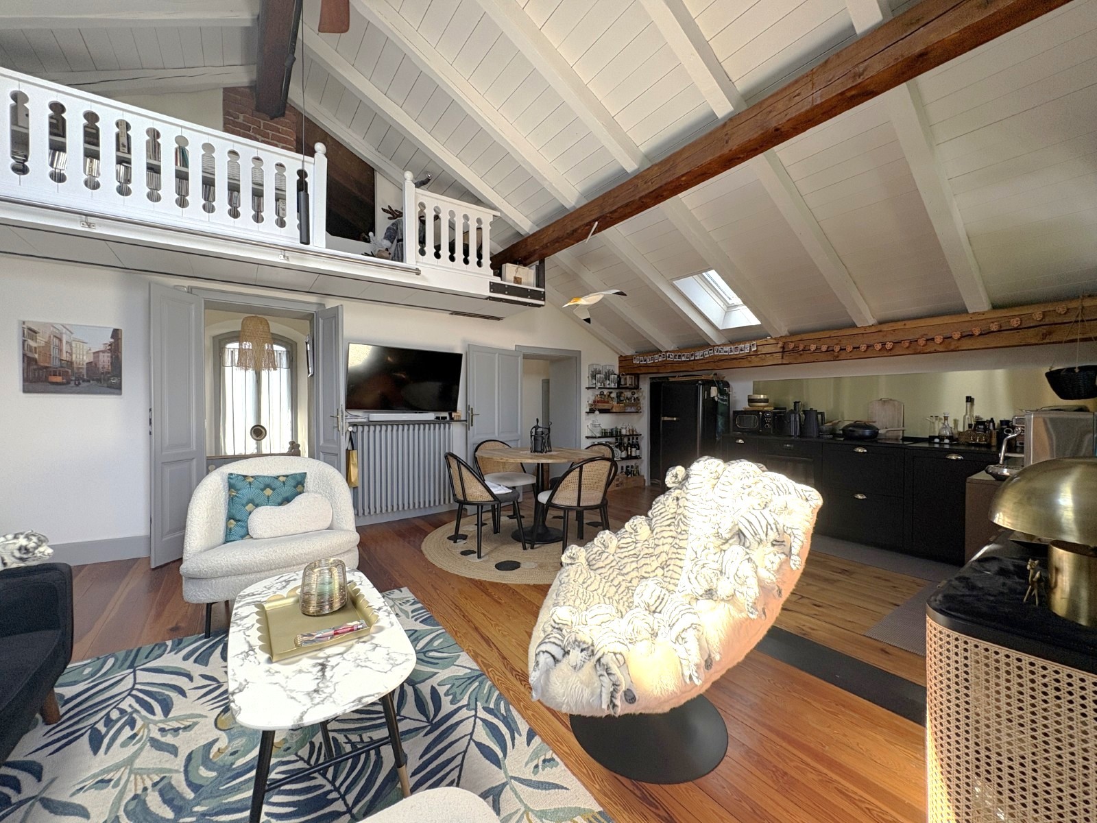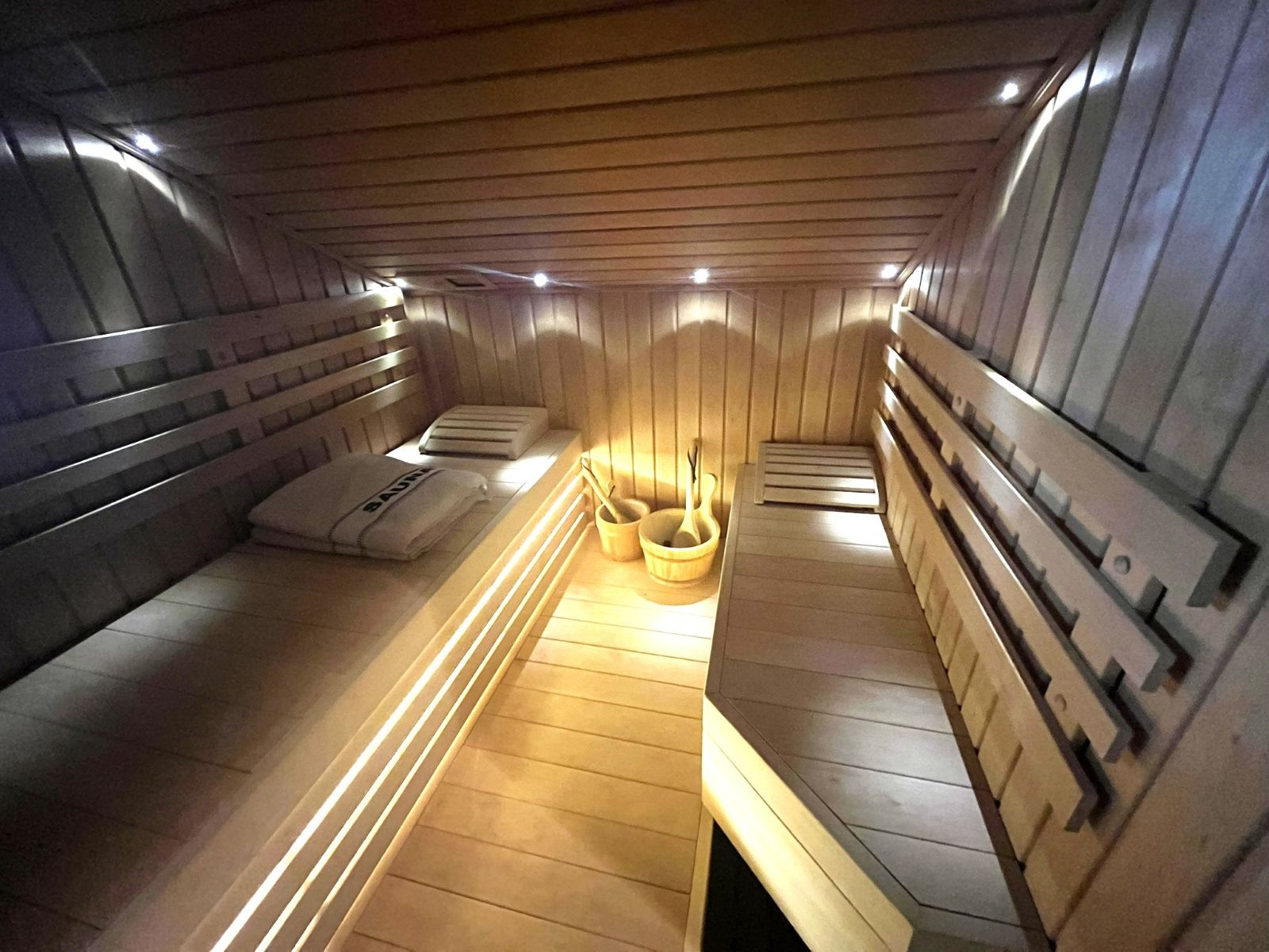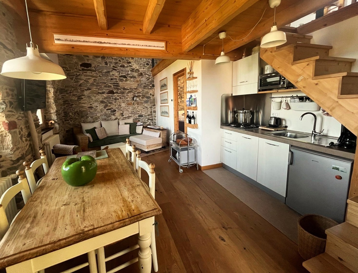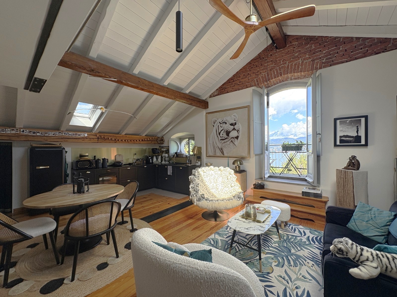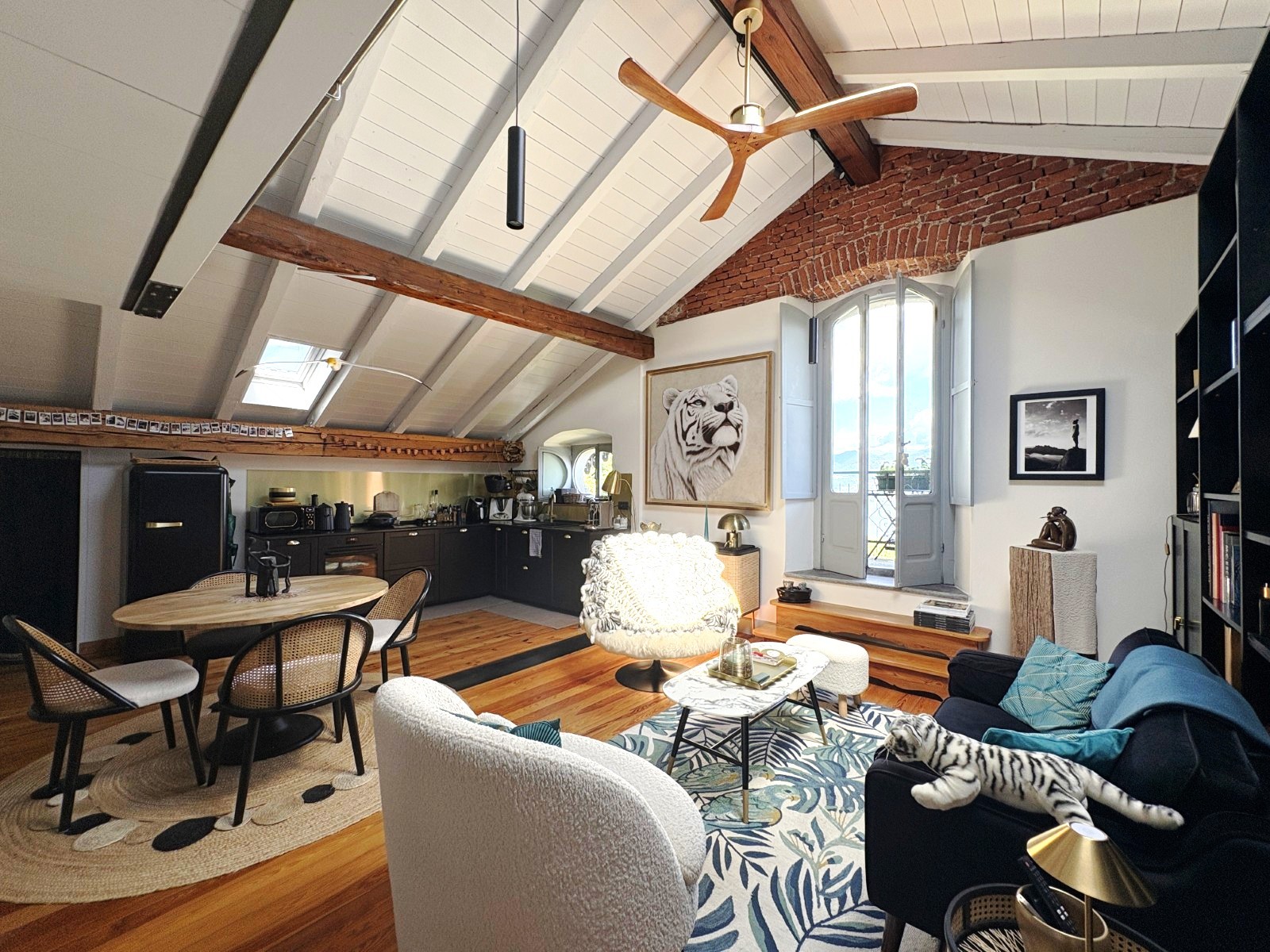 Independent apartment with exposed wooden beams, balcony with lake view, open living/dining area with kitchen, two bedrooms, bathroom, private sauna, and additional loft space.