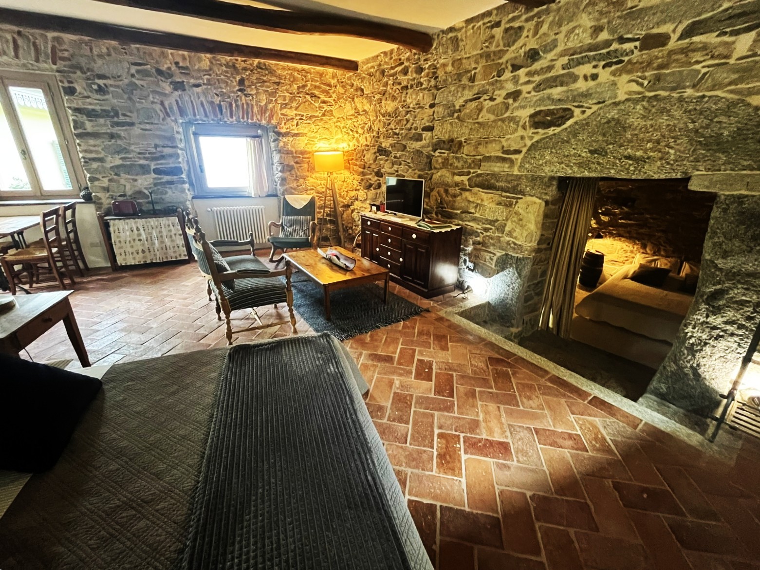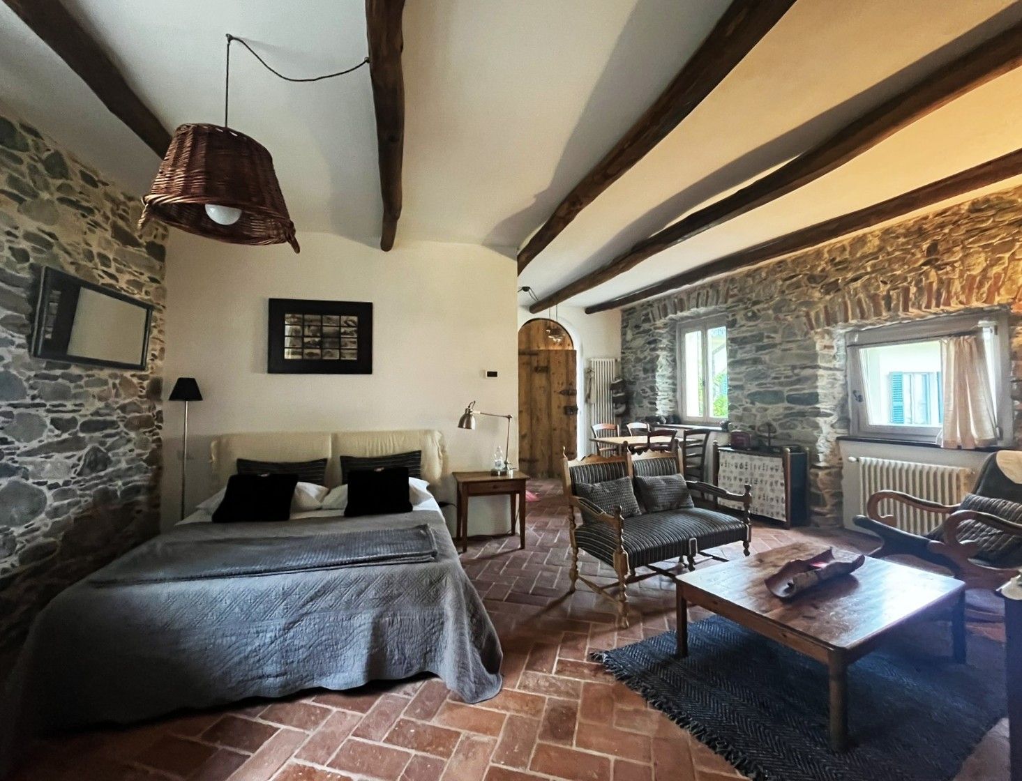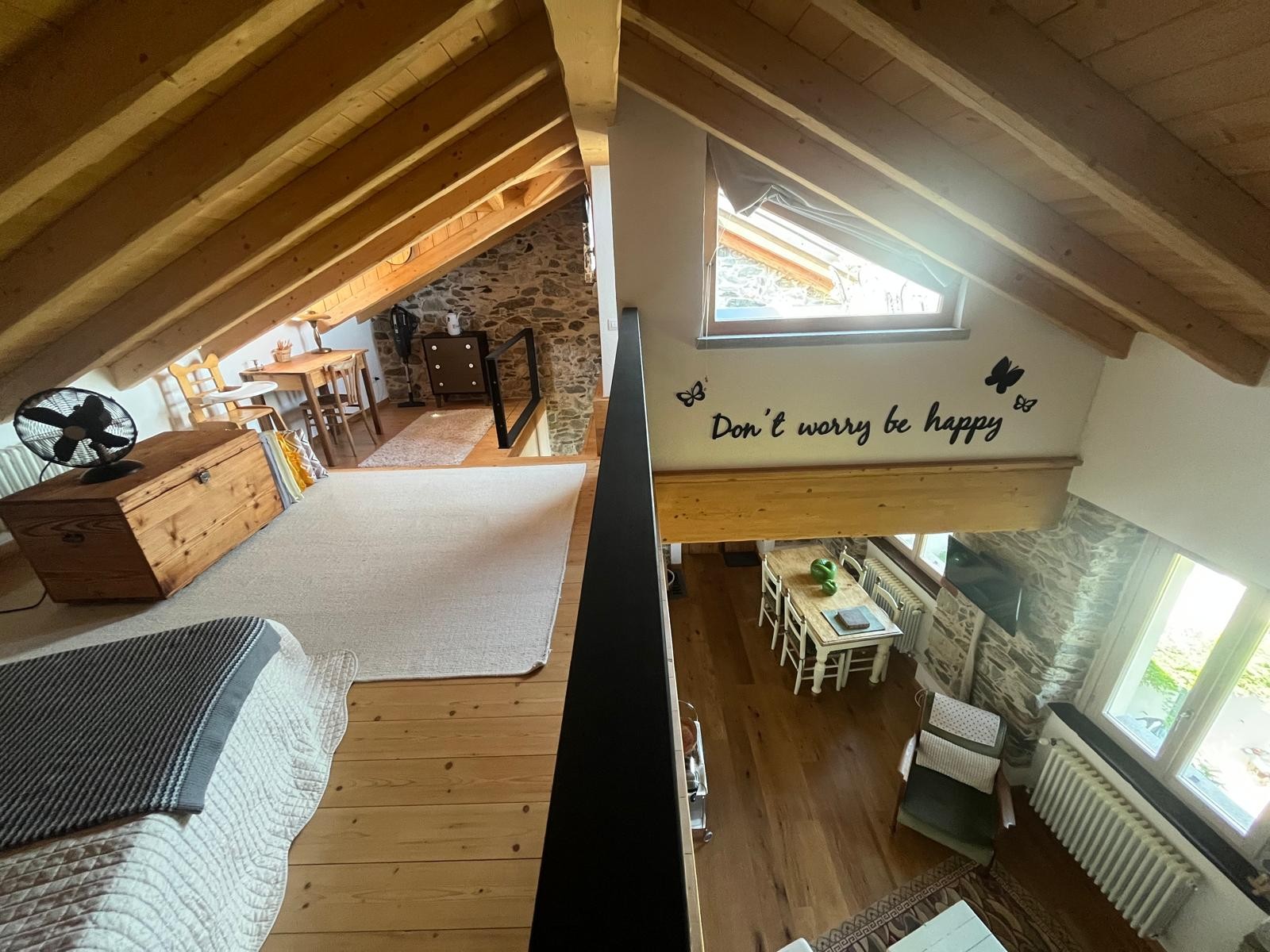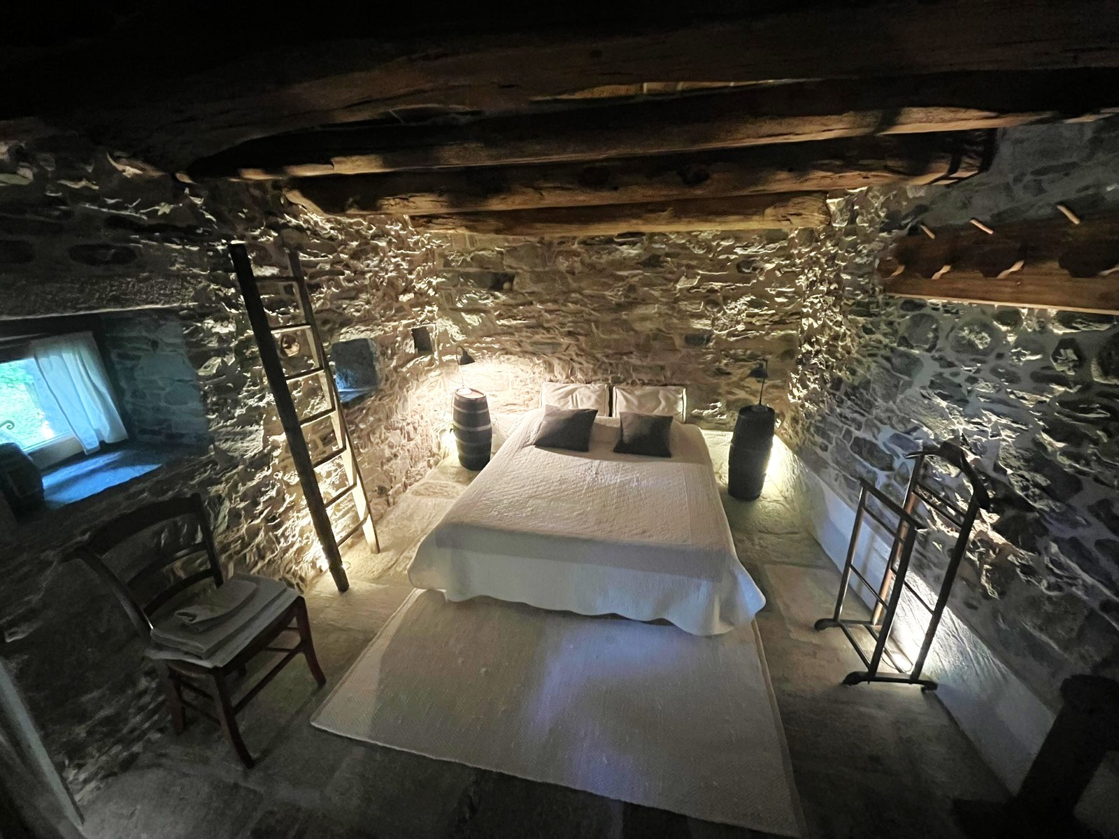 Two units – ground floor: studio with bathroom and natural grotto; upper floor: loft with stone walls, living area, kitchen, bedroom, bathroom, gallery, and panoramic terrace with lake view.