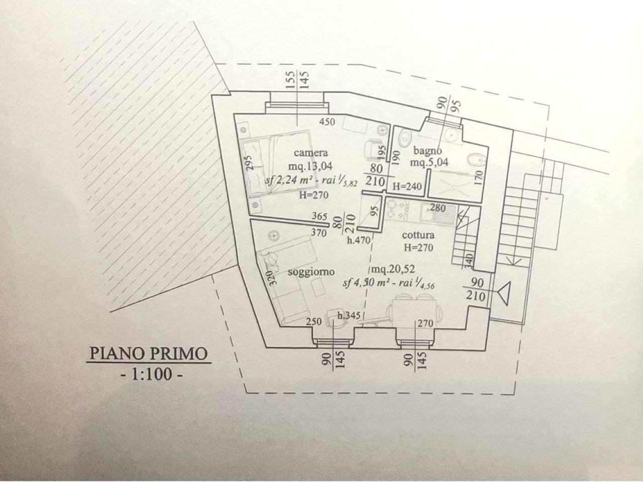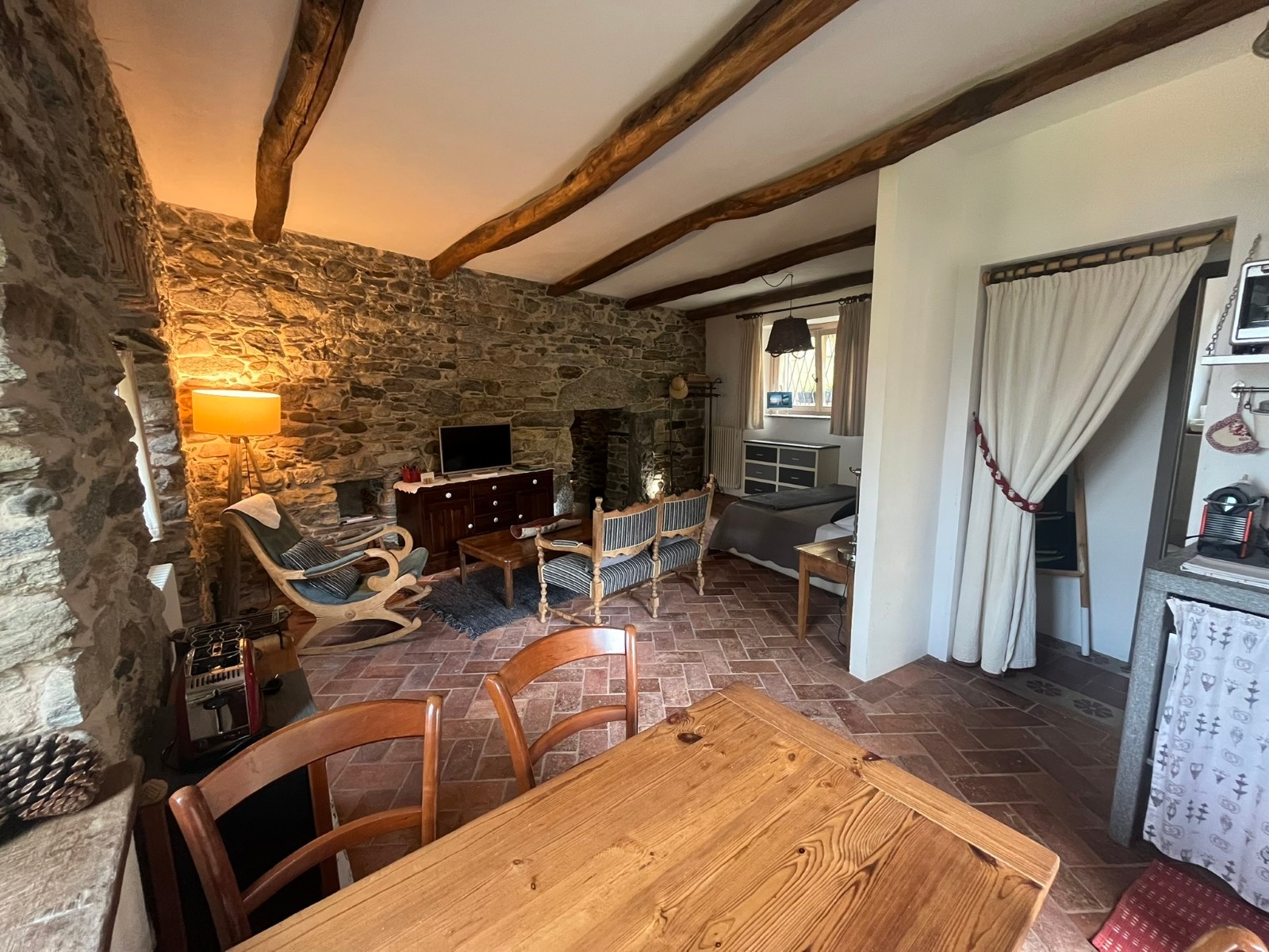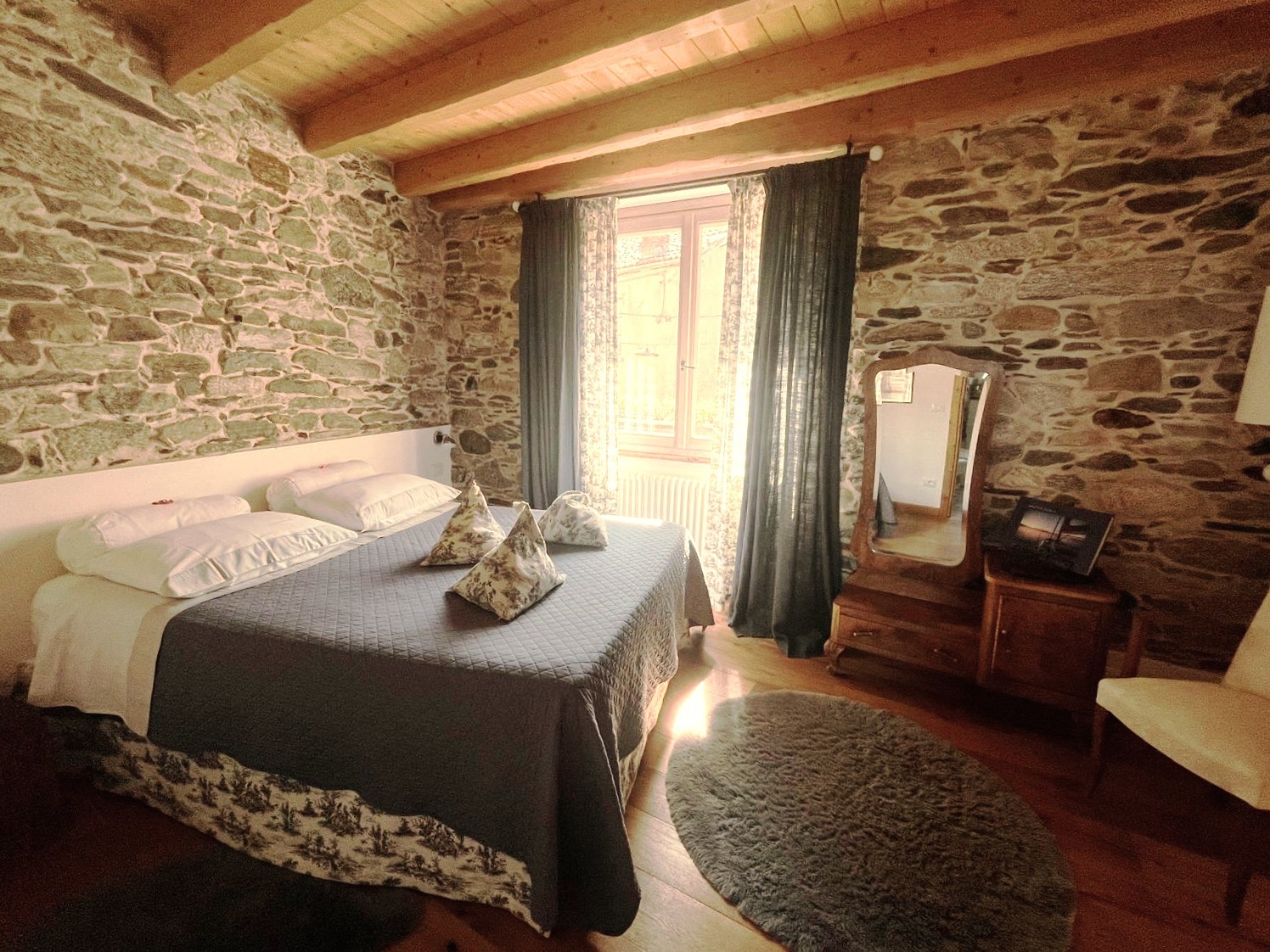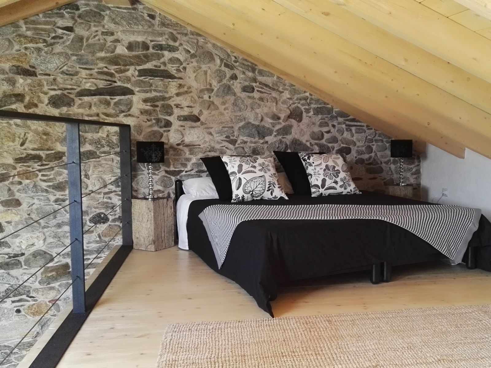 Two units – ground floor: studio with bathroom and natural grotto; upper floor: loft with stone walls, living area, kitchen, bedroom, bathroom, gallery, and panoramic terrace with lake view.