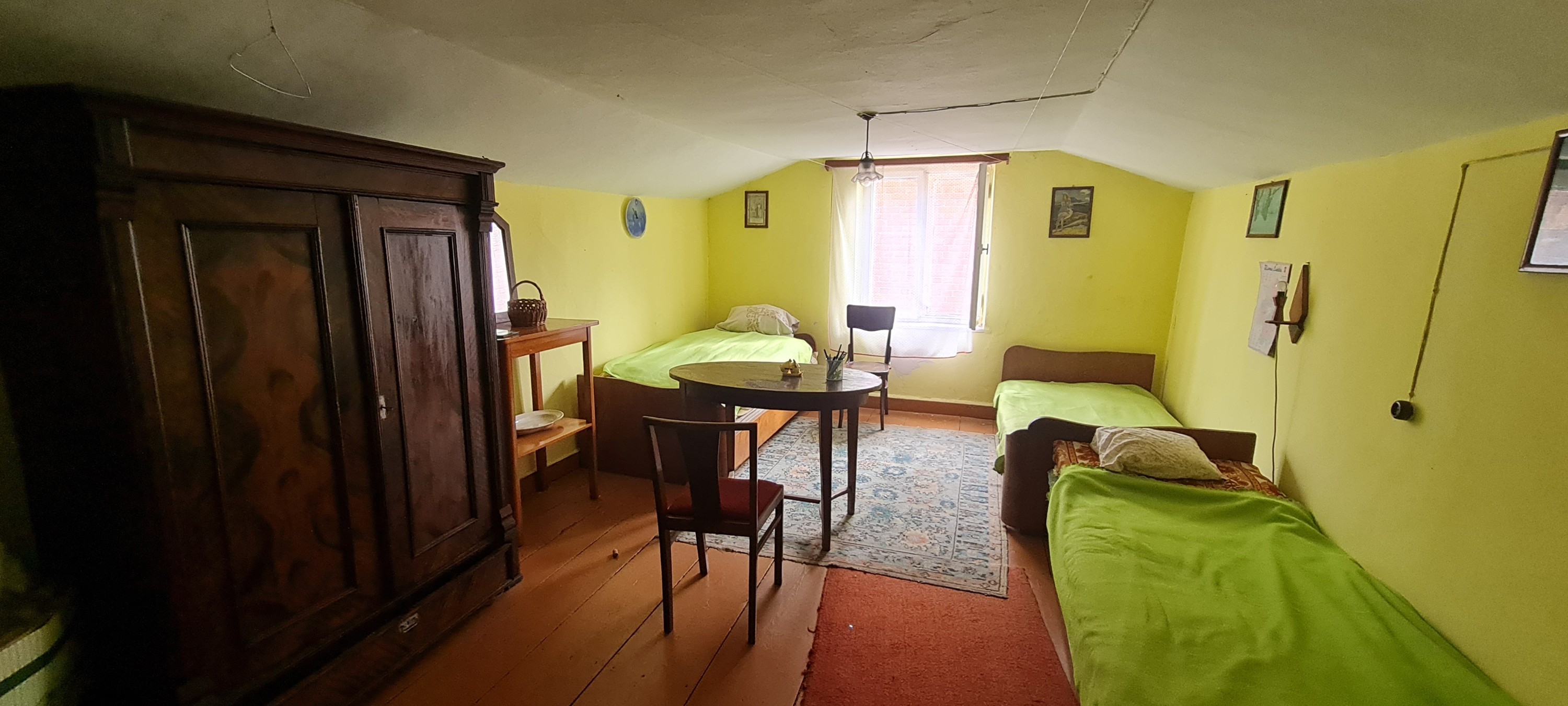 Built in 1920, the house was originally designed as a school with teacher housing. It is constructed of solid brick masonry with plastered and painted facades. Listed in the municipal register of historic buildings, it retains original details such as cornices, wooden staircases, and lofty 3.5-meter ceilings. The steep gable roof with wooden structure has already been renovated and is covered with sheet metal tiles.