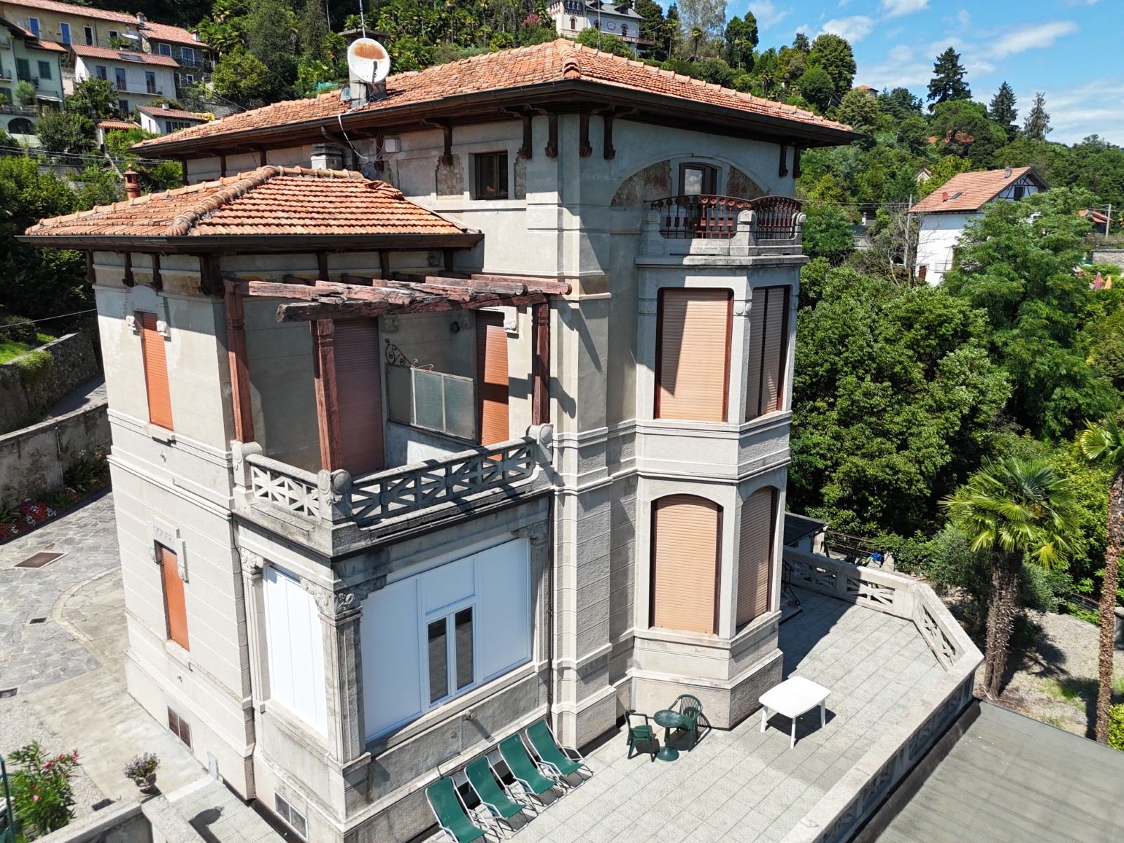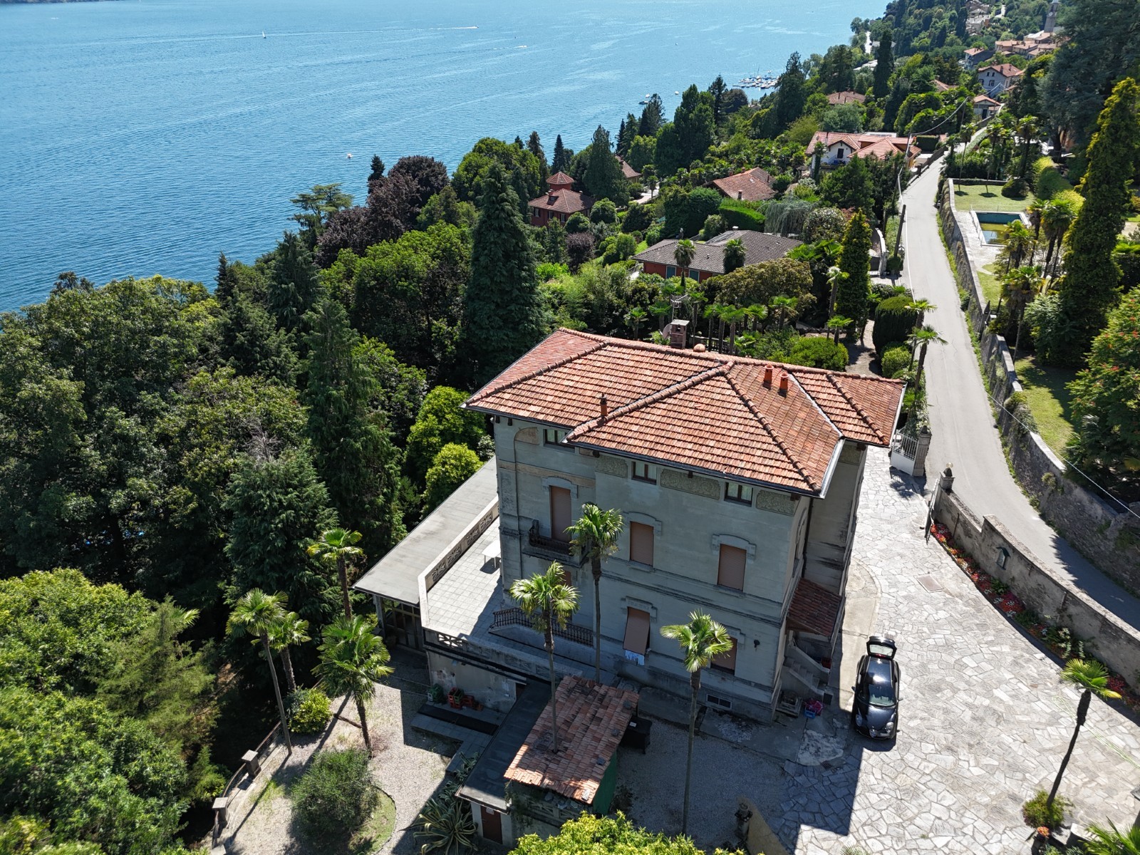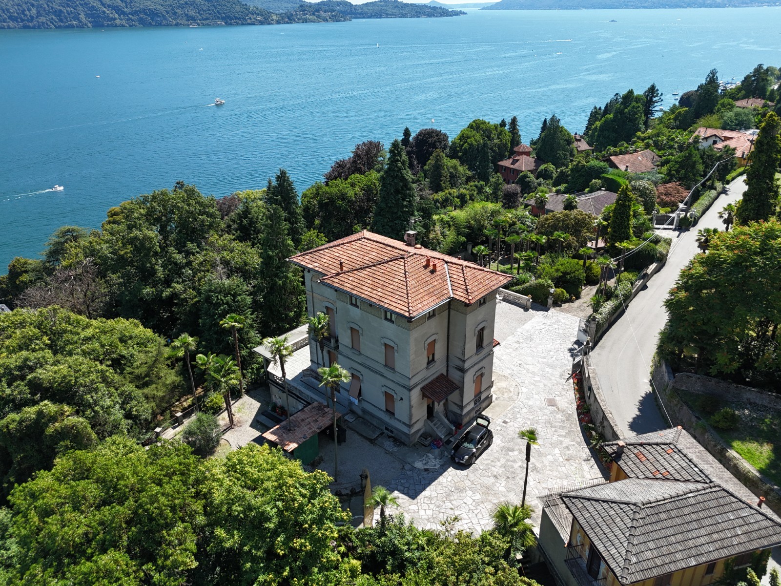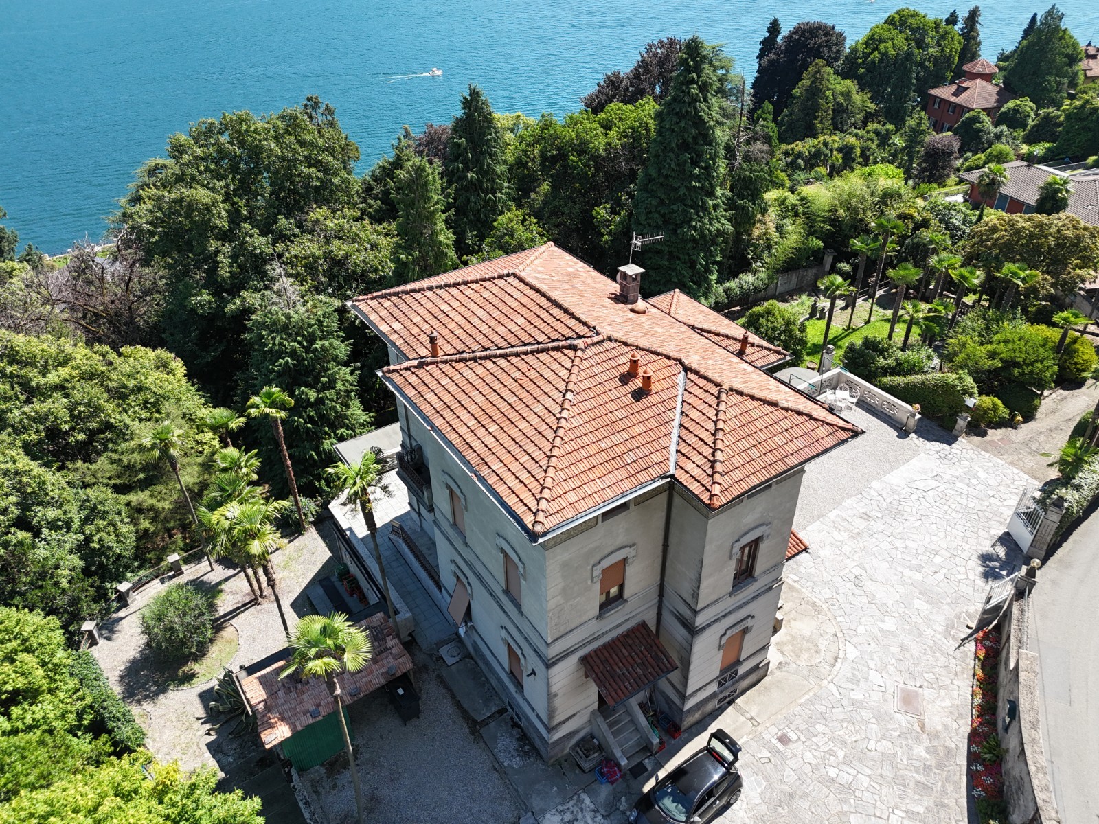 In the hamlet of Frino, in the municipality of Ghiffa, stands this 1930s villa on the shores of Lake Maggiore. The house extends over four floors and currently has nine apartments, common areas, a commercial kitchen and an outbuilding with an area of 100 square meters.