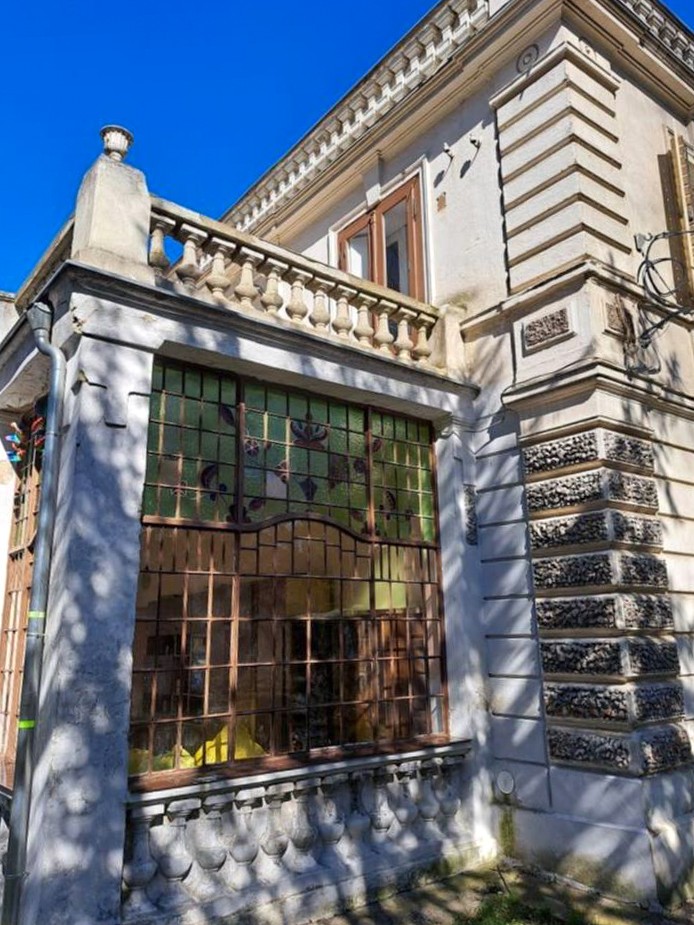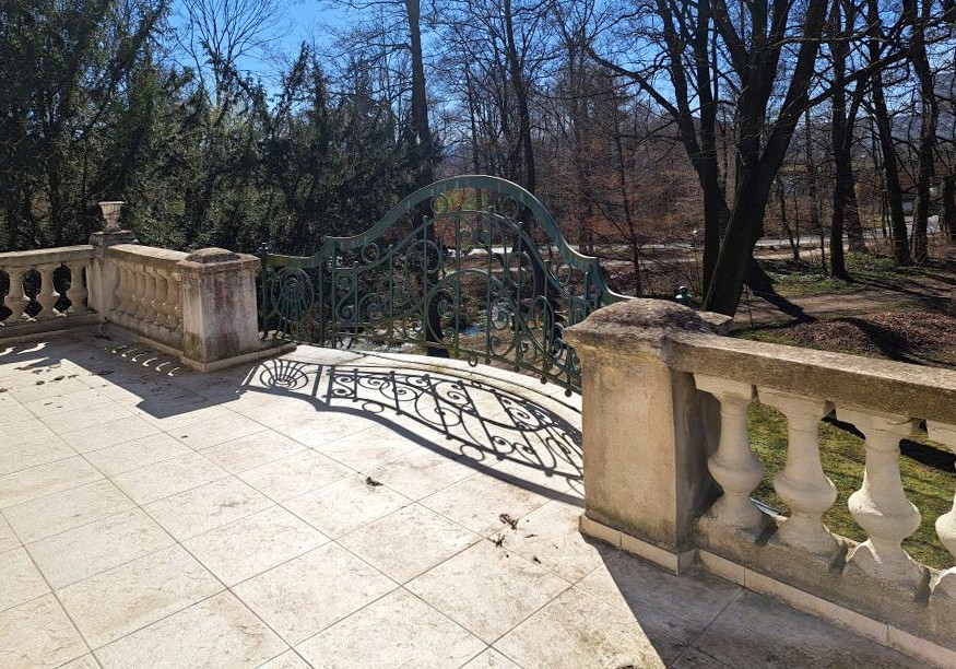 A monumental entrance gate from 1870 marks the access to the park. The property is enclosed partly by a 1.10 m stone wall and partly by a damaged chain-link fence set on a stone base.