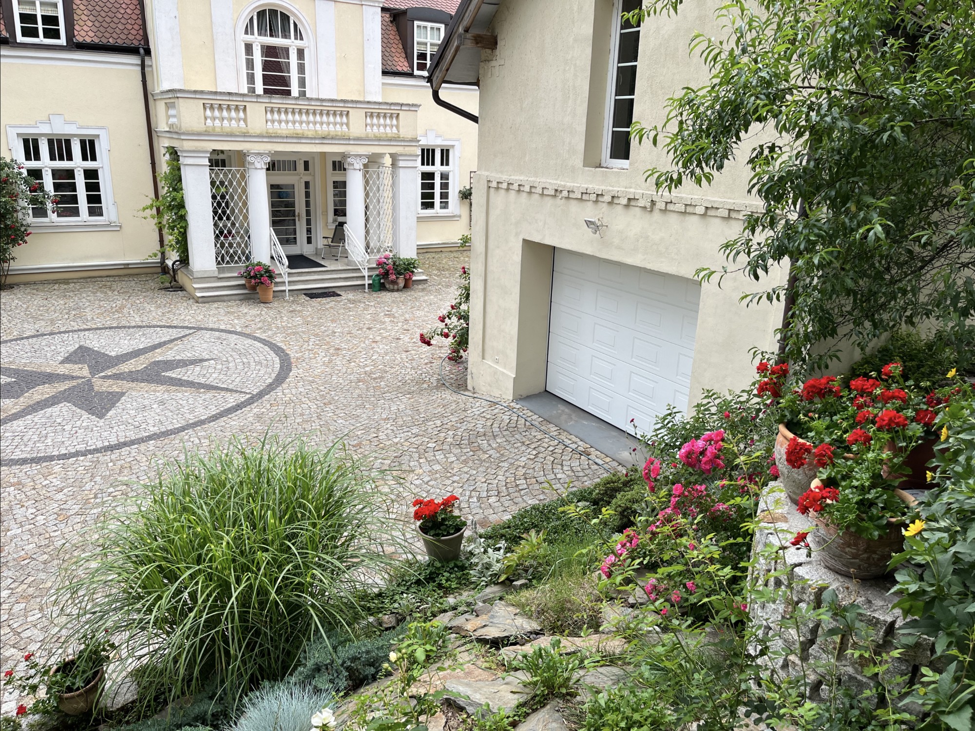 A columned portico with a balcony defines the entrance, while the façades are adorned with architectural details such as cornices, pilasters and decorative window frames. Above the balcony rises a curved gable richly decorated with stucco work and a central cartouche.