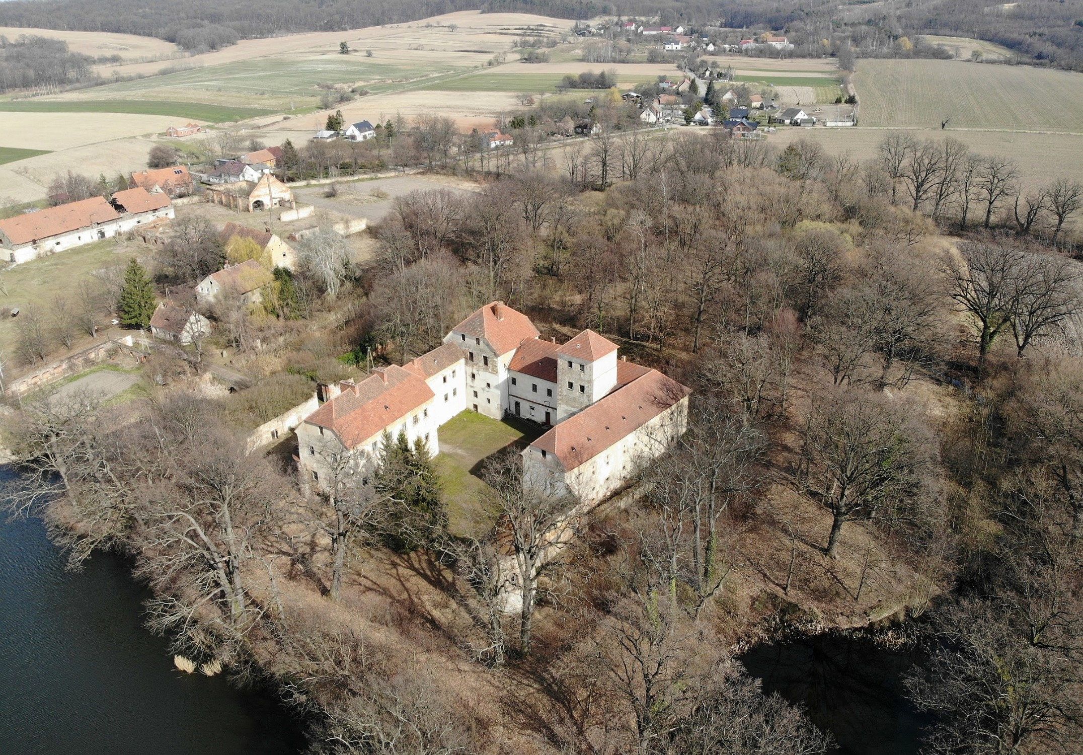 Between the outer castle moat and the outer stone defensive wall, which encloses the entire complex, lies the estate, park, and meadows.