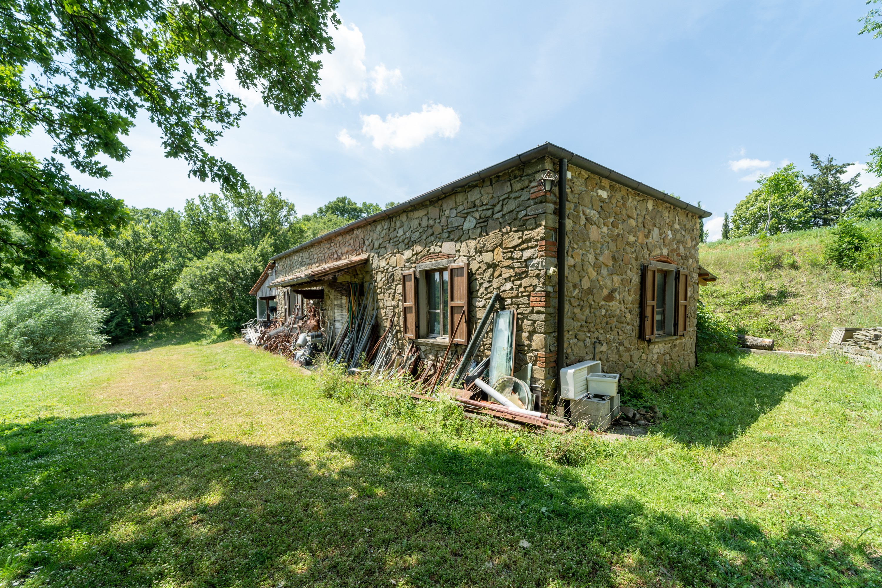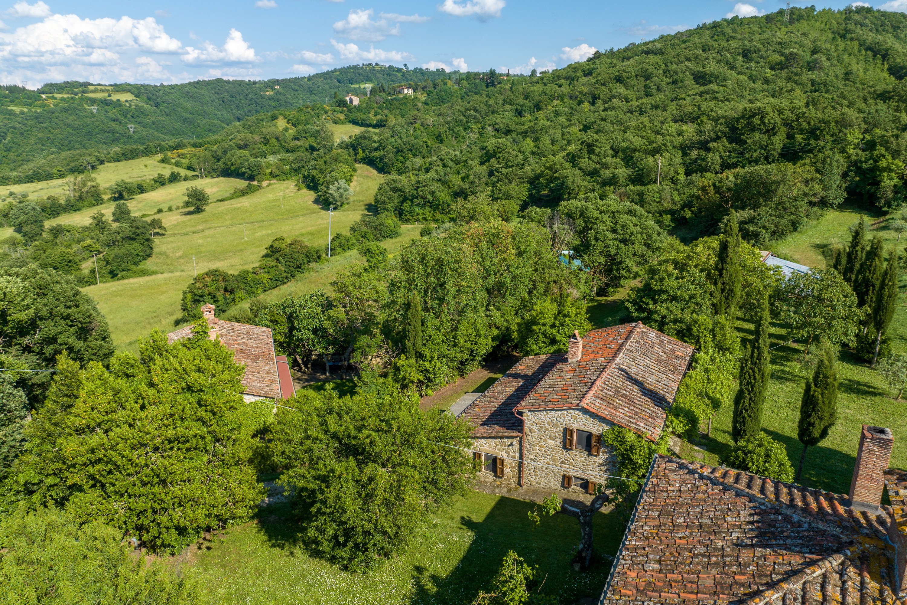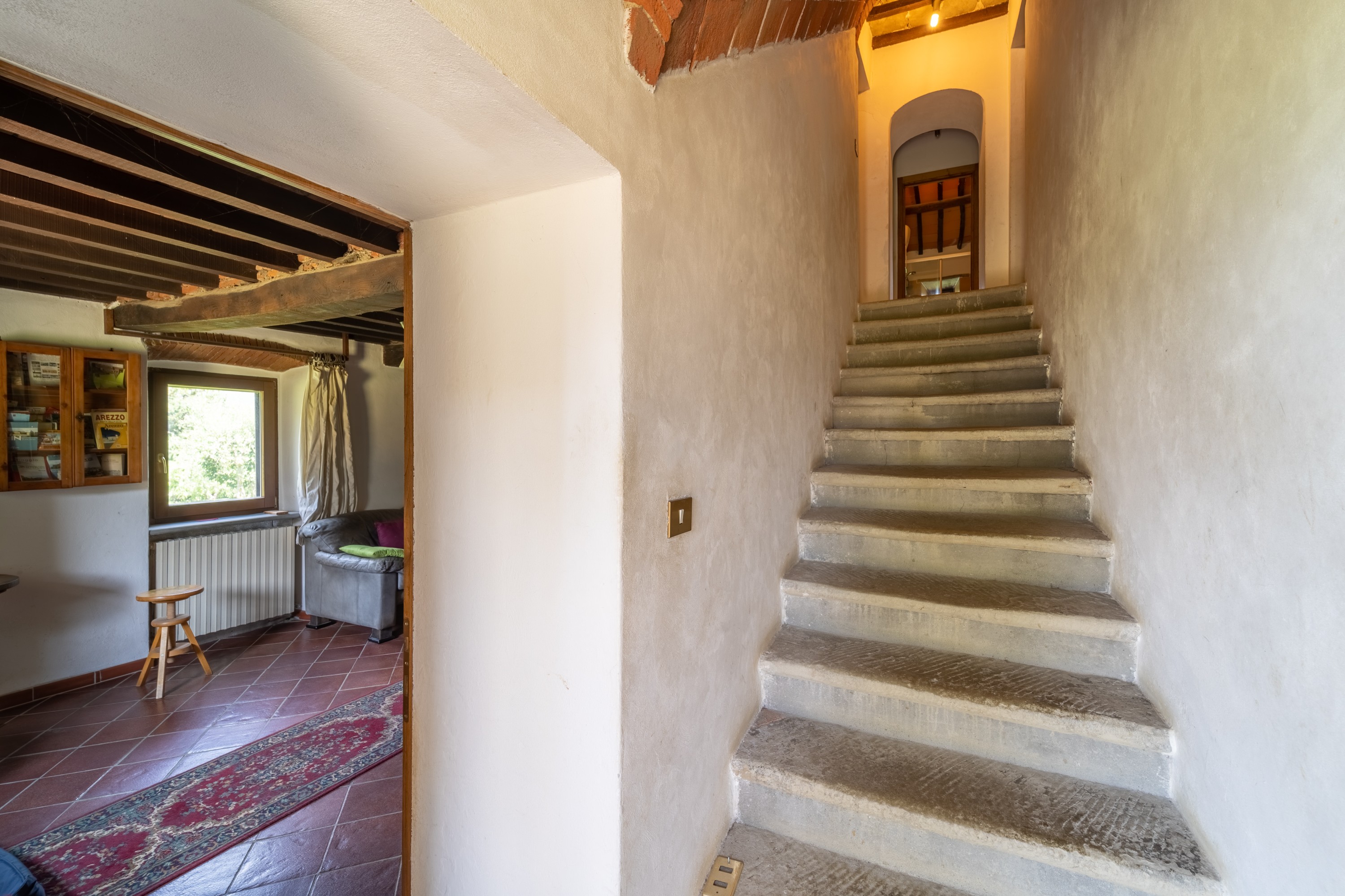The main house has two floors. On the ground level, there is a large kitchen with dining area, a living room with fireplace, a study and a bathroom. Upstairs are four bedrooms and another bathroom. The house is in livable condition, though certain upgrades could enhance comfort and efficiency. The windows offer wide views across the Arno Valley.