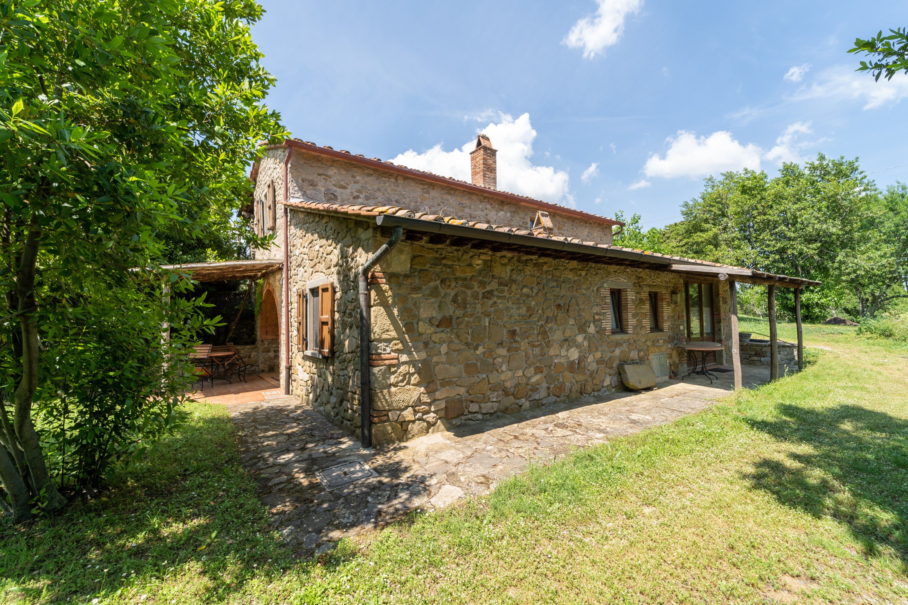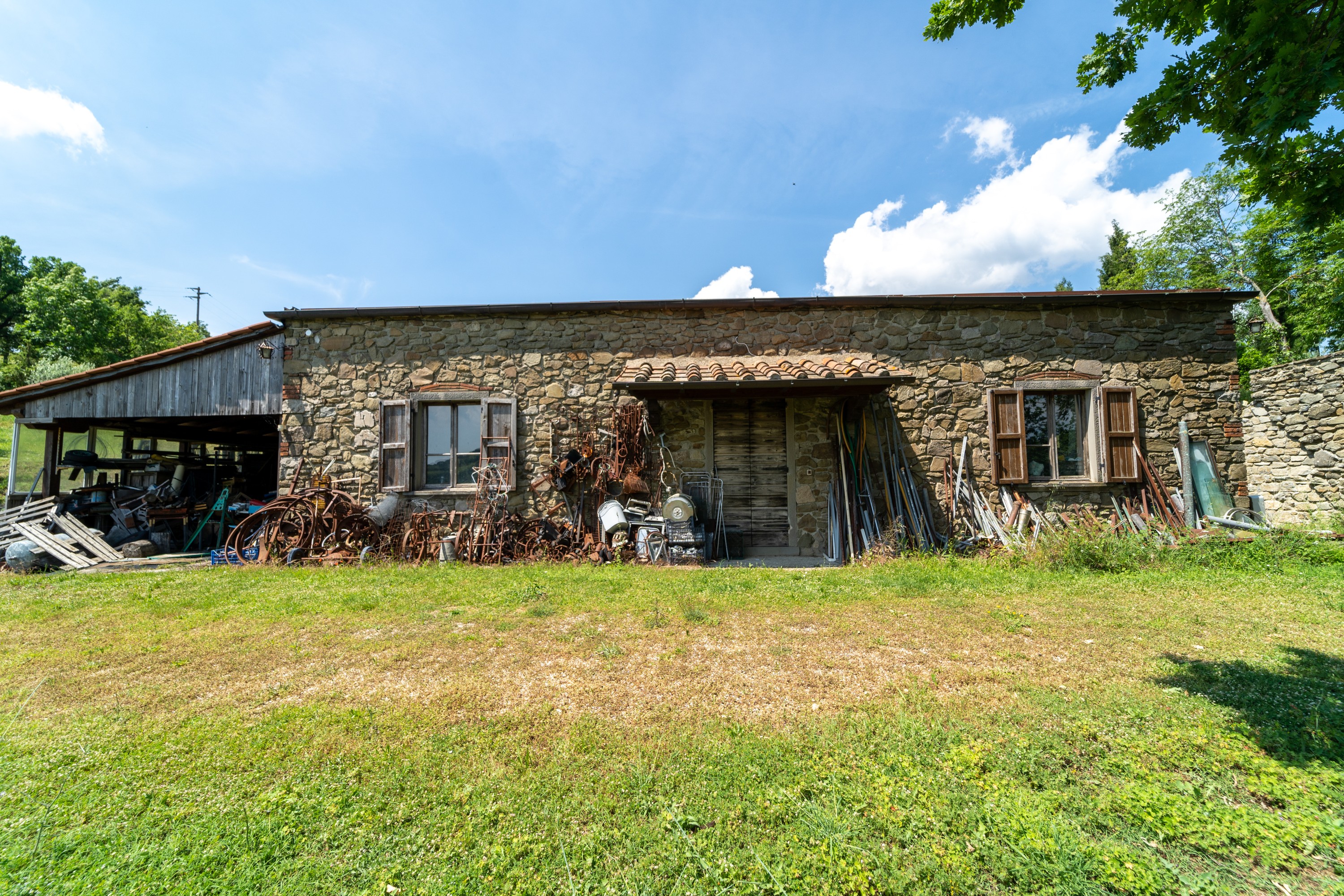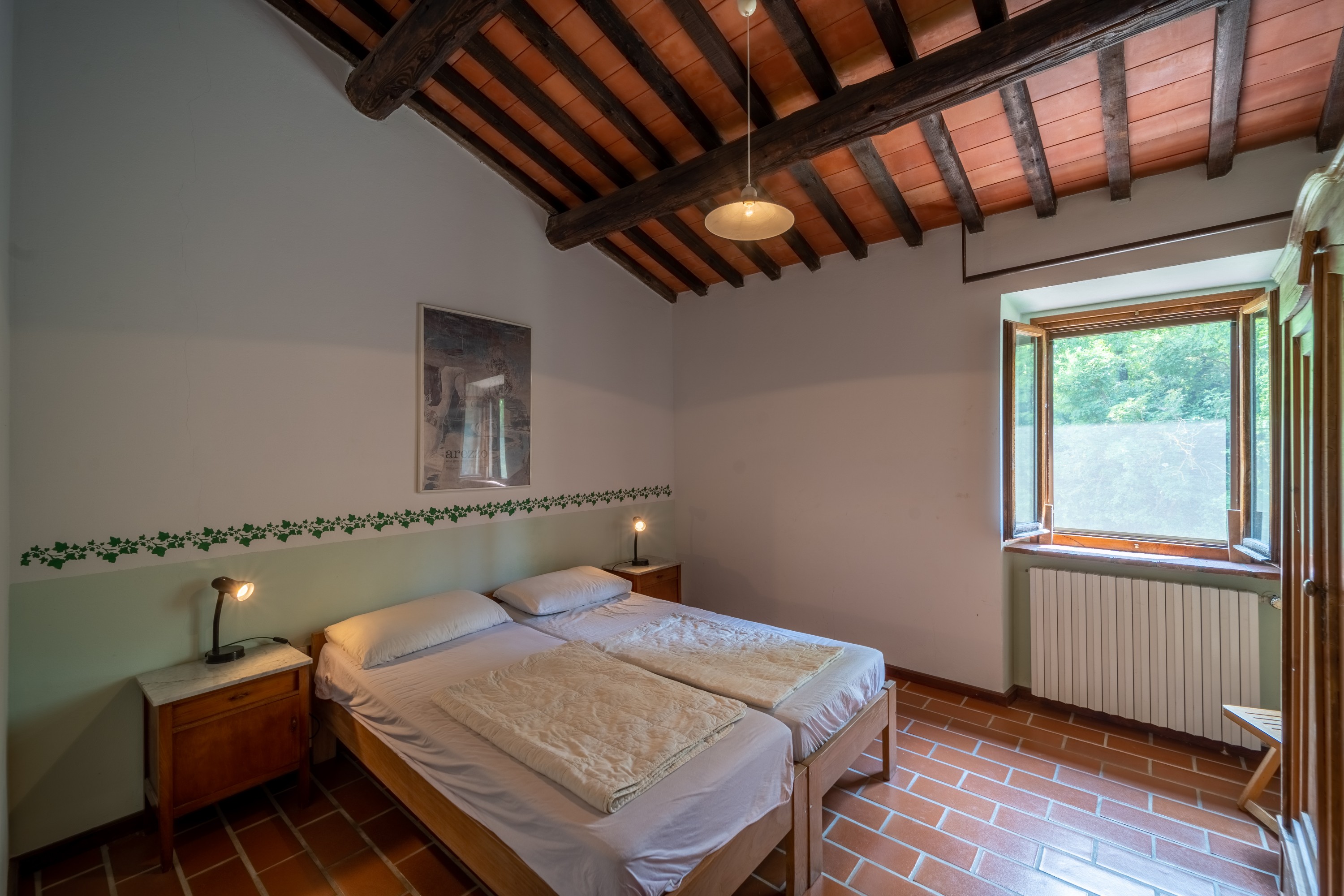 The main house has two floors. On the ground level, there is a large kitchen with dining area, a living room with fireplace, a study and a bathroom. Upstairs are four bedrooms and another bathroom. The house is in livable condition, though certain upgrades could enhance comfort and efficiency. The windows offer wide views across the Arno Valley.