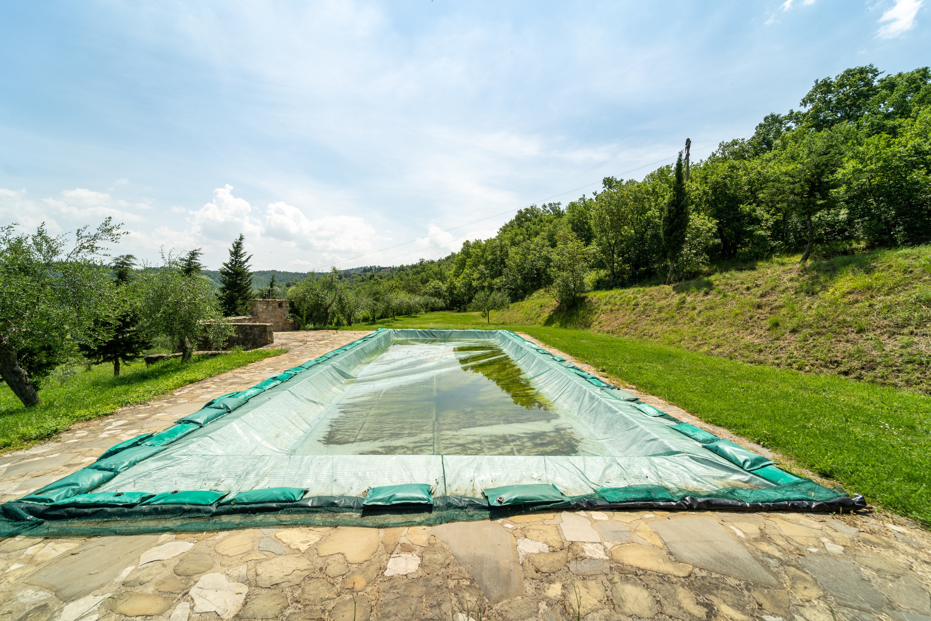 A 14 x 5 meter pool is set on the property, with a dedicated technical room for the pump and filtration system. About 500 meters from the main buildings stands a large barn of approximately 226 m², currently used for farm equipment but suitable for conversion into stables or other uses.