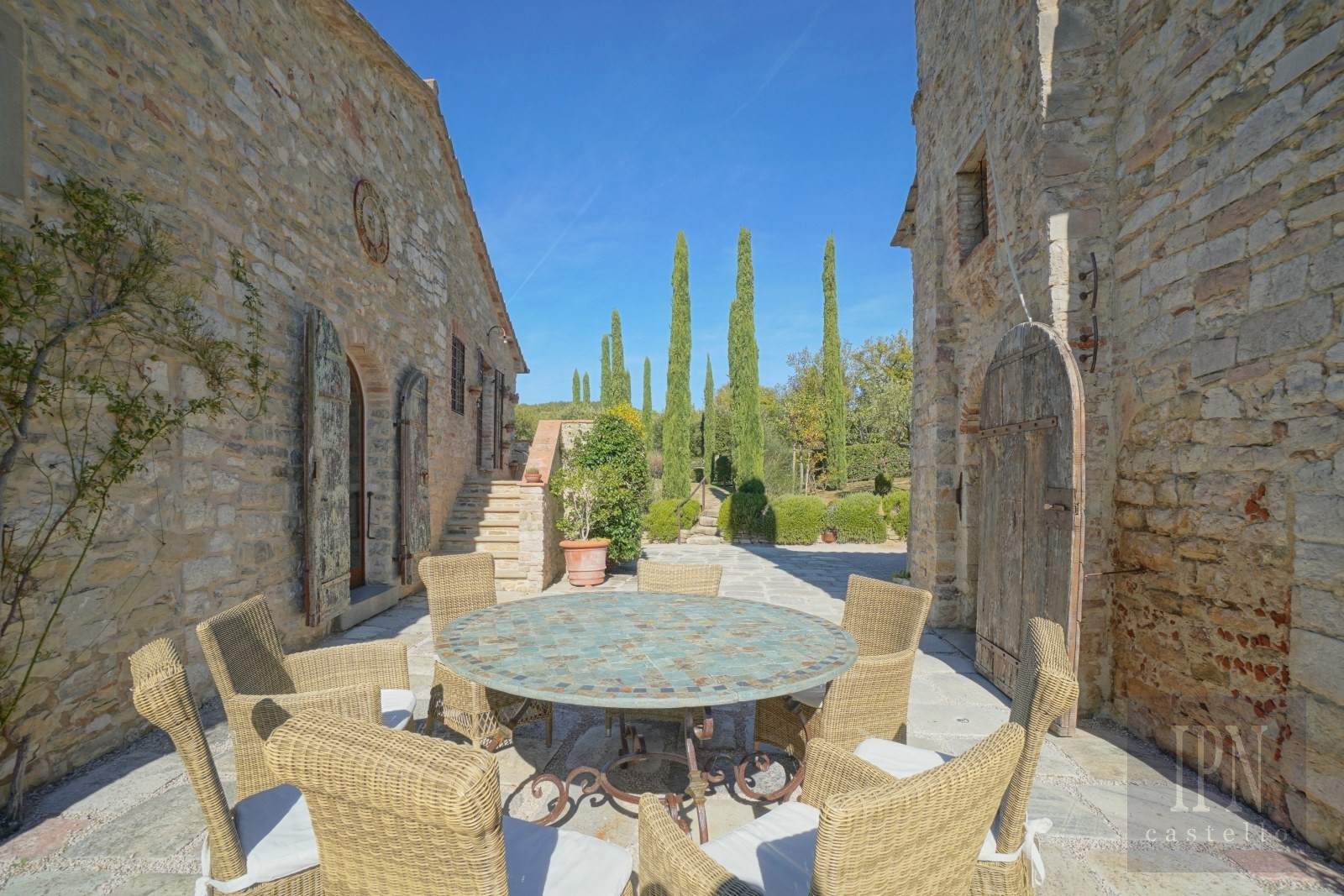 The outdoor areas are equally impressive, covering 3.77 hectares (9.32 acres), this includes a truffle wood of 2.7 hectares (6.67 acres) and landscaped gardens overflowing with lavender, rosemary and olive trees. Stone terraces and pergola-shaded dining areas provide ideal settings for alfresco meals, while a peaceful courtyard with its round table is perfect for an evening aperitivo. A small pond with a fountain adds a tranquil touch, and a vegetable garden supplies fresh produce for the kitchen.
